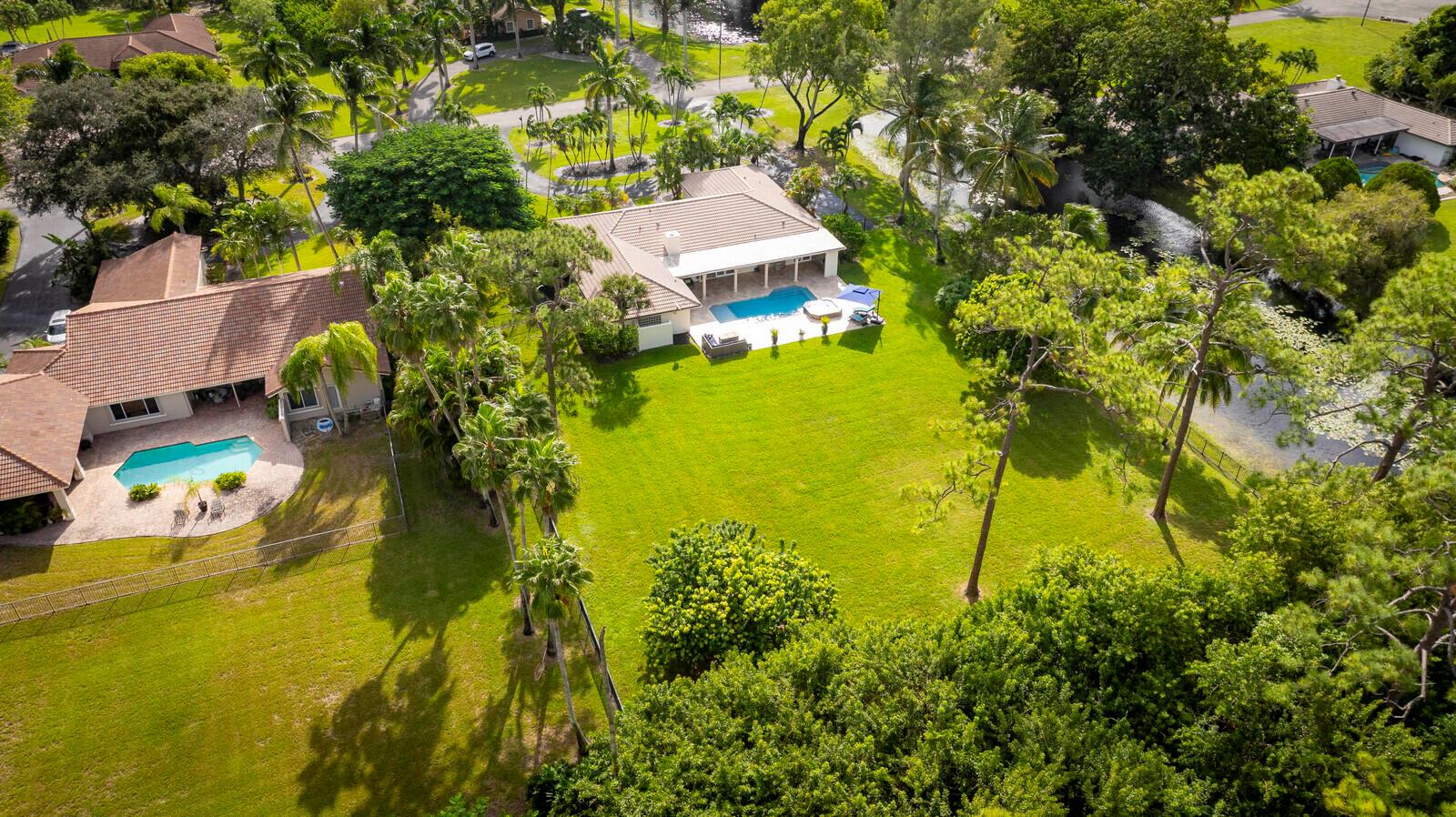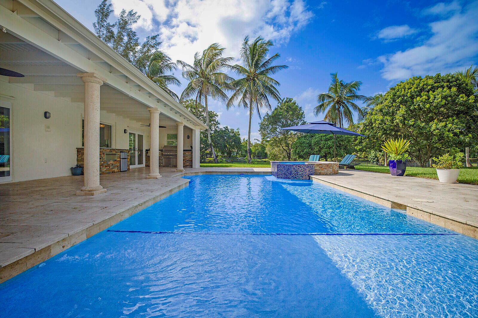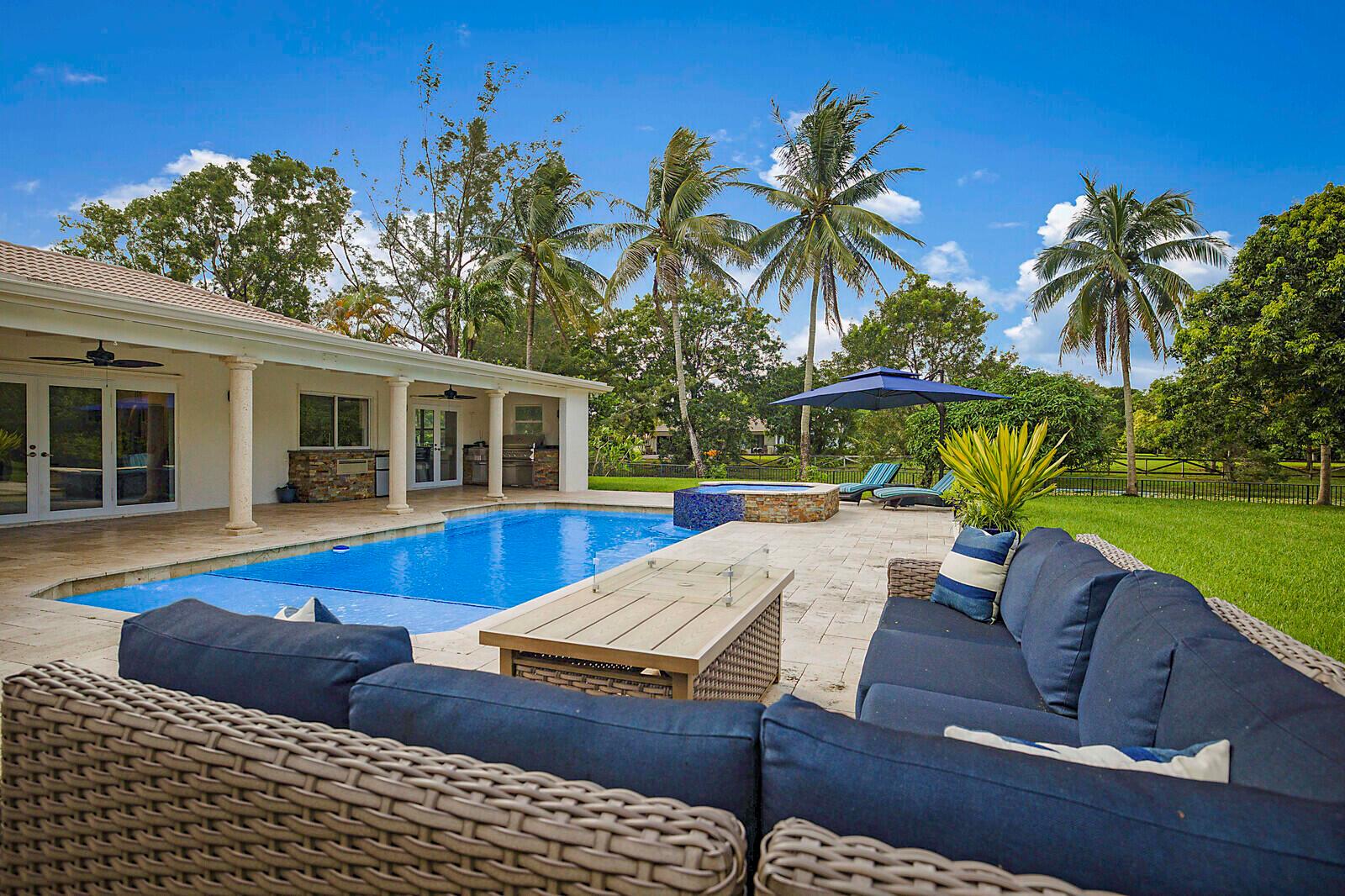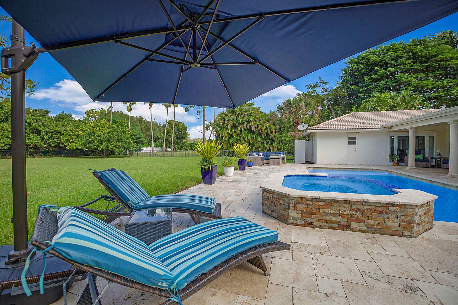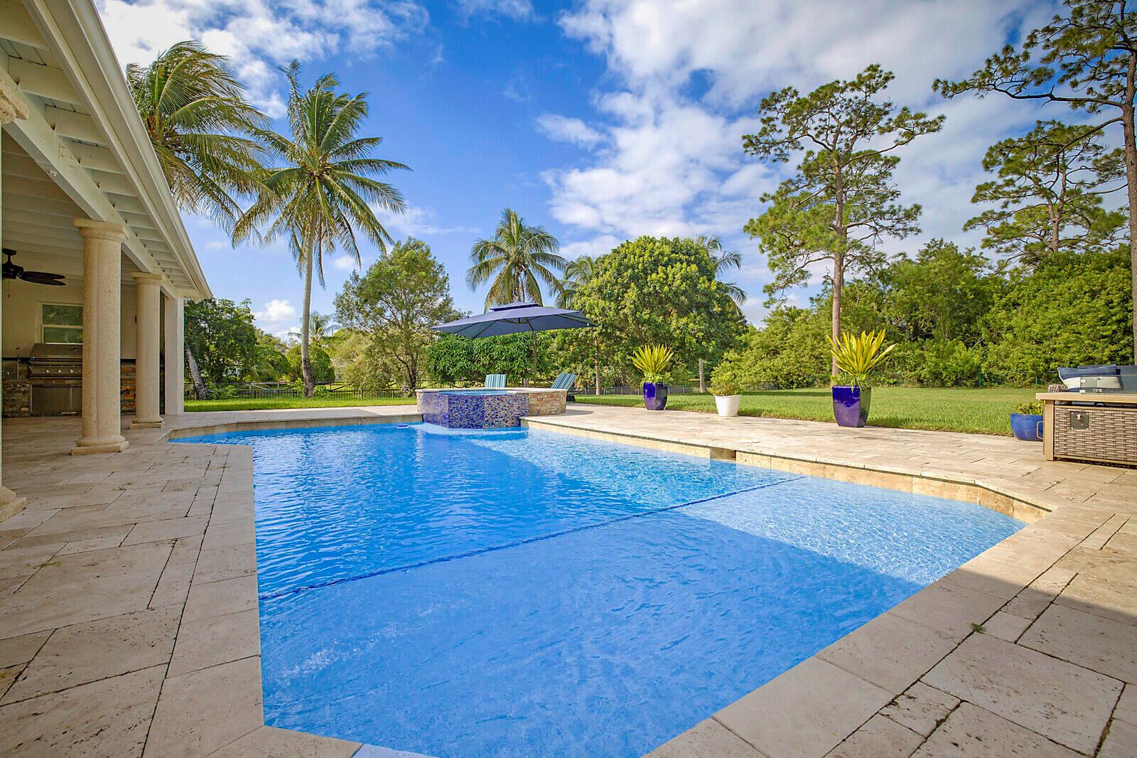 Welcome to Paradise - If you treasure privacy & tranquility, appreciate nature, enjoy entertaining, love cooking, like relaxing in the heated, resort-style pool & spa AND want to be away from the traffic yet close to all the conveniences, THIS IS FOR YOU! The fenced, acre estate with oversized circular drive is sided by rippling water & surrounded by beautiful trees. Enter through custom Mahogany double doors into the foyer adjacent to the formal living & dining rooms. Beyond is the family room w/a fireplace, French Doors & high ceilings. The dream kitchen features white Shaker cabinets, quartz counters, stainless steel appliances, + a center island w/cooktop & contrasting dark blue cabinets. There's also a large pantry, a coffee bar & wine cooler.