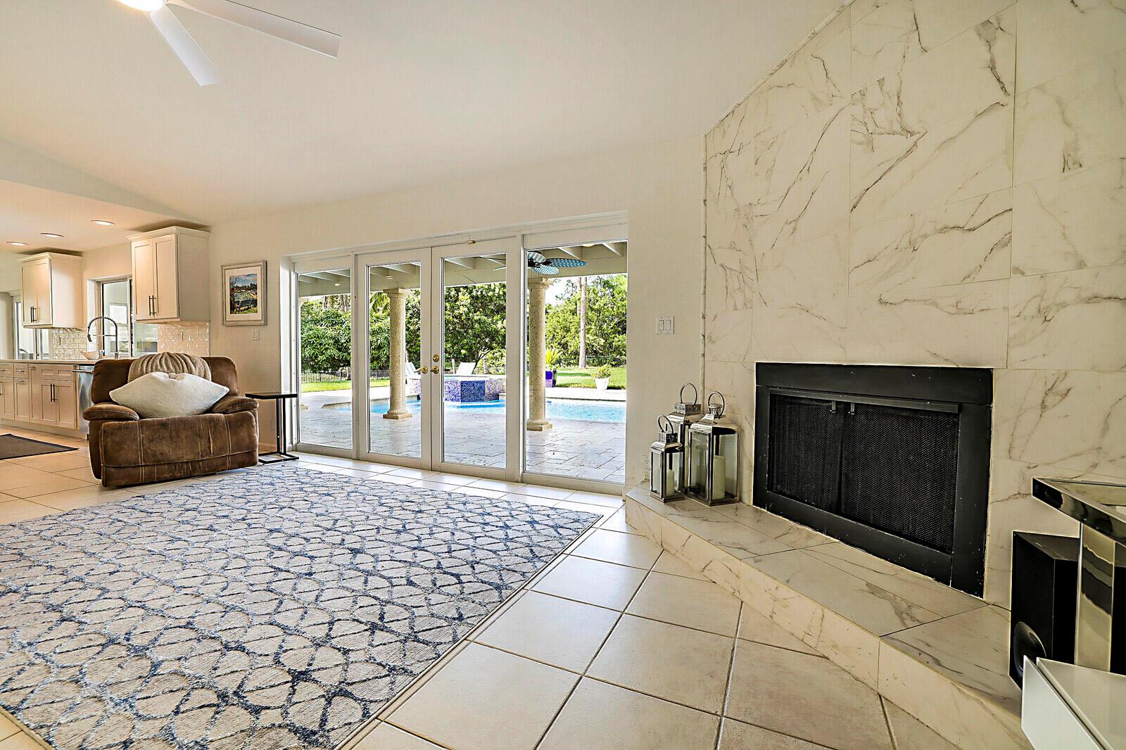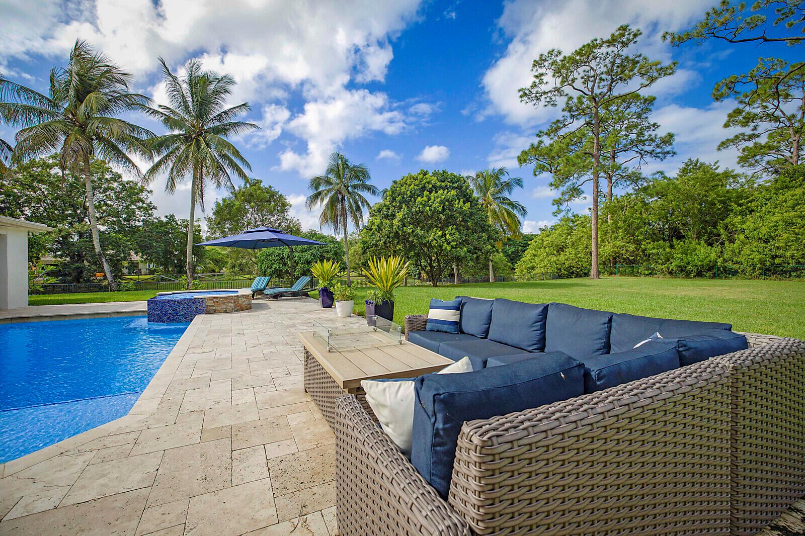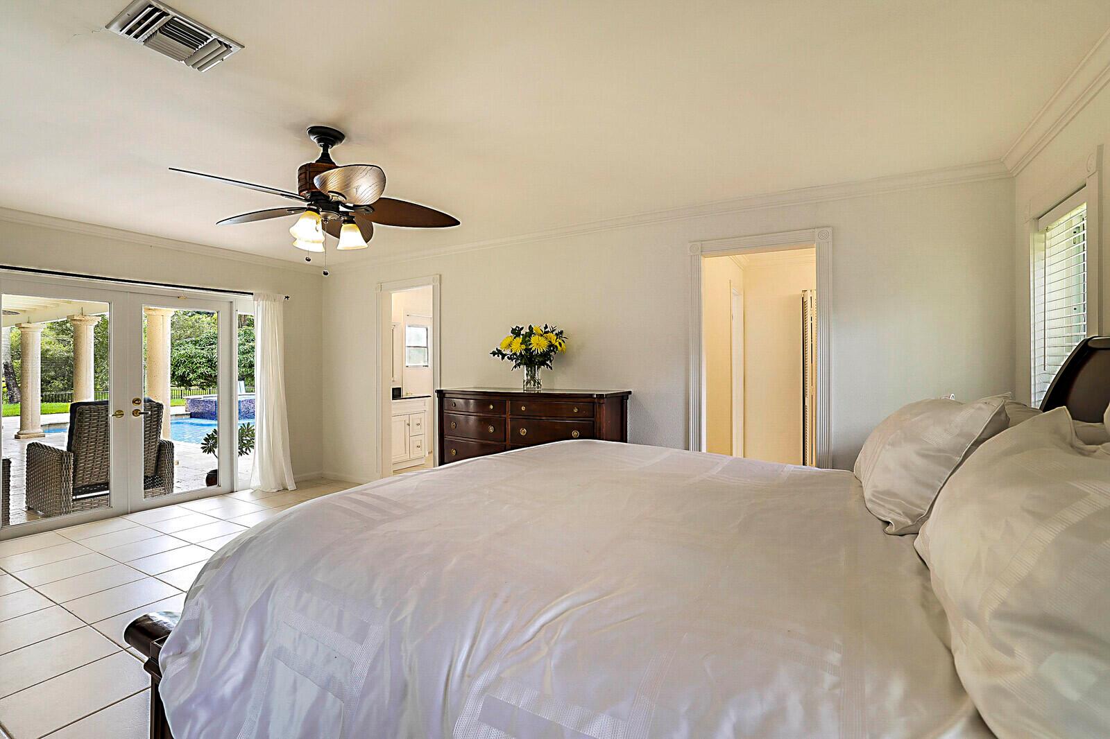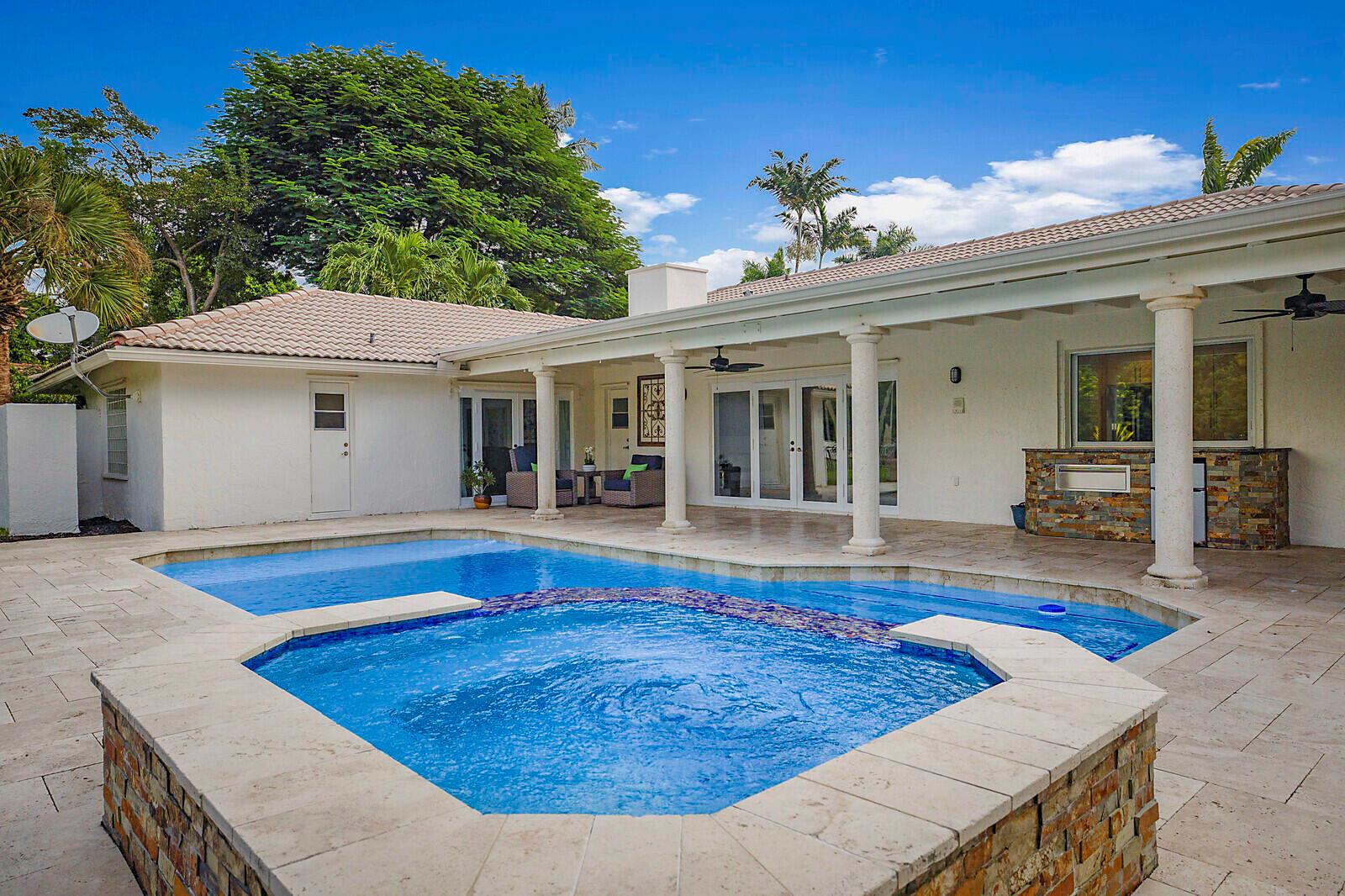 Welcome to Paradise - If you treasure privacy & tranquility, appreciate nature, enjoy entertaining, love cooking, like relaxing in the heated, resort-style pool & spa AND want to be away from the traffic yet close to all the conveniences, THIS IS FOR YOU! The fenced, acre estate with oversized circular drive is sided by rippling water & surrounded by beautiful trees. Enter through custom Mahogany double doors into the foyer adjacent to the formal living & dining rooms. Beyond is the family room w/a fireplace, French Doors & high ceilings. The dream kitchen features white Shaker cabinets, quartz counters, stainless steel appliances, + a center island w/cooktop & contrasting dark blue cabinets. There's also a large pantry, a coffee bar & wine cooler.