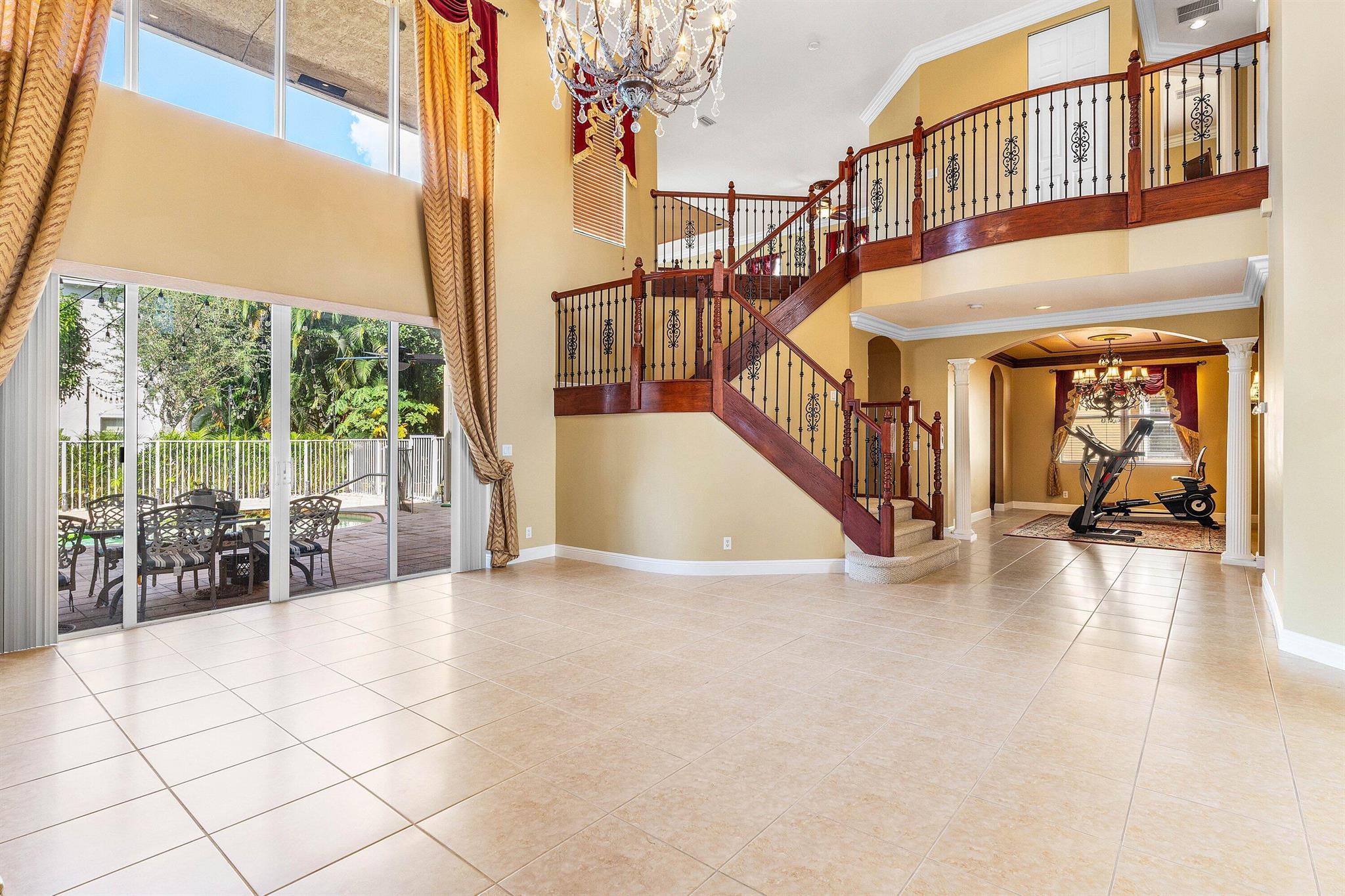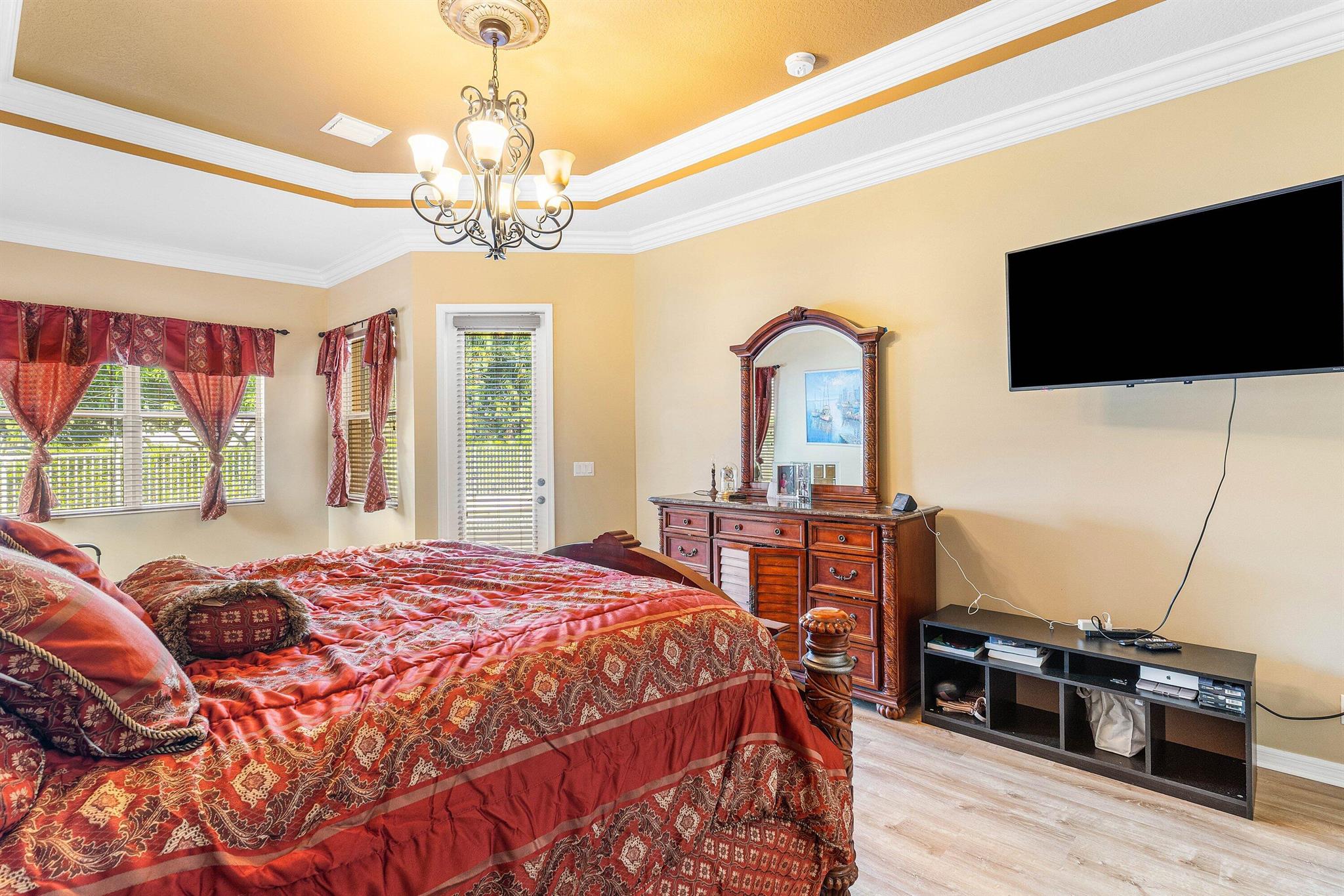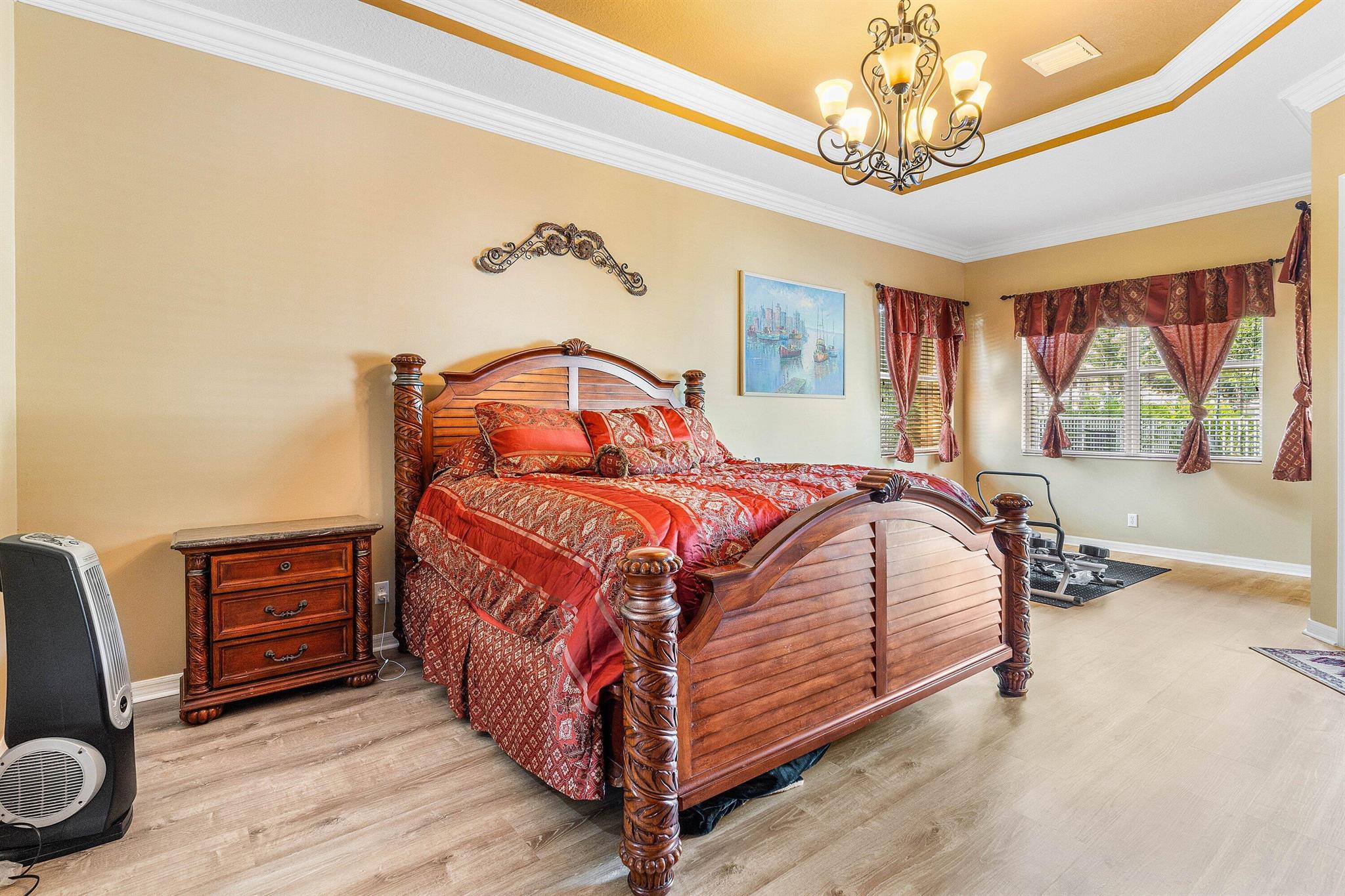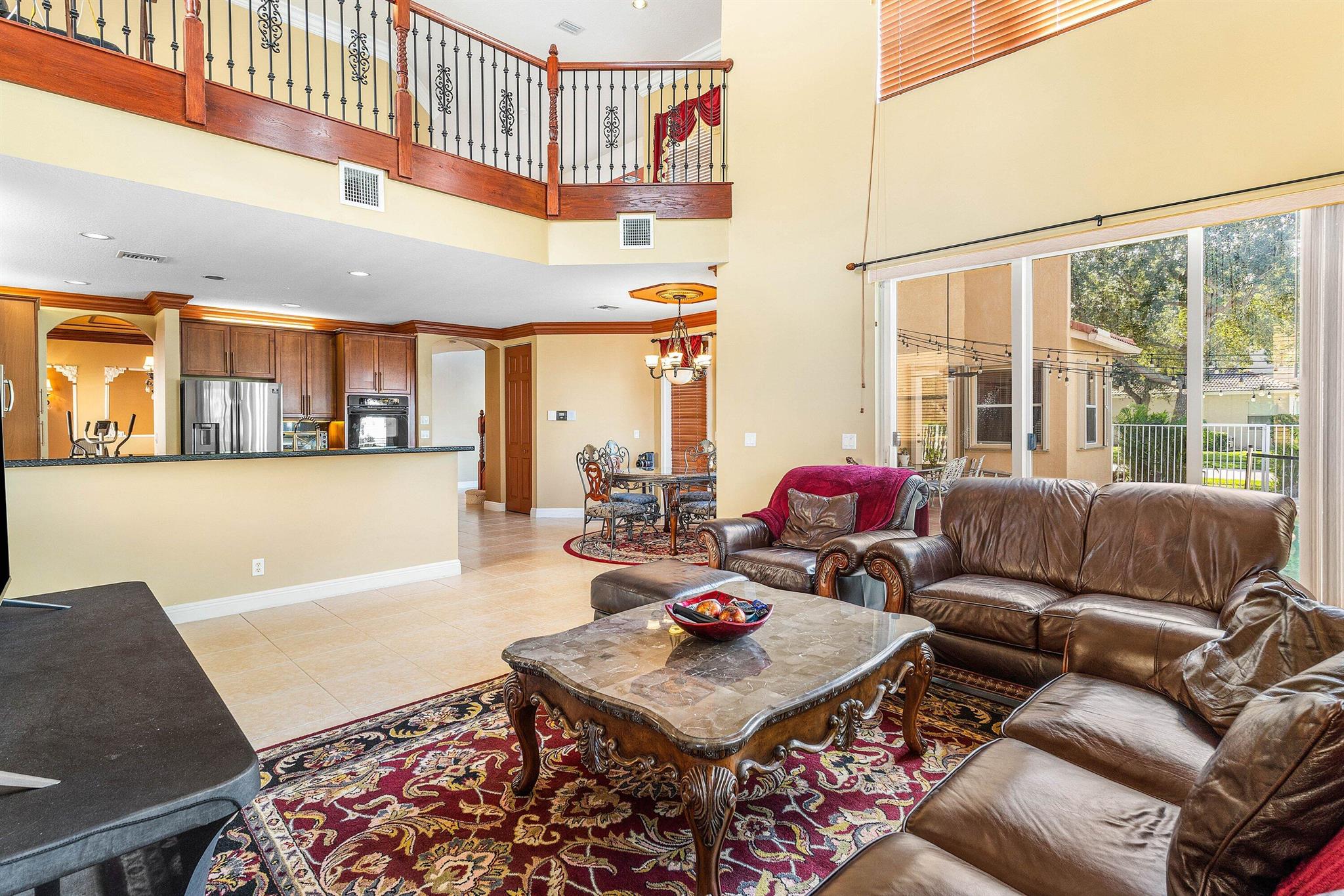 Welcome Home! This immaculately maintained 5-bedroom, 4-bathroom pool home with a 3-car garage is what you've been looking for. Enjoy soaring high ceilings, upgraded crown molding, partial water views, and a spacious 3-way split floor plan. The primary suite, located on the first floor, features a cozy sitting area, his-and-hers walk-in closets, and a luxurious en-suite with dual vanities, a soaking tub, and a separate walk-in shower. An additional full bedroom and bathroom are also conveniently located on the main level as well as a den that could be a 6th bedroom. Upstairs, you'll find a loft, plus 3 additional bedrooms and 2 additional full bathrooms. The kitchen offers newer stainless appliances and beautiful dark granite countertops.