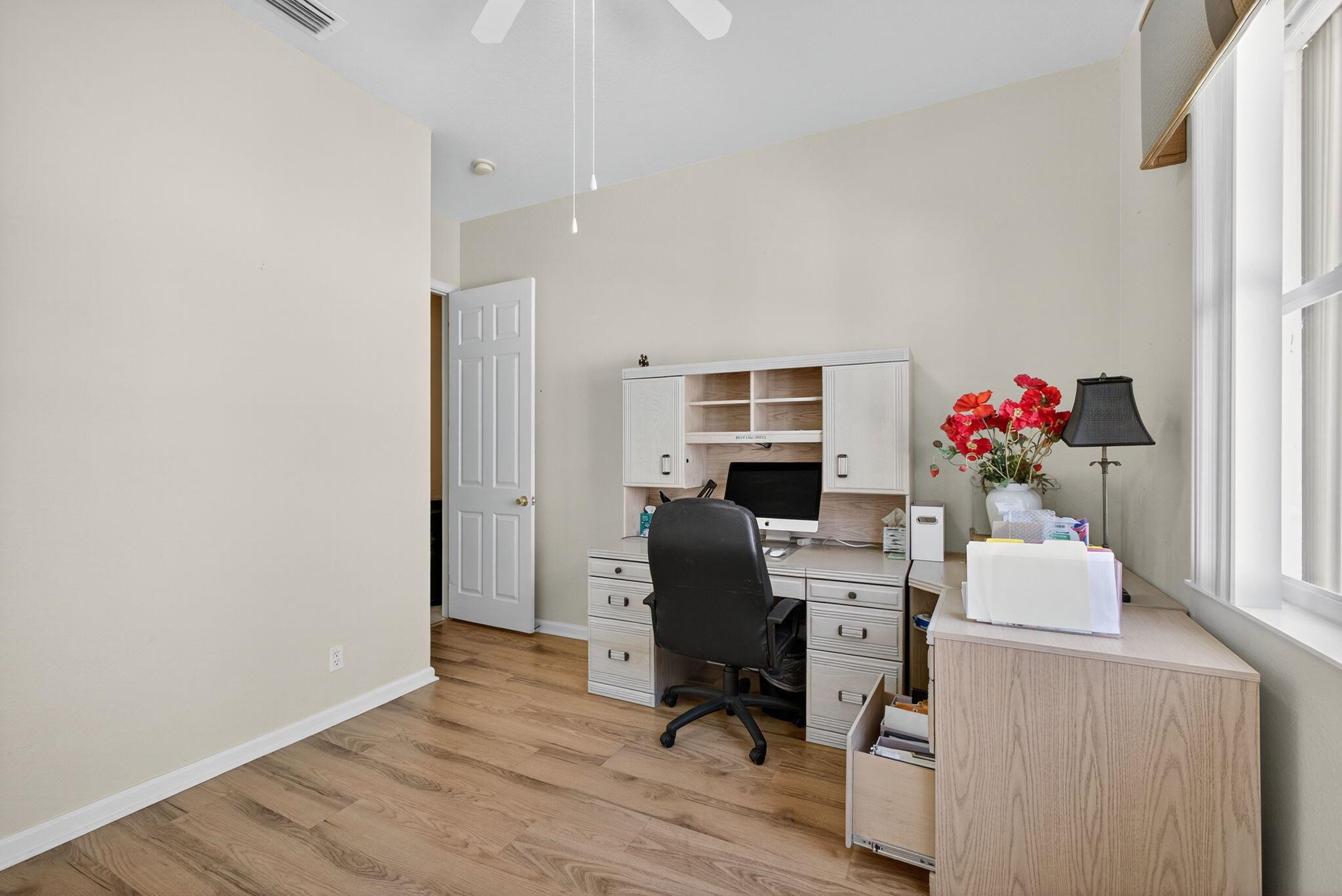 Welcome to your dream waterfront residence, where elegance meets comfort in this stunning 3-bedroom + Den/office, 3-bathroom home. Nestled in a vibrant 55+ resort-style community, this property offers both tranquility and convenience, with proximity to shopping, dining, entertainment, cultural centers, and the airport.As you approach the home, you'll be greeted by a screened double door entry, leading you into a space filled with thoughtful upgrades. The interior boasts exquisite crown molding, chair rails, and laminate flooring throughout all bedrooms. The kitchen is a chef's delight, featuring granite countertops, glass door cabinets, and a reverse osmosis water filtration system. Designer fans, lighting fixtures, and window treatments add a touch of sophistication to every room.