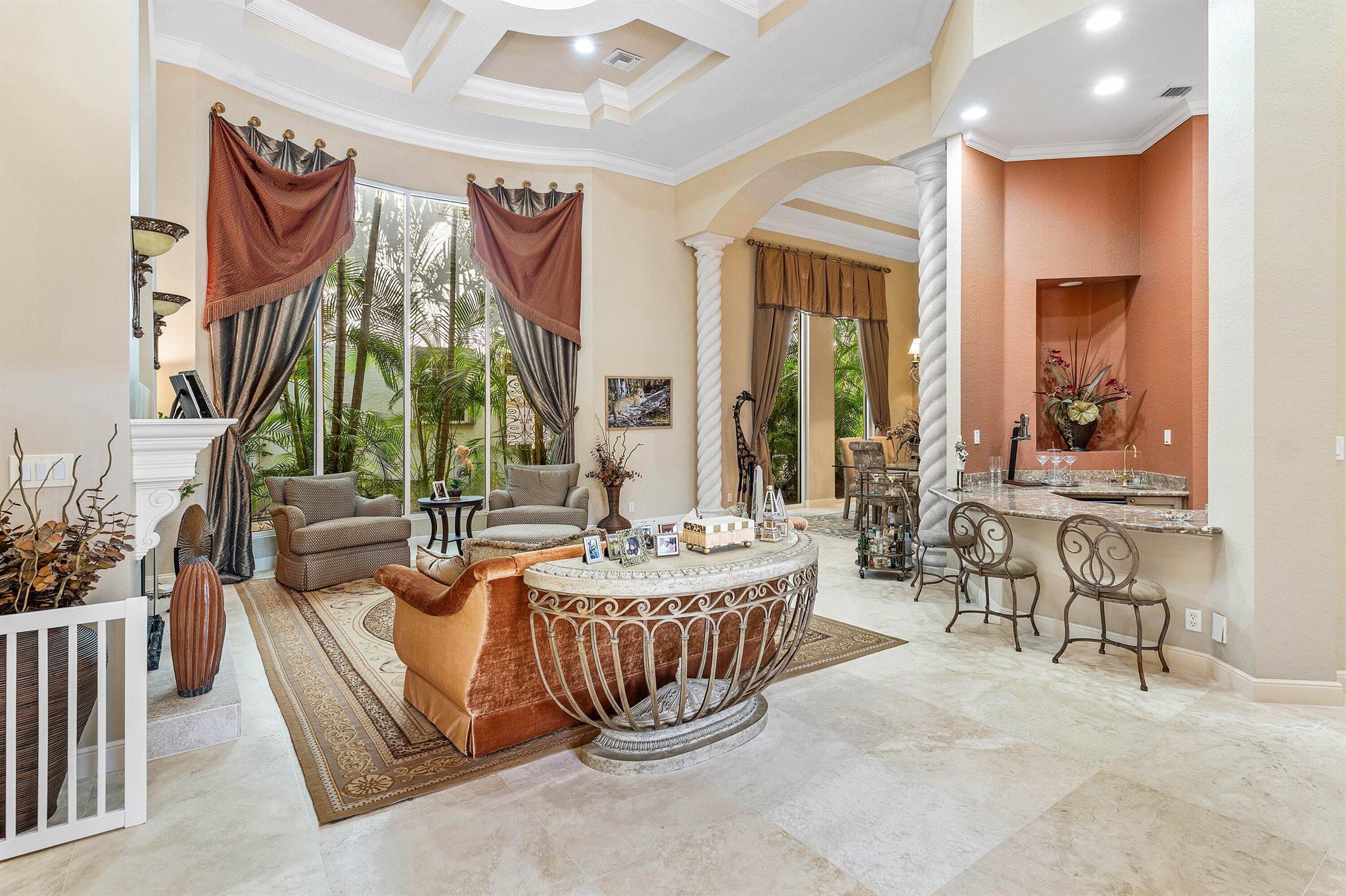 Welcome home to Woodfield Country Club! This elegant one-story courtyard home boasts 3 bedrooms plus an office, 3.5 baths, and a 3-car garage. Features include volume ceilings with crown molding, Saturnia marble floors, and custom window treatments. The living room offers an electric fireplace and wet bar, and the family room includes a built-in entertainment center. Kitchen highlights: maple cabinetry, granite counters, butler's pantry, and breakfast nook. Updates: roof (2022), water heater (2023), pool resurfaced/tiled (2023). Circular driveway, epoxy garage floor, and accordion shutters complete this beautiful home.