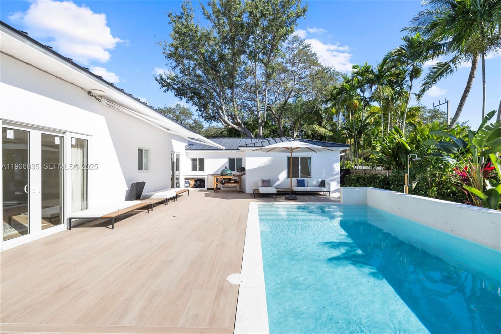 Situated in one of the most sought-after areas of Biscayne Park, this fully renovated (most updates 2024/25) 3 bed, 3-bath home + garage blends timeless mid-century modern architecture with today’s finest finishes, including Porcelanosa tile inside and out. The renovation was completed for owner occupancy, with quality, longevity, and proper workmanship as the priority throughout. All work was completed with permits, and all major components are done including a brand new metal roof with warranty, PVC plumbing, septic tank + drainfield, and impact windows. Sitting on an expansive 11,250 ft lot, enjoy your entertainer's paradise with new heated saltwater pool, deck, retractable electric canopy, abundant green space, and lush landscaping. Primary suite showcases soaring 12-foot ceilings, a private office, and a spacious, custom-designed walk-in closet. The open layout is drenched in natural light and accented w/ custom millwork and bespoke features including wine rack and fridge, entry bench, and library. The new owner has the potential to create a detached in-law quarters. Ideally located less than 1 mile from Miami Country Day.