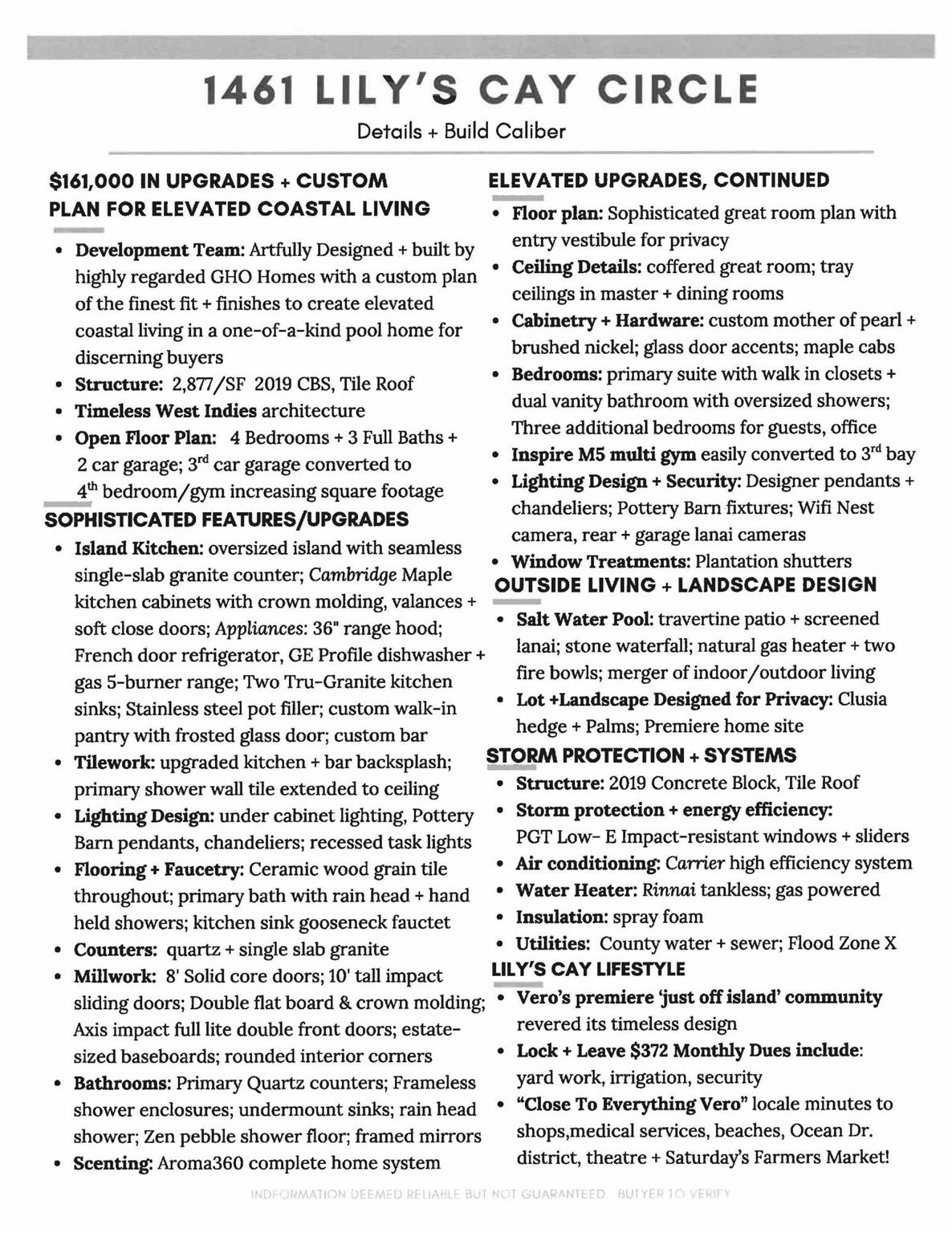 Elevated coastal living in this custom, like-new 2019 4B travertine pool home in coveted Lilya(tm)s Cay w/$160K in upgrades! A unicorn as nearly new at a fraction of replacement! Modern open plan w/ exacting details, fine fit/finish, 12a(tm) island, wine/coffee bar! Luxe primary suite, in use it all plan that offers open concept w/privacy in bedrooms + rear yard. 3rd bay garage converted to bedr 4/gym for storage, studio a" or easily converted back. Premiere a~just off islanda(tm) locale = mainland shops/services 5 mins away, beach/island an easy 10 min for adventures in paradise known as Vero Beach FL!