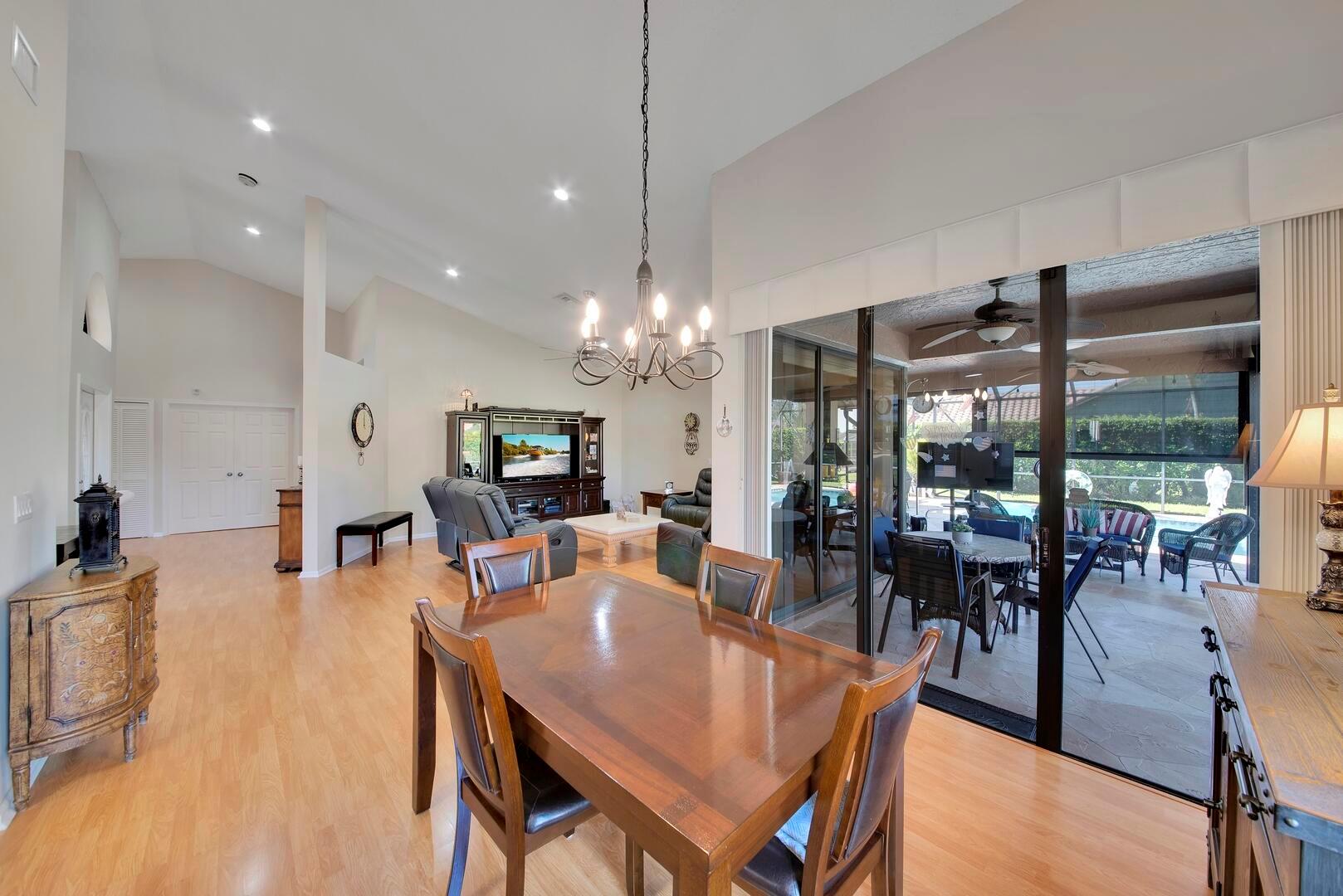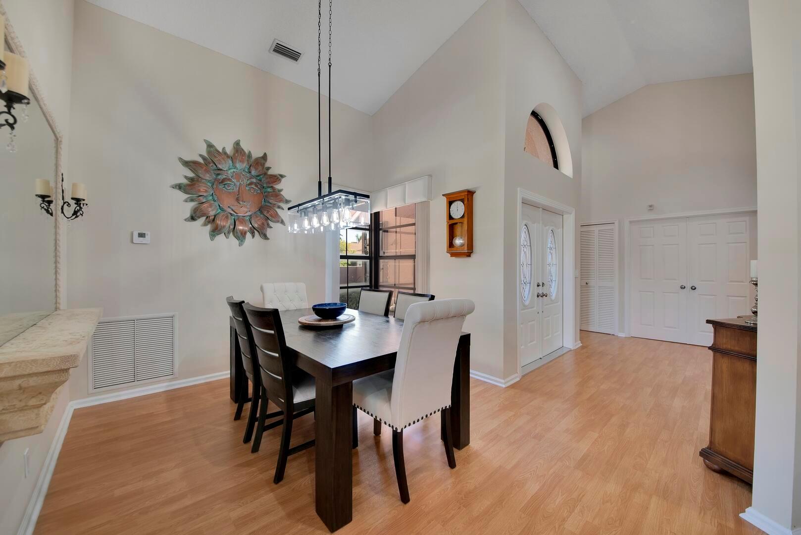 Experience relaxed South Florida living in this beautifully maintained 3-bedroom, 2-bath home located in the desirable Boca Greens community. Perfectly situated on a large corner lot, this residence offers both comfort and functionality with a thoughtful layout and elegant details throughout. Step through the double-door entrance into spacious living areas featuring vaulted ceilings, smooth walls, and high-hat lighting that enhance the home's bright, open feel. The formal dining area and living room provide the perfect setting for entertaining or everyday relaxation. The dream kitchen boasts wood cabinetry, granite countertops, a tiled backsplash, above-cabinet lighting, stainless steel appliances, a peninsula with seating, pantry, and a cozy breakfast nook overlooking the pool area.