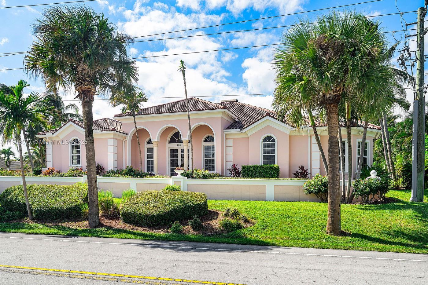 Single story home directly across the street from the Atlantic Ocean in Juno Beach. This beautifully built and maintained home on a corner lot offers custom design, high ceilings, large room, plenty of light, 3 bedrooms, 4.5 baths, large kitchen with breakfast area overlooking courtyard pool. Split plan with large primary suite with his and her baths. Guest bedrooms are on-suite. Marble floors and custom moldings throughout. Large laundry room with cabinets for extra storage. Walk acroos the street via a direct path to the ocean. Vacant, Easy to see.