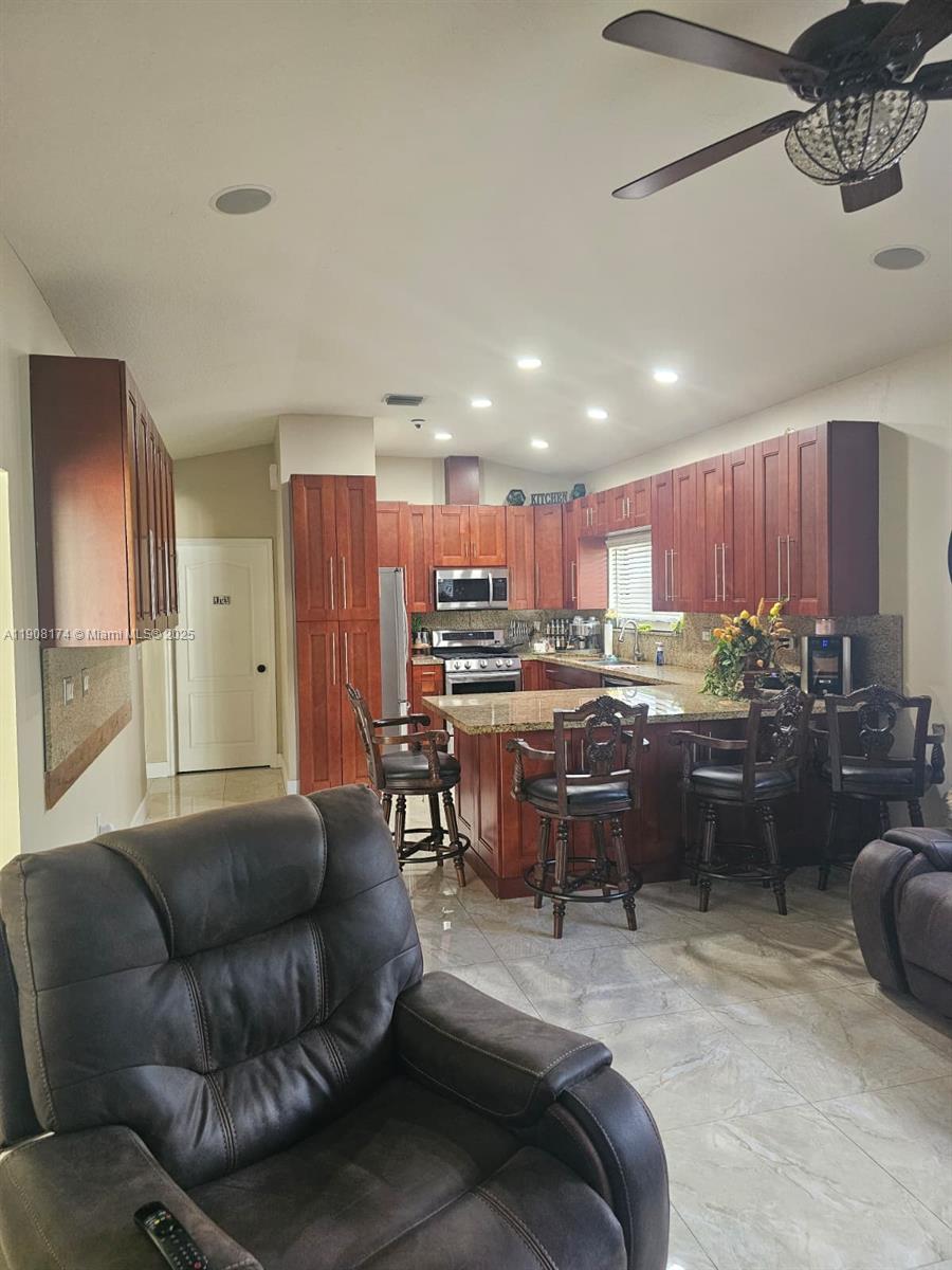 This stunning home has been extensively upgraded with high-end finishes throughout! Features include brand new tile flooring, a complete privacy fence, and a freshly resurfaced pool perfect for entertaining. Enjoy peace of mind with full-impact windows, doors, and sliding doors, a whole-house generator, and a newer A/C system. The kitchen and bathrooms have been beautifully remodeled, complemented by new stainless steel appliances. Truly move-in ready—every detail has been thoughtfully updated for modern comfort and style! Embrace South Florida living at its finest with a side yard designed to fit a 30 foot boat and an additional garden area flourishing with guava, mango, and palm trees, the ideal balance of convenience and natural beauty.