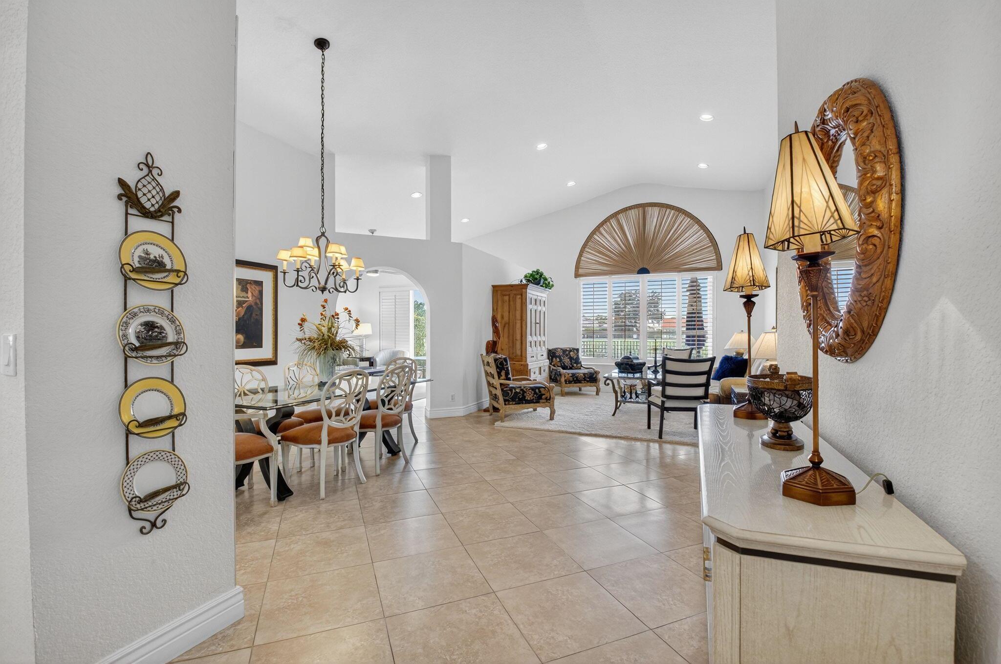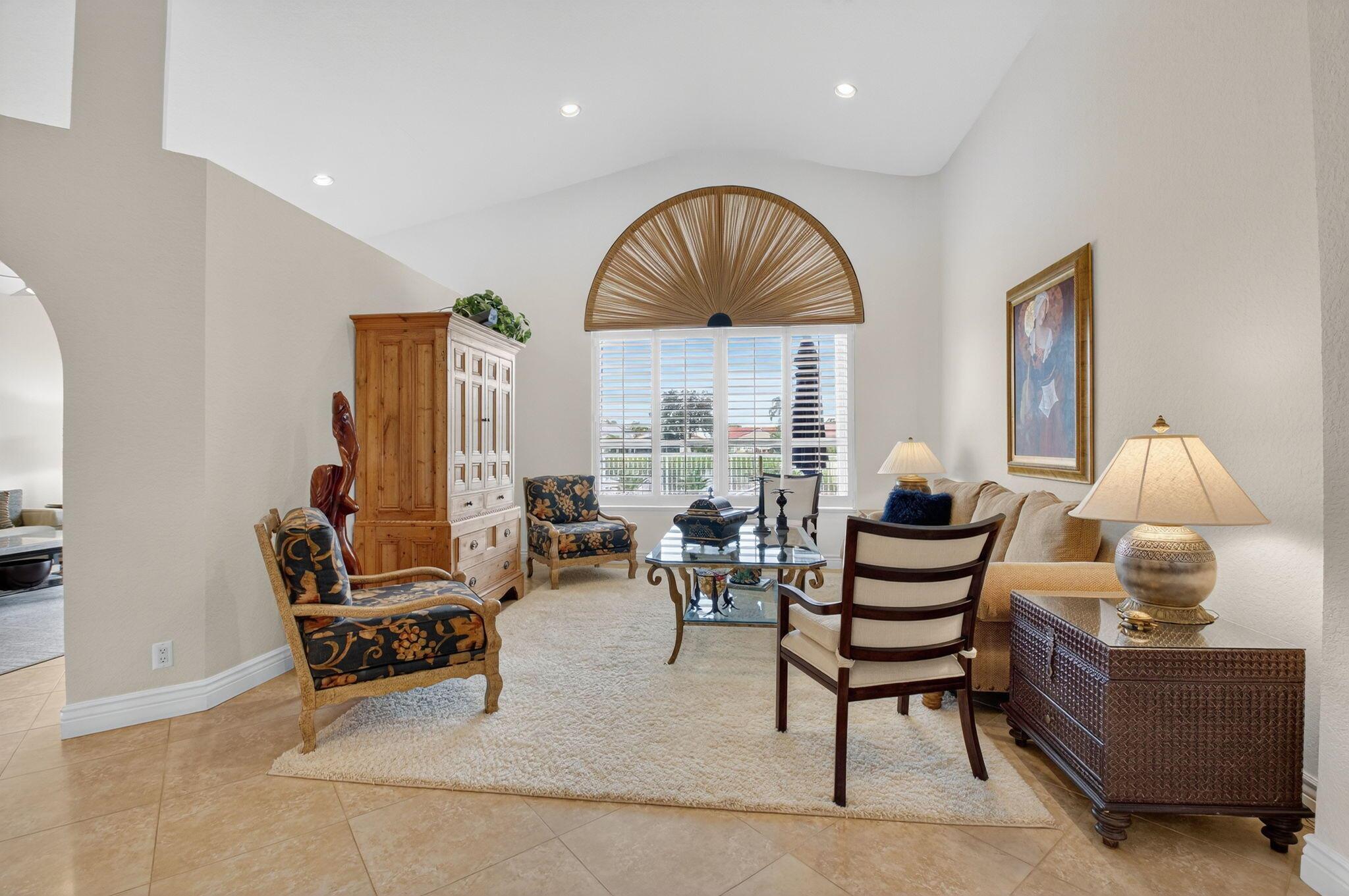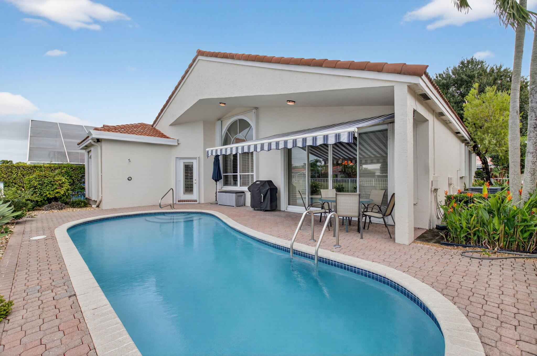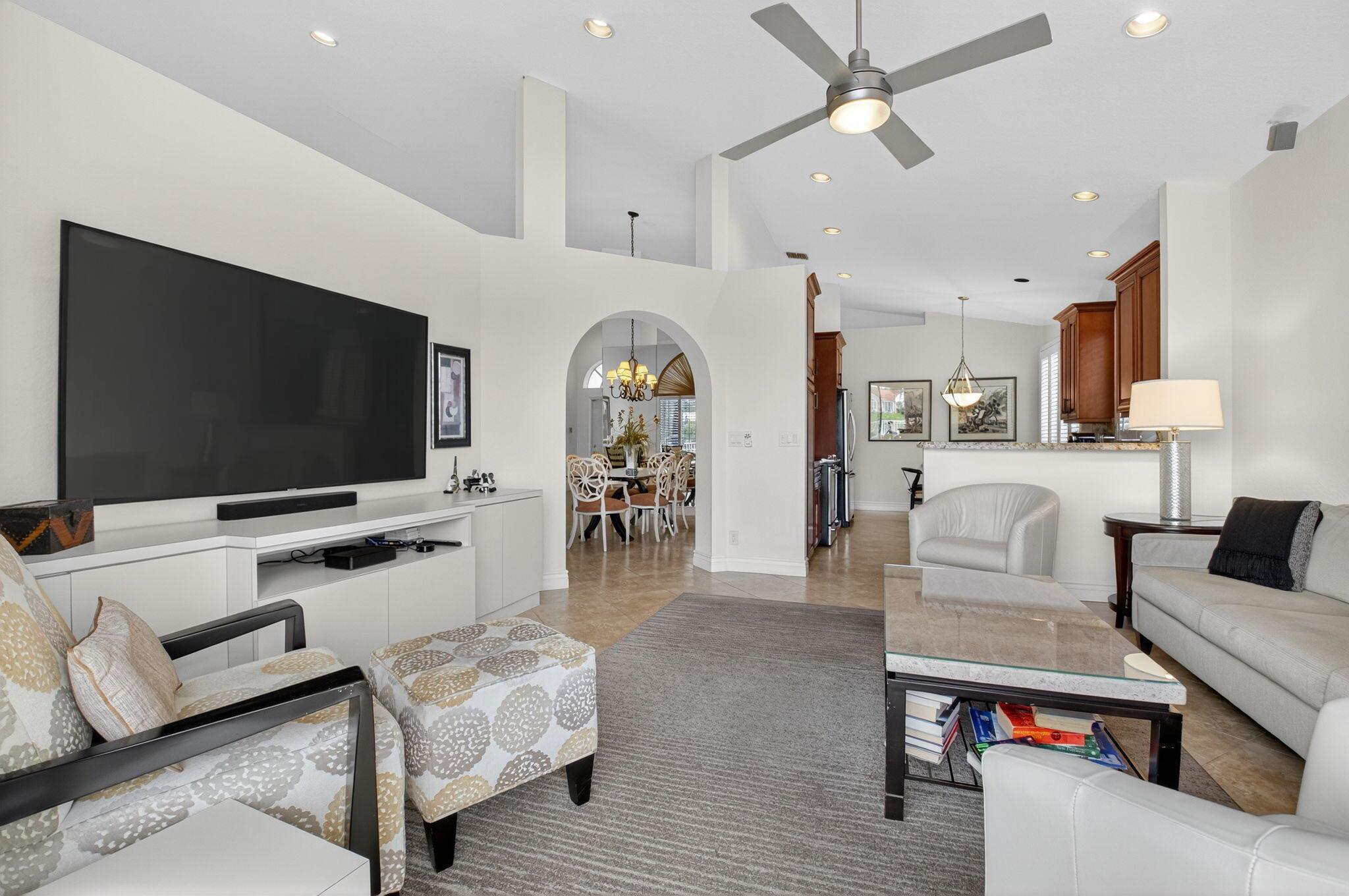Enjoy the incredible sunset views overlooking the expansive lake & fountain from your own tropical paradise. The patio area has an electric awning which makes it so enjoyable on those bright days. Spotless and meticulously maintained 1-story home with 3 bedrooms & 2.1 baths plus 2-car garage. Ceramic tile and engineered wood flooring. Plantation shutters throughout. The kitchen has real wood cabinetry, granite counters & a full granite backsplash. The master bedroom features fully outfitted closets & en suite bath with dual sinks. New central vacuum system & new washer & dryer. Hurricane resistant garage door & accordion shutters.