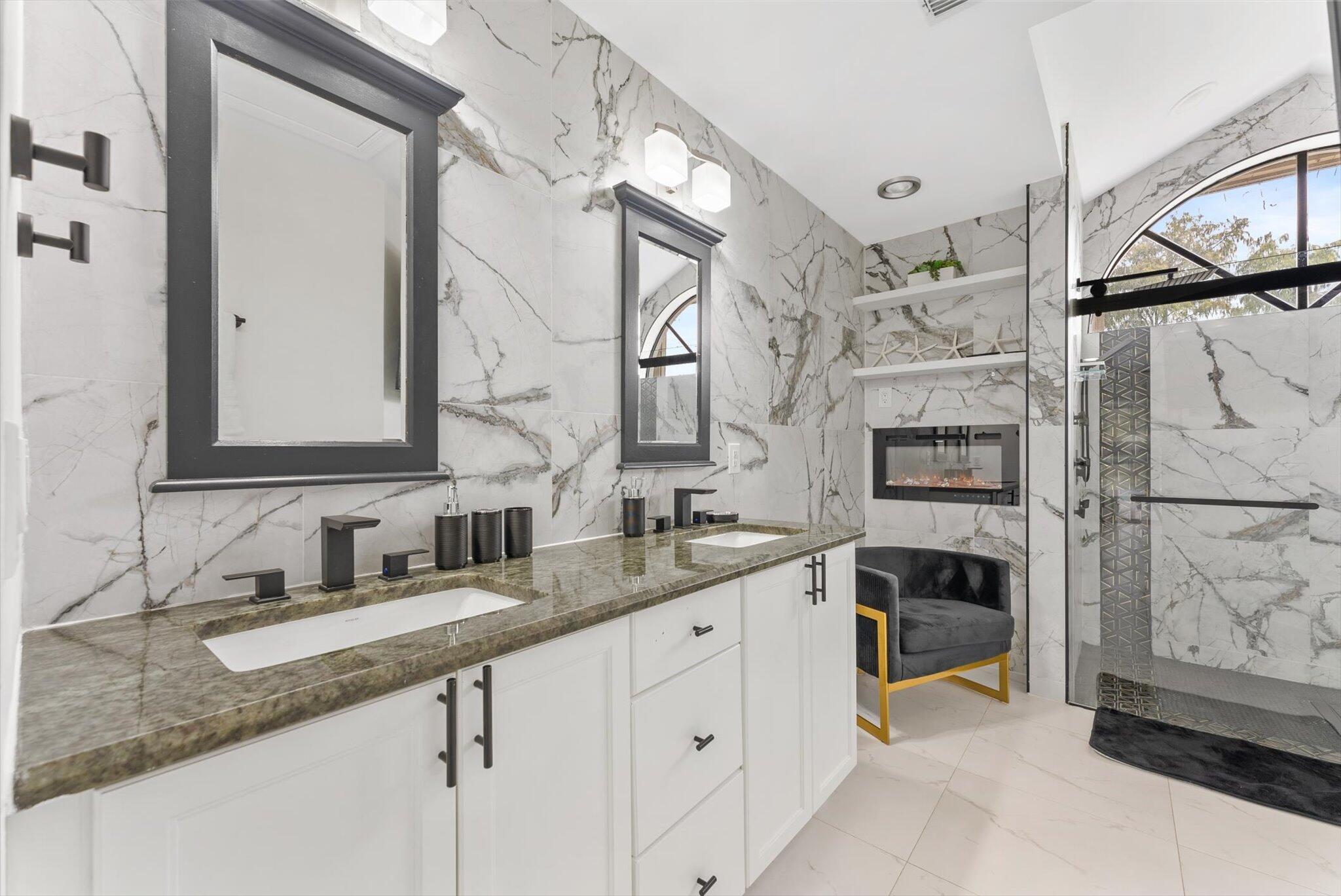 Beautifully renovated, Contemporary 5-bedroom single-story home with serene lake views from front to back! Modern open kitchen w/ chef's island, natural stone counters, stainless appliances, luxury cooktop with vent hood. Spacious family room and Dinning area connected to kitchen. Modern LED lighting. Primary suite with large walk-in shower, electric fireplace for luxury spa vibes and custom walk in closet. Expansive screened patio with heated pool, covered lanai, and full summer kitchen. Beyond the screen pool is a large backyard overlooking panoramic lake views. Accordion storm shutters on the windows, auto sprinkler system. Split floorplan. AC 2022, WH 2023, New pool heater, whole-home Generac. Move right in and feel like you're on vacation. Furniture is negotiable. No HOA.