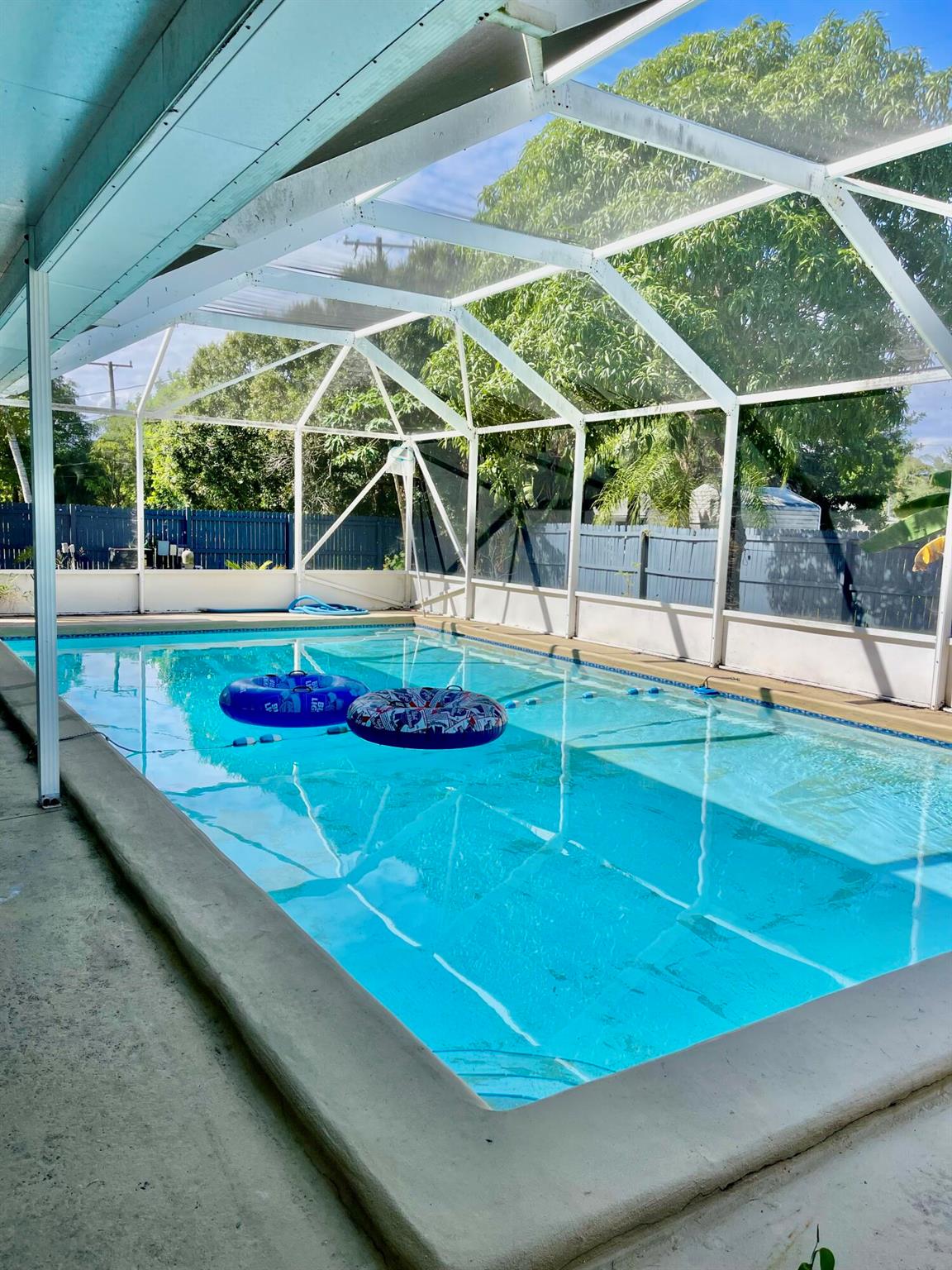 Welcome to Pinewood, where comfort meets convenience just minutes from the beaches and vibrant Downtown Fort Pierce. This spacious 3BR/2BA pool home sits on a double corner lot and features a newer metal roof, updated bathrooms, and new tile flooring throughout. The large kitchen offers generous cabinet space and flows into an oversized family room with an electric fireplace--perfect for gatherings. Enjoy a 16x30 lanai-covered pool surrounded by mature fruit trees and a 2-car split garage with rear access--ideal for hobbyists, storage, or recreational toys. Easy access to I-95 and the Turnpike for commuting.