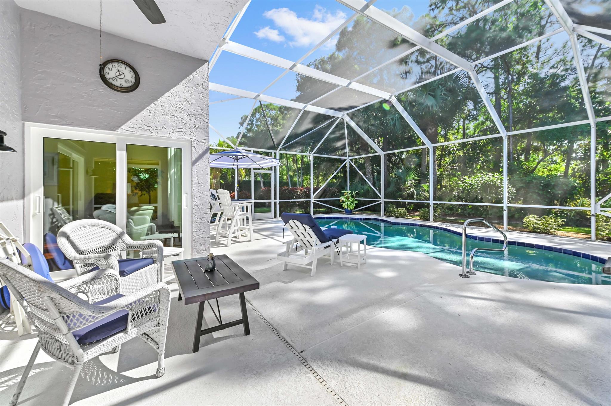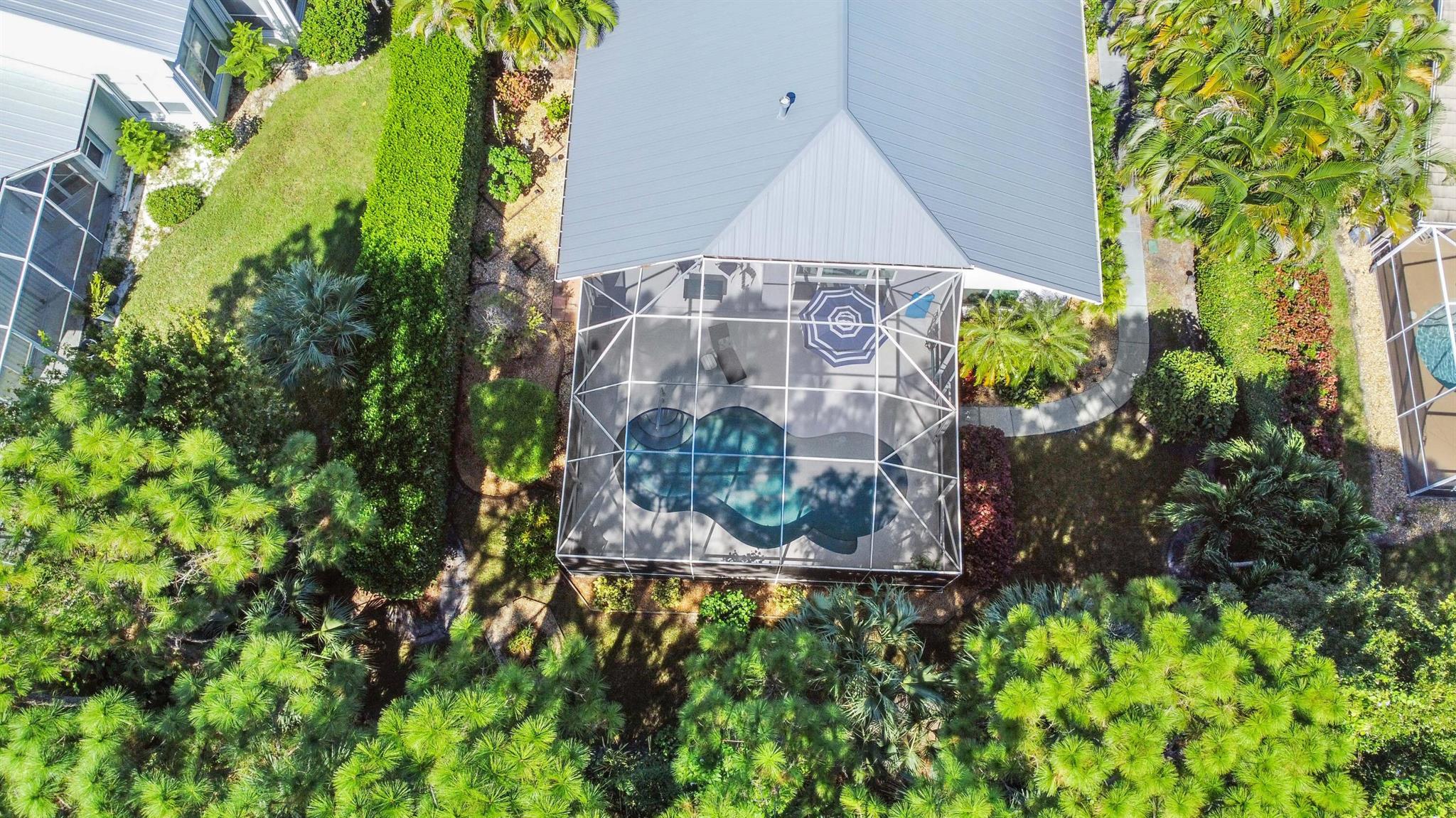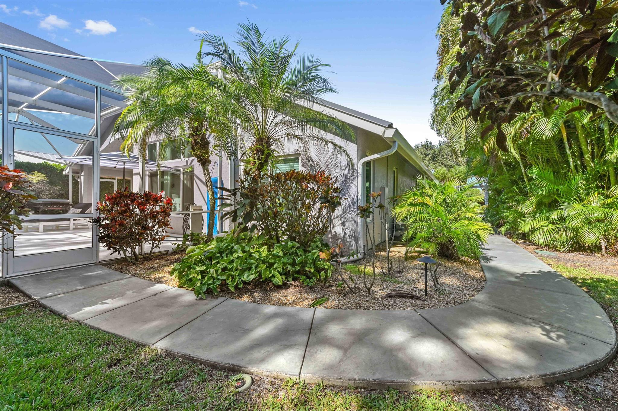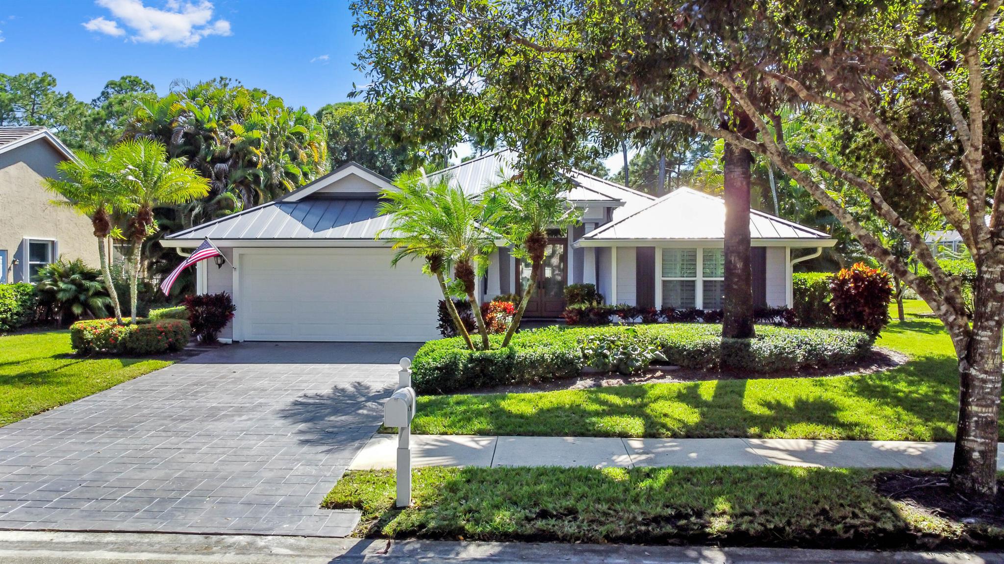 Prepare to be captivated by this stunning, custom-designed single-family pool home, perfectly situated in a desirable Hobe Sound community. The residence exudes charming curb appeal, featuring a modern metal roof, impact windows, a stylish stamped concrete driveway, and lush tropical landscaping that frames the home. The covered front entry features elegant columns and handsome double entry doors with unique dark hardware, setting a sophisticated tone from the moment you arrive.