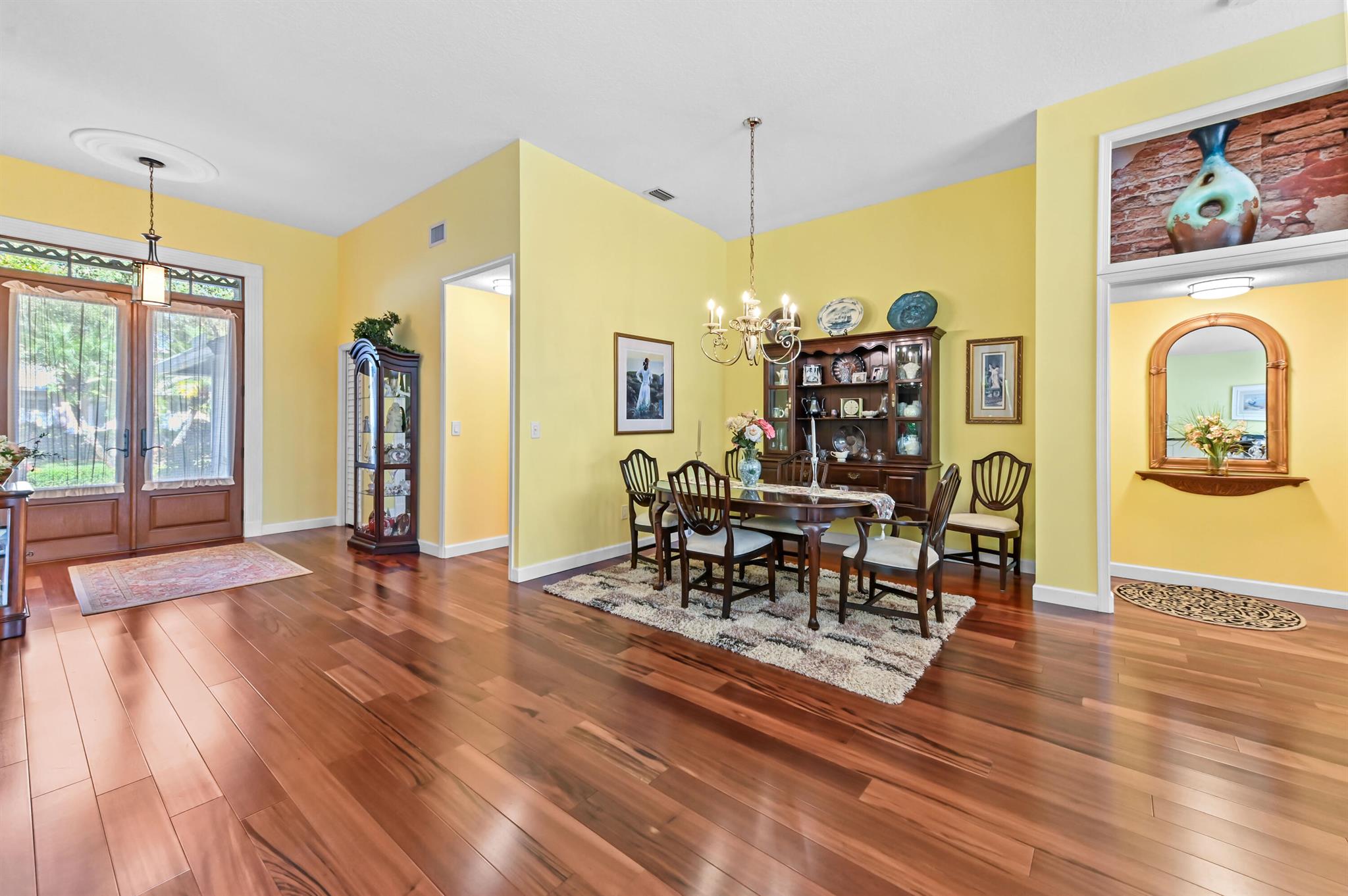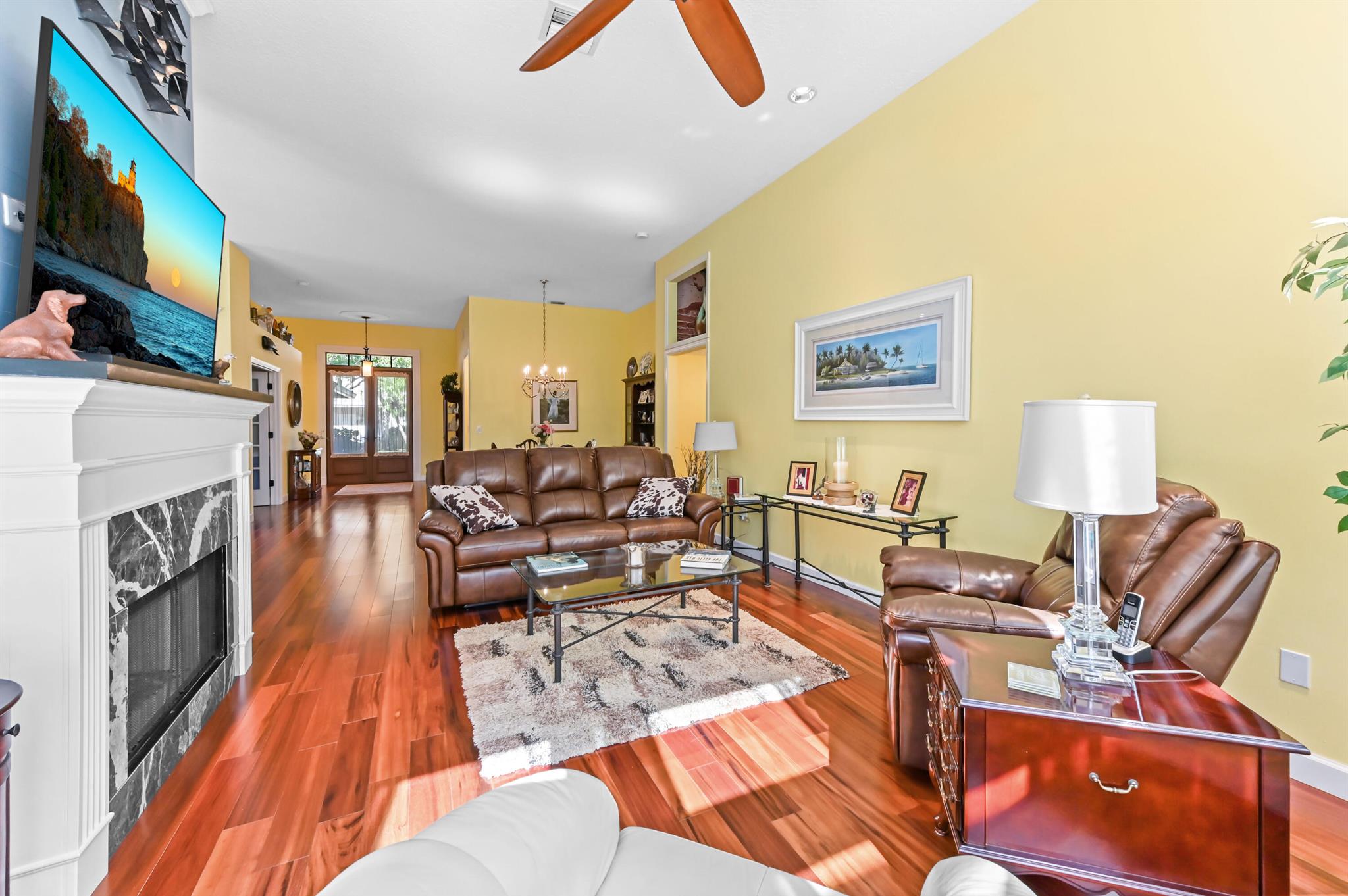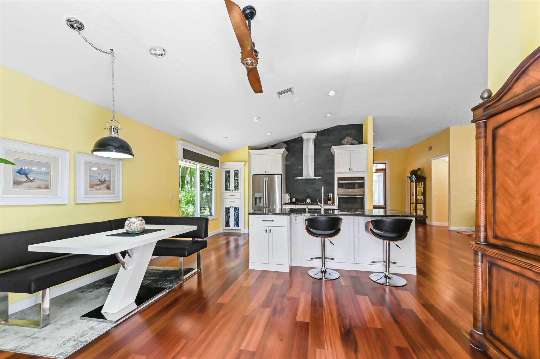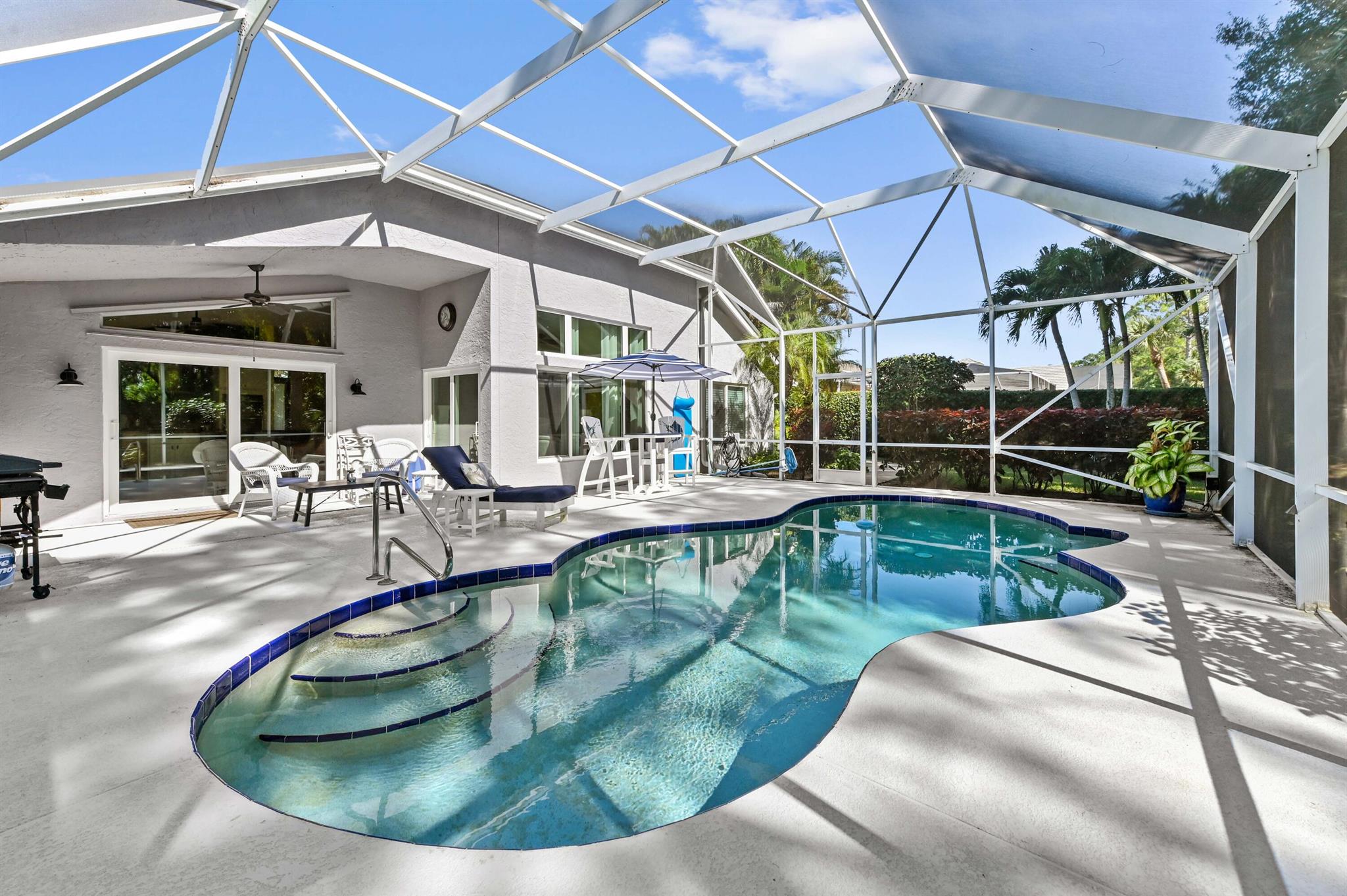 Prepare to be captivated by this stunning, custom-designed single-family pool home, perfectly situated in a desirable Hobe Sound community. The residence exudes charming curb appeal, featuring a modern metal roof, impact windows, a stylish stamped concrete driveway, and lush tropical landscaping that frames the home. The covered front entry features elegant columns and handsome double entry doors with unique dark hardware, setting a sophisticated tone from the moment you arrive.