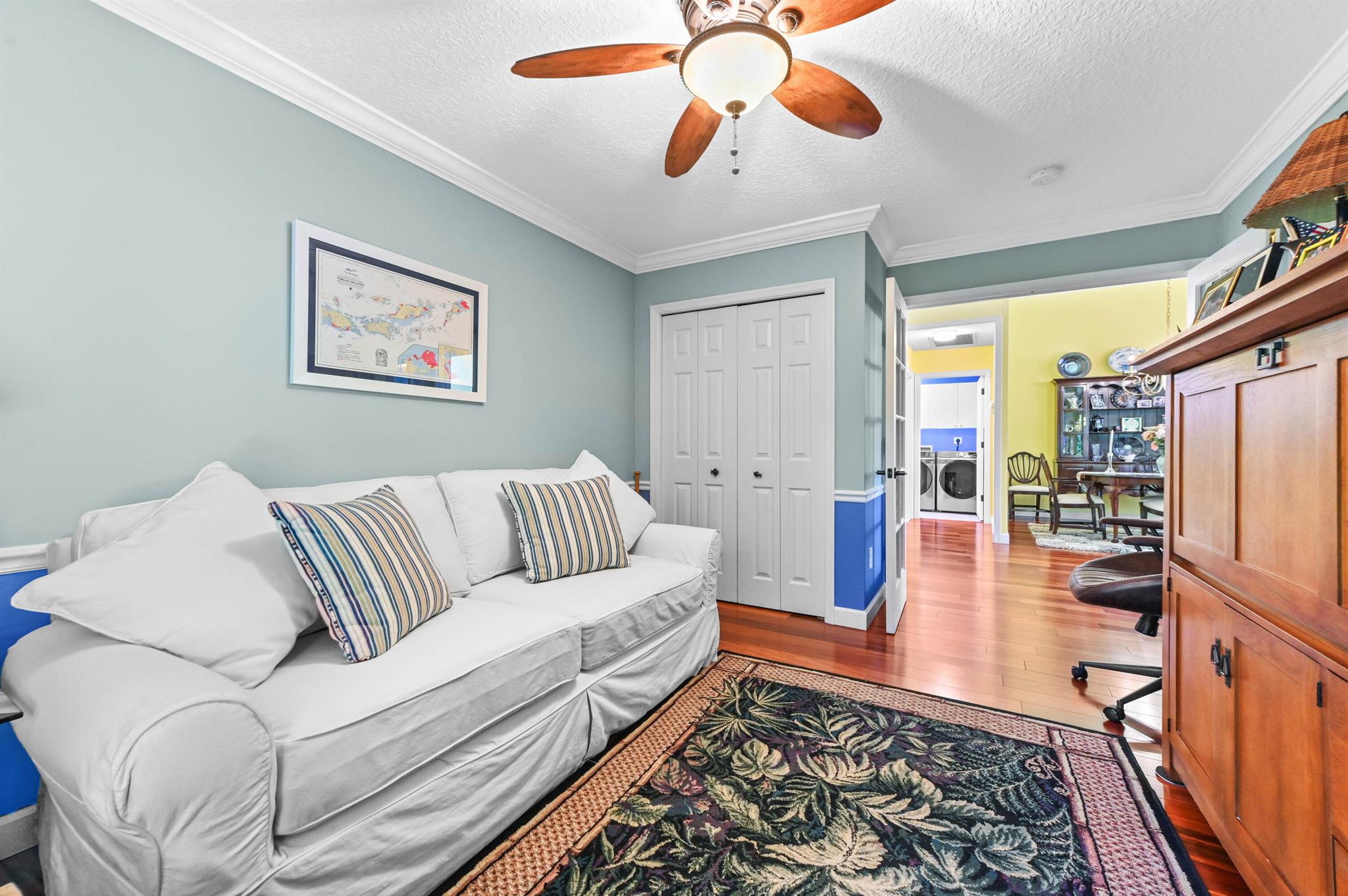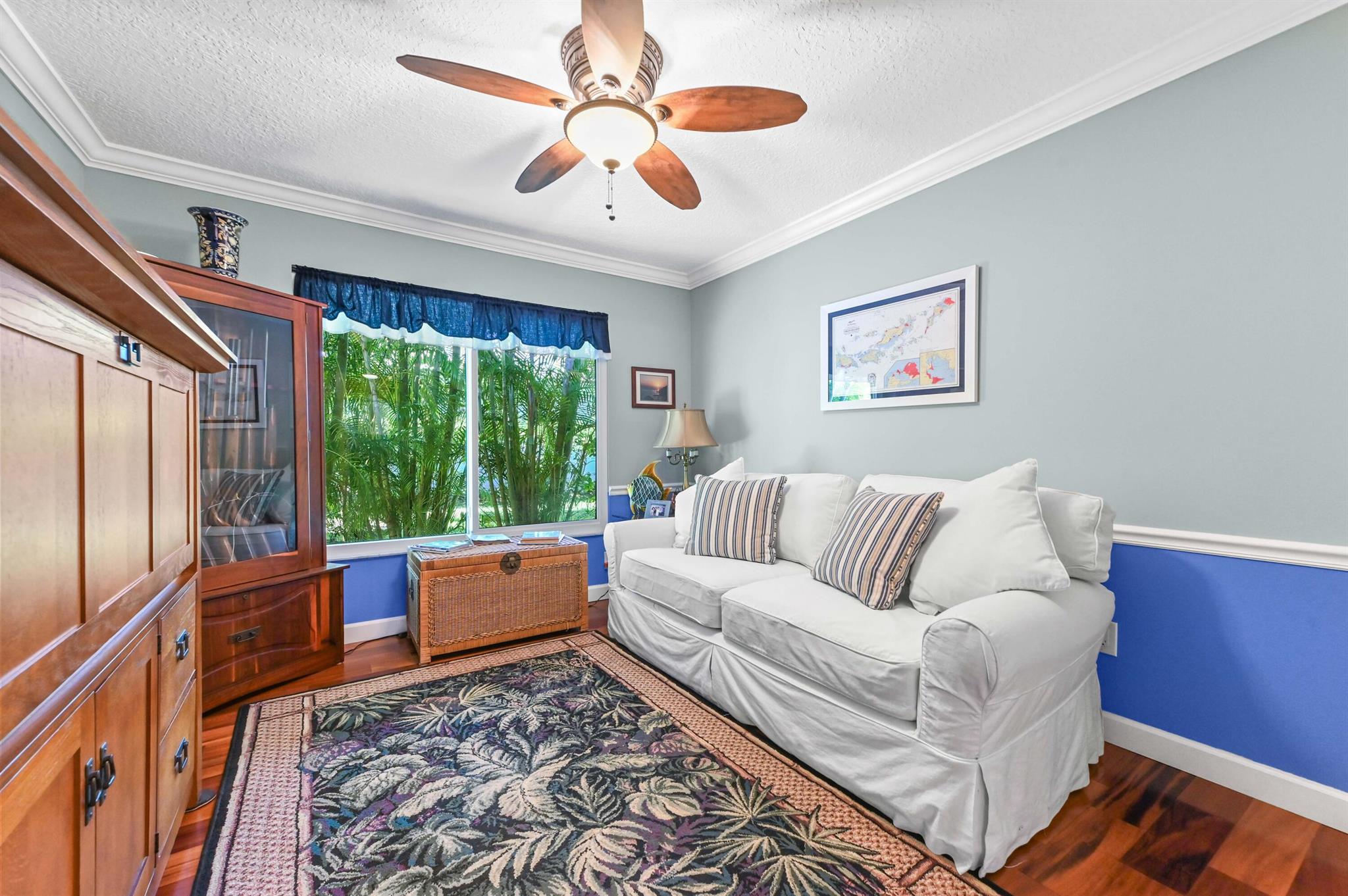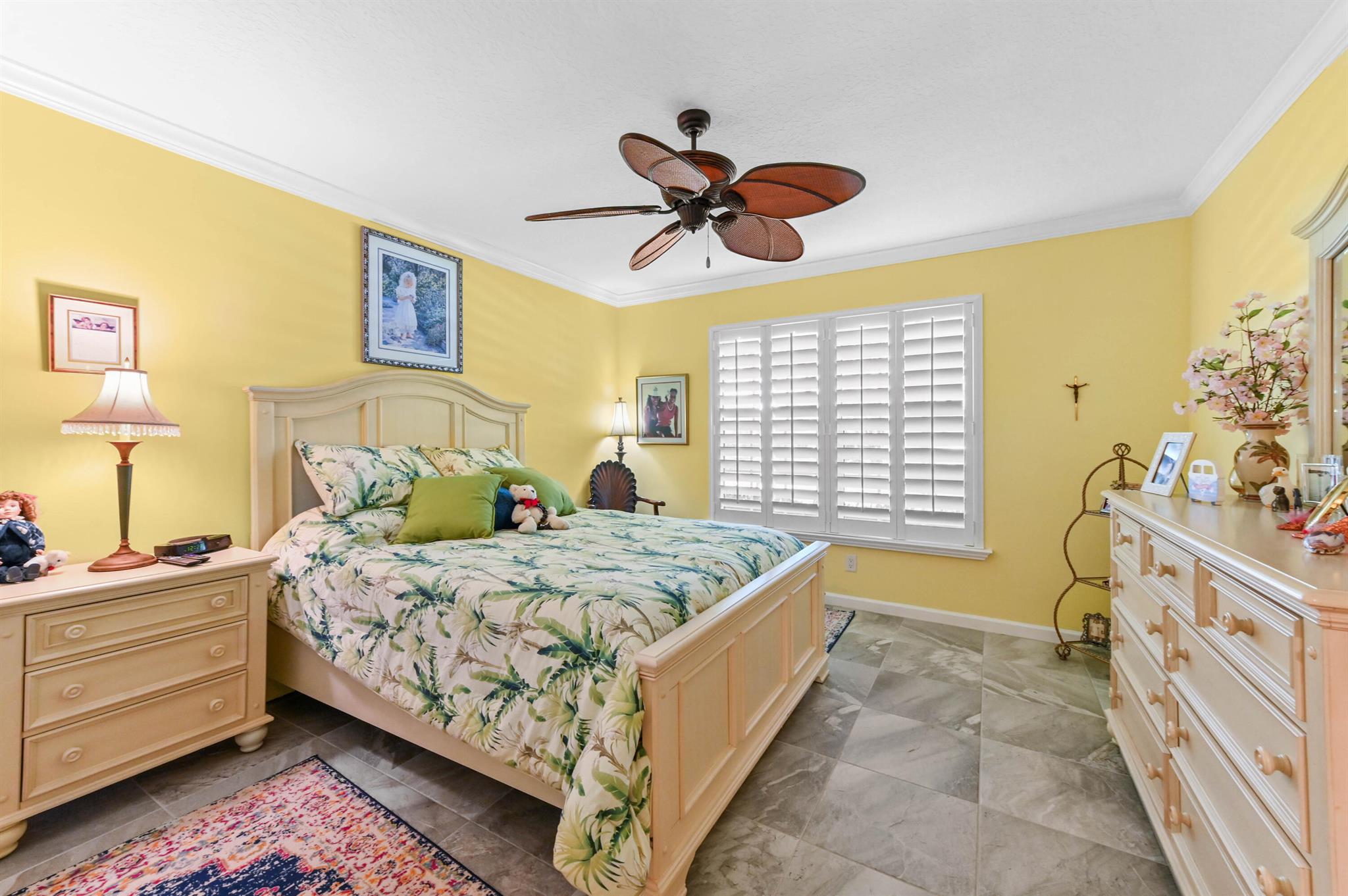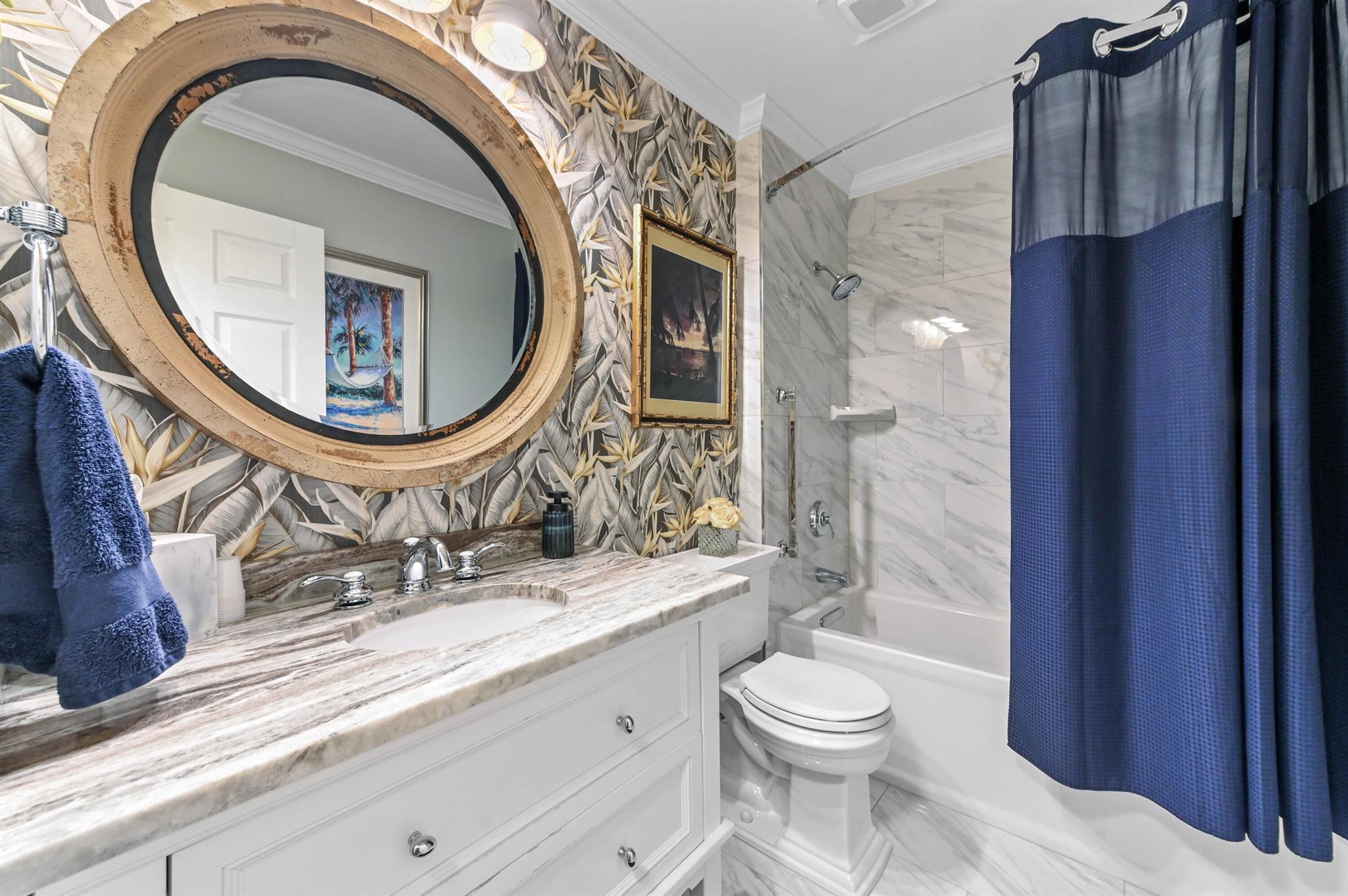 Prepare to be captivated by this stunning, custom-designed single-family pool home, perfectly situated in a desirable Hobe Sound community. The residence exudes charming curb appeal, featuring a modern metal roof, impact windows, a stylish stamped concrete driveway, and lush tropical landscaping that frames the home. The covered front entry features elegant columns and handsome double entry doors with unique dark hardware, setting a sophisticated tone from the moment you arrive.
