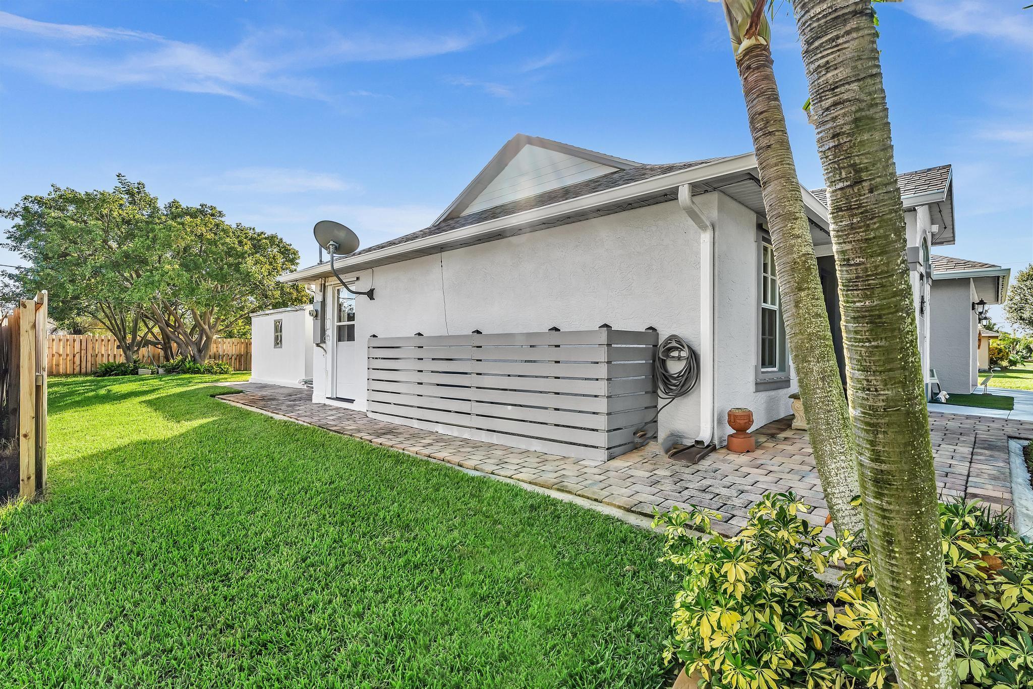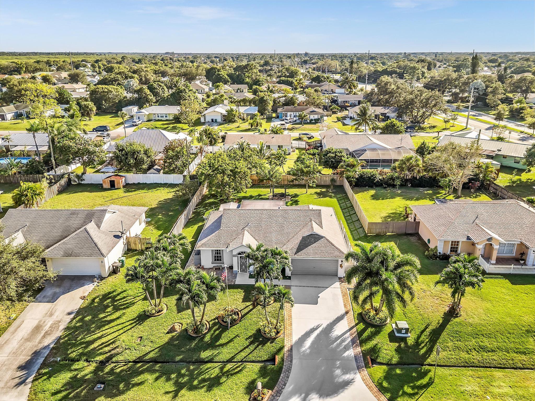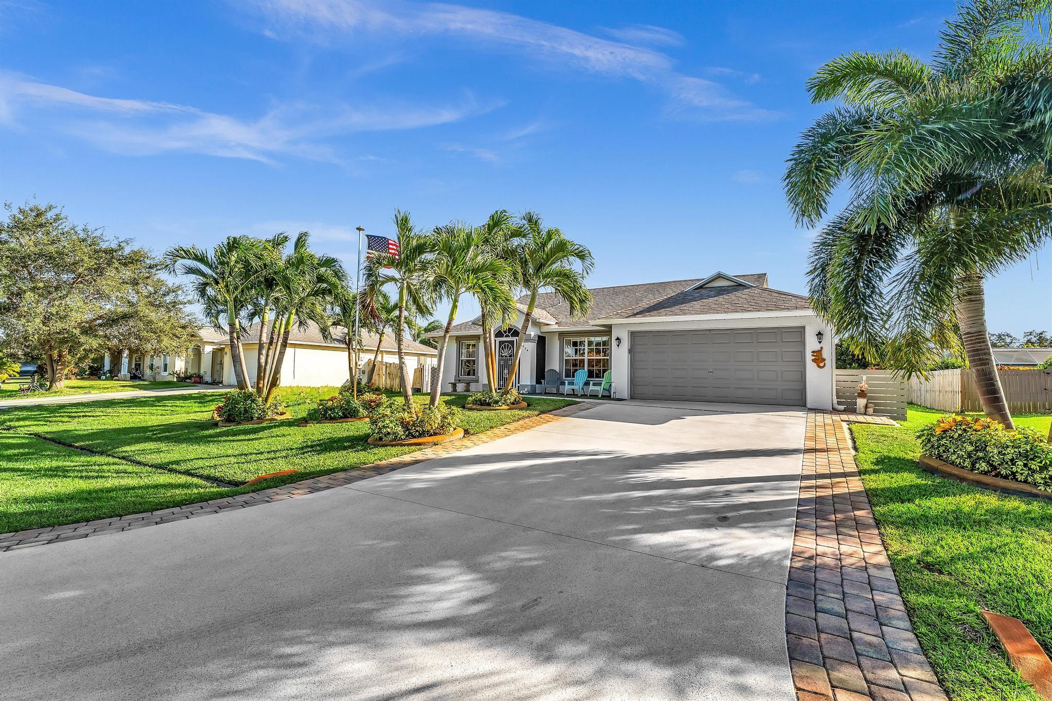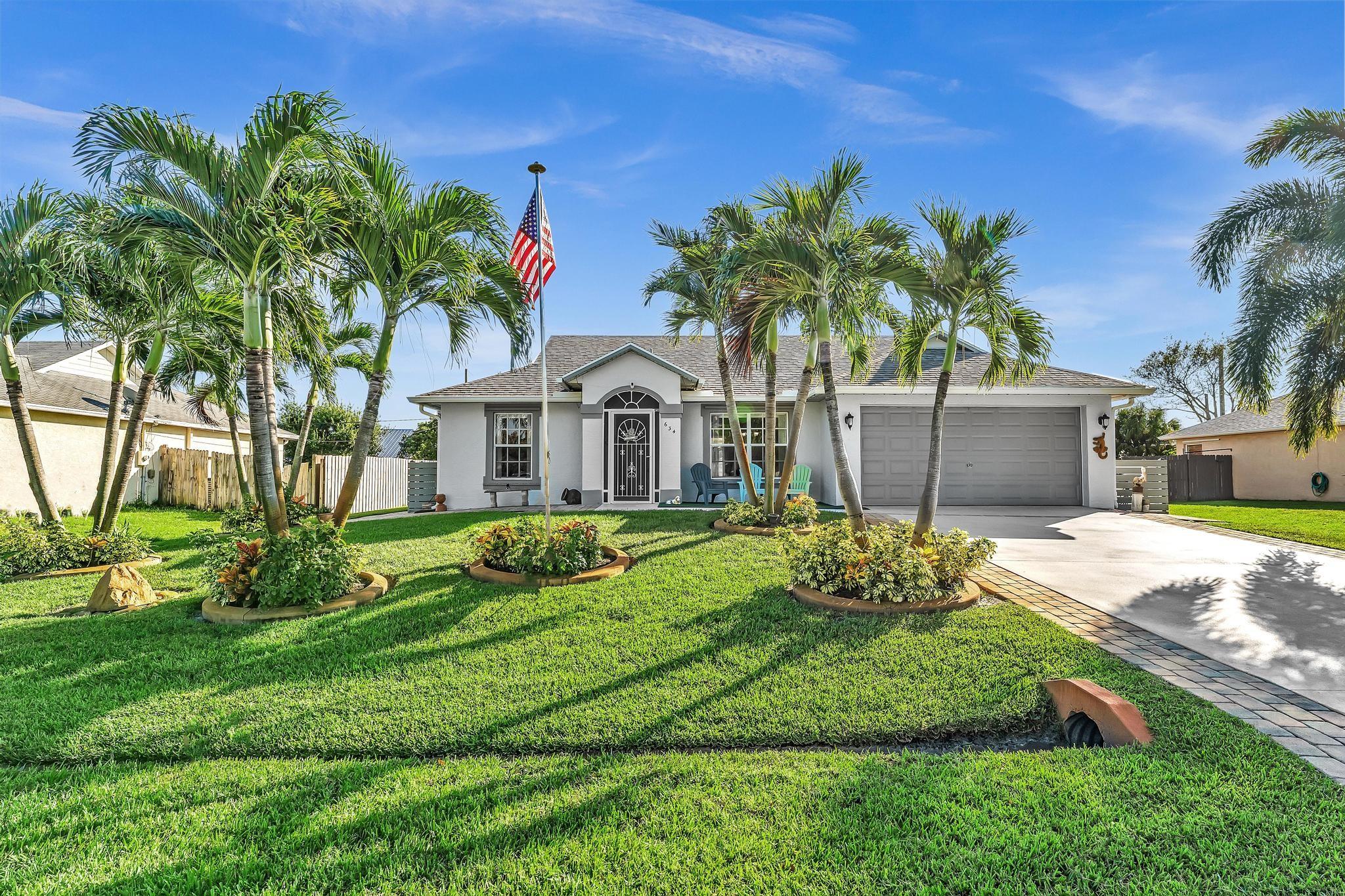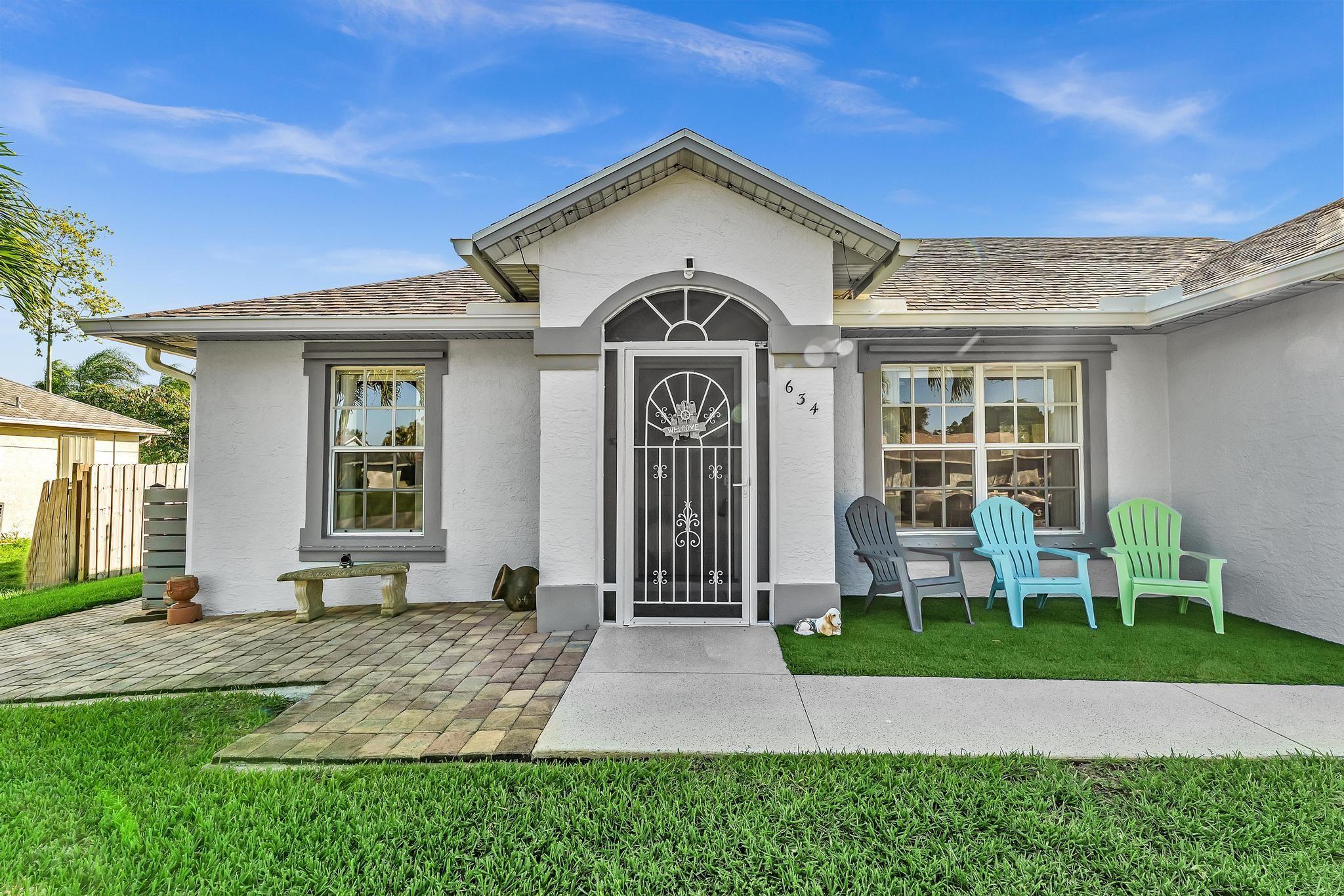 Welcome to 634 SE Thanksgiving Ave a charming CBS a well maintained home featuring a spacious split floor plan, laminate flooring, and a serene primary suite with a walk-in closet. Enjoy a bright kitchen, a laundry room, and inviting Florida room with wall unit A/C. Step outside to your tranquil garden oasis with pavers, well-water sprinklers, septic sewer with city water, and a storage shed. Roof 2017, A/C 2022, water heater 2025, shutters throughout, and a freshly painted driveway. Even the garage is carpeted, with dual fans and a newer opener! This property does not have a dishwasher, but the space is there!