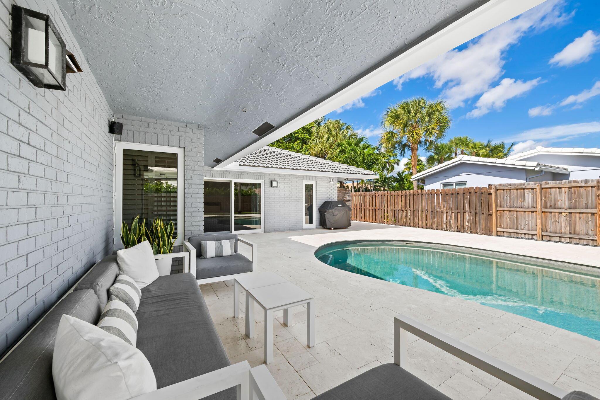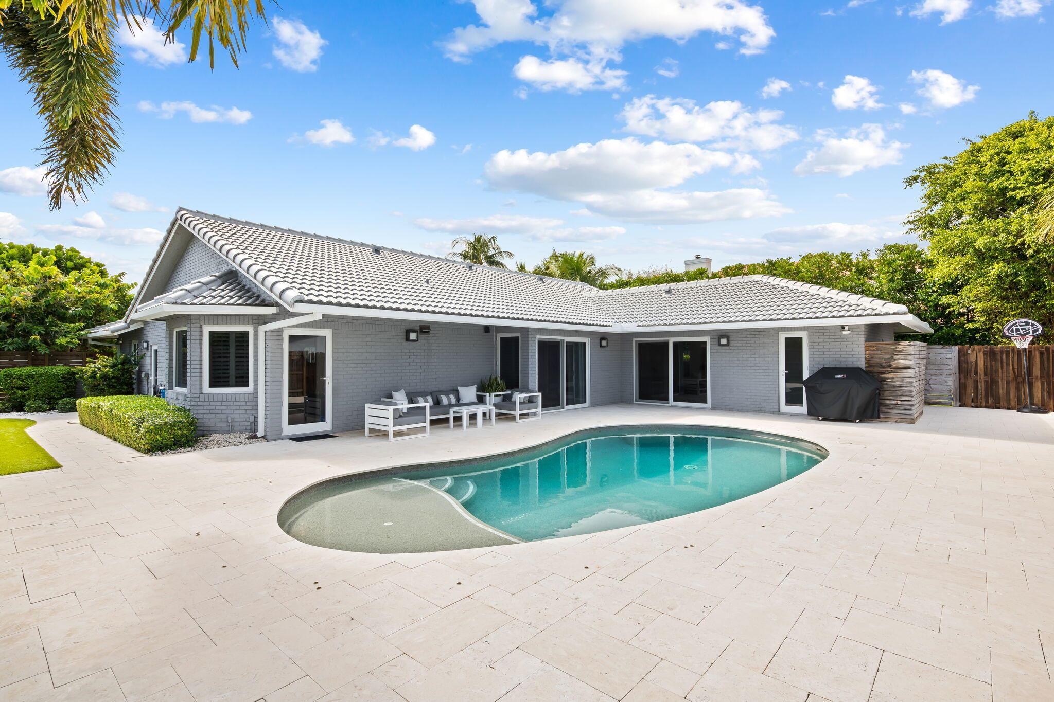 Welcome to Lighthouse Point, a coastal community where comfort, style, and convenience come together. Nestled on a quiet residential street, this beautifully updated 4-bedroom, 2-bath home offers generous space and thoughtful design for modern family living.Step inside to find vaulted ceilings, walnut hardwood floors, and freshly painted interiors that create a bright and inviting atmosphere. The open-concept great room flows seamlessly into a chef-inspired kitchen with marble and quartz countertops, a large island with seating, and a cozy built-in breakfast nook. A bar and coffee area, complete with an 18-bottle wine fridge, makes entertaining effortless.The primary suite overlooks the heated saltwater pool and opens directly to the backyard oasis. A spacious walk-in closet and