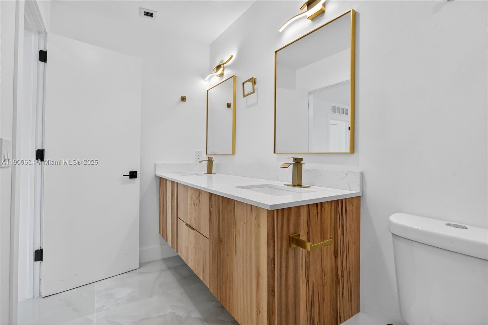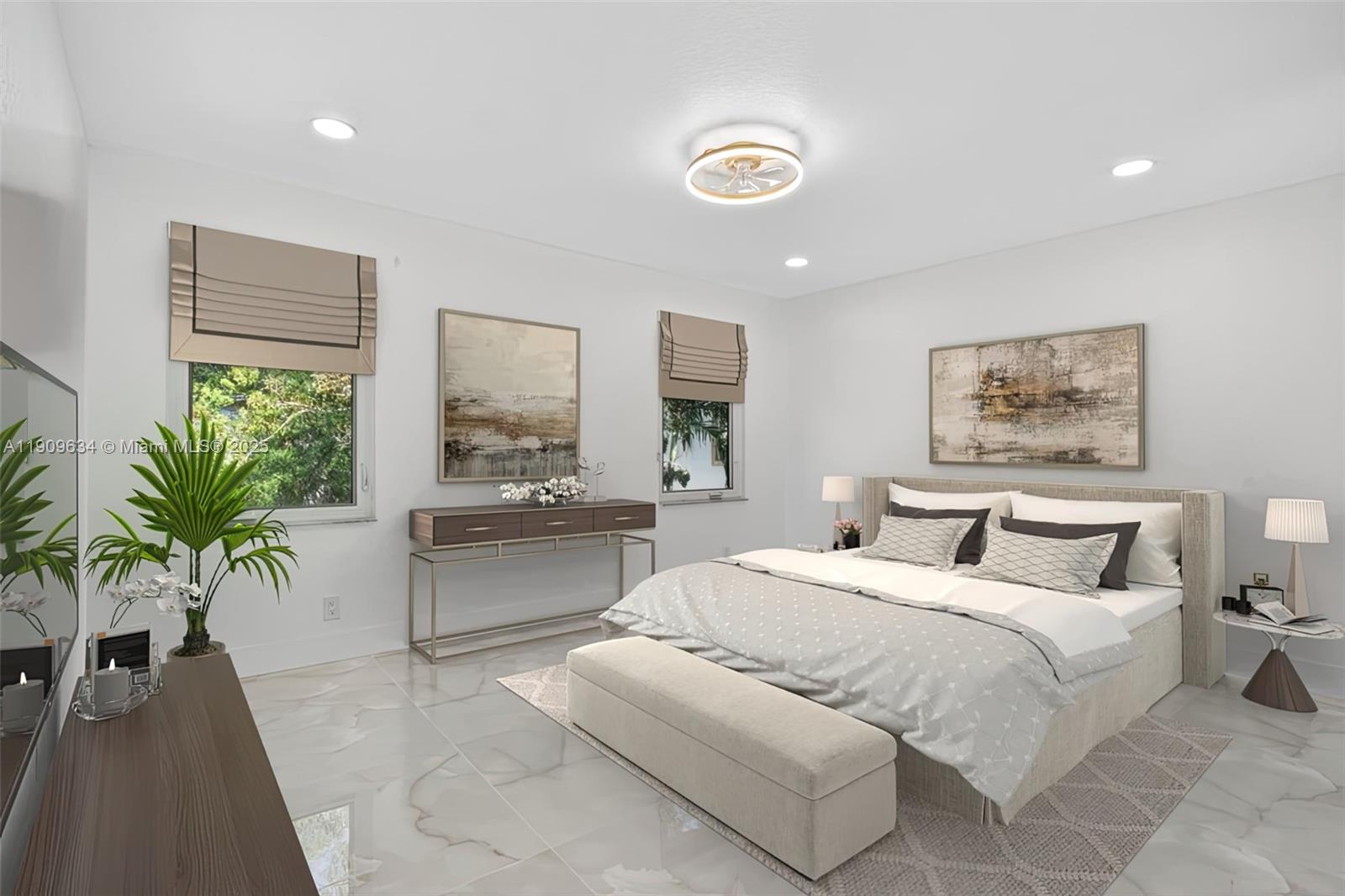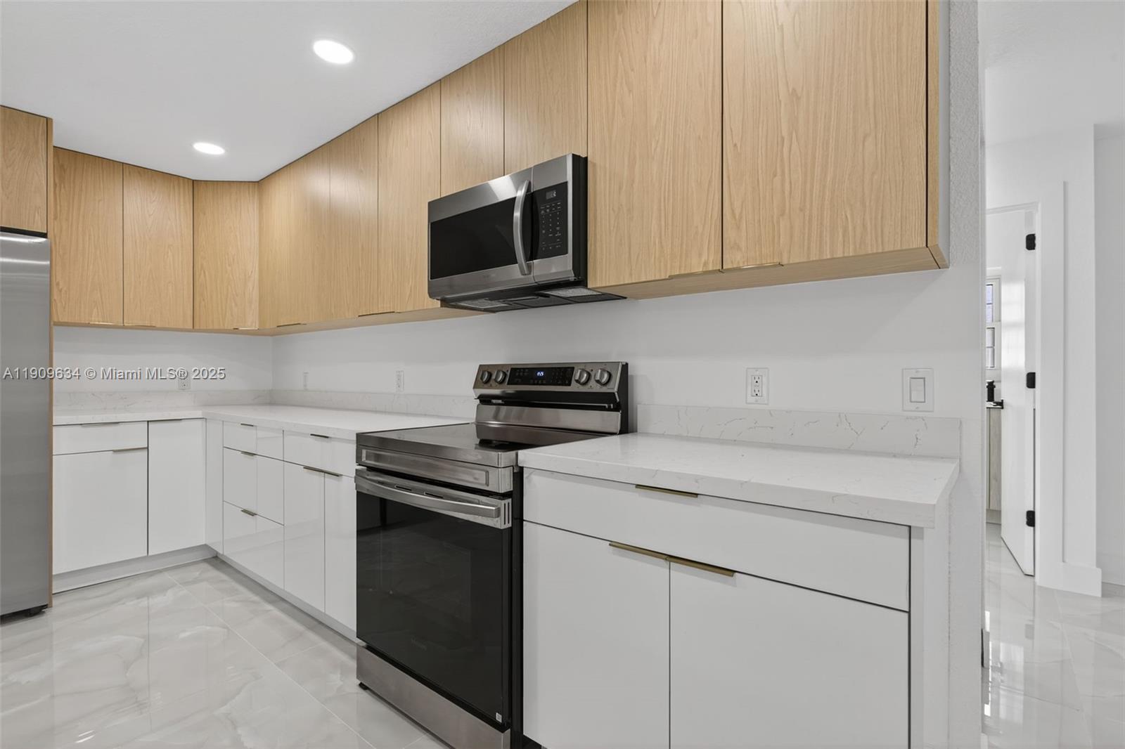 Virtually Staged. Spectacular fully remodeled 3BD/2.5BA townhome featuring a modern custom kitchen with quartz countertops, island with elegant pendant lights, stainless-steel appliances, and a luxurious beige, gold, and white color combination. Enjoy open concept living with new ceramic tile flooring, fresh paint, and recessed lighting. The primary suite includes a walk-in closet and a remodeled bathroom with double sinks, custom vanity, new tiles, and modern lighting. Additional bathrooms feature new vanities, mirrors, shower tiles, bases, and updated accessories throughout. Home also includes a spacious garage, laundry room, and large fenced patio with newly installed grass and fresh landscaping. Schedule your showing today!