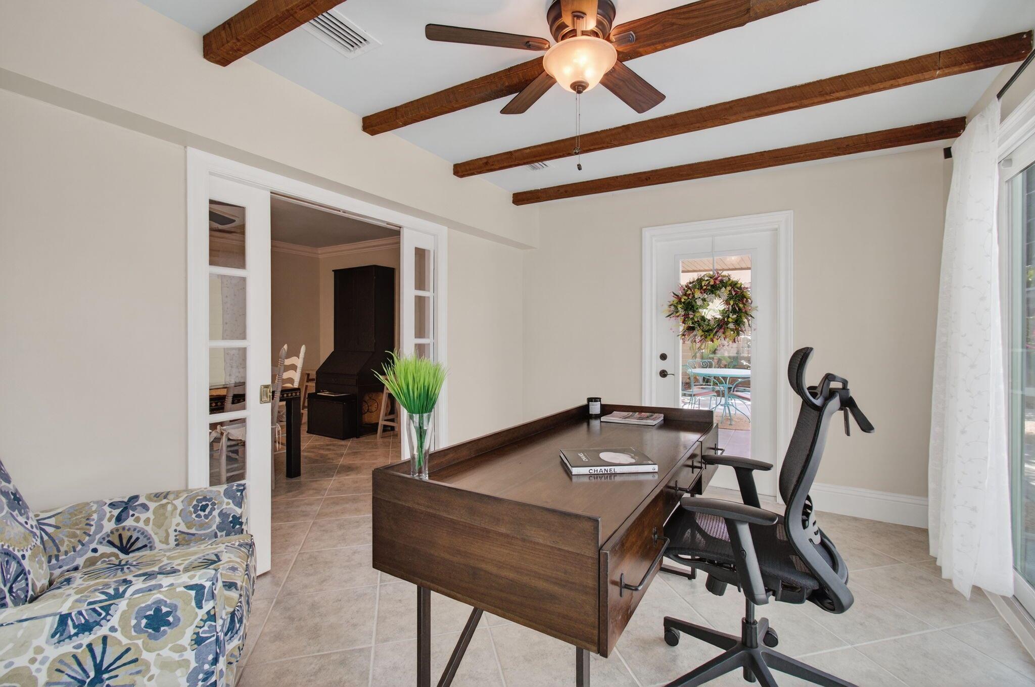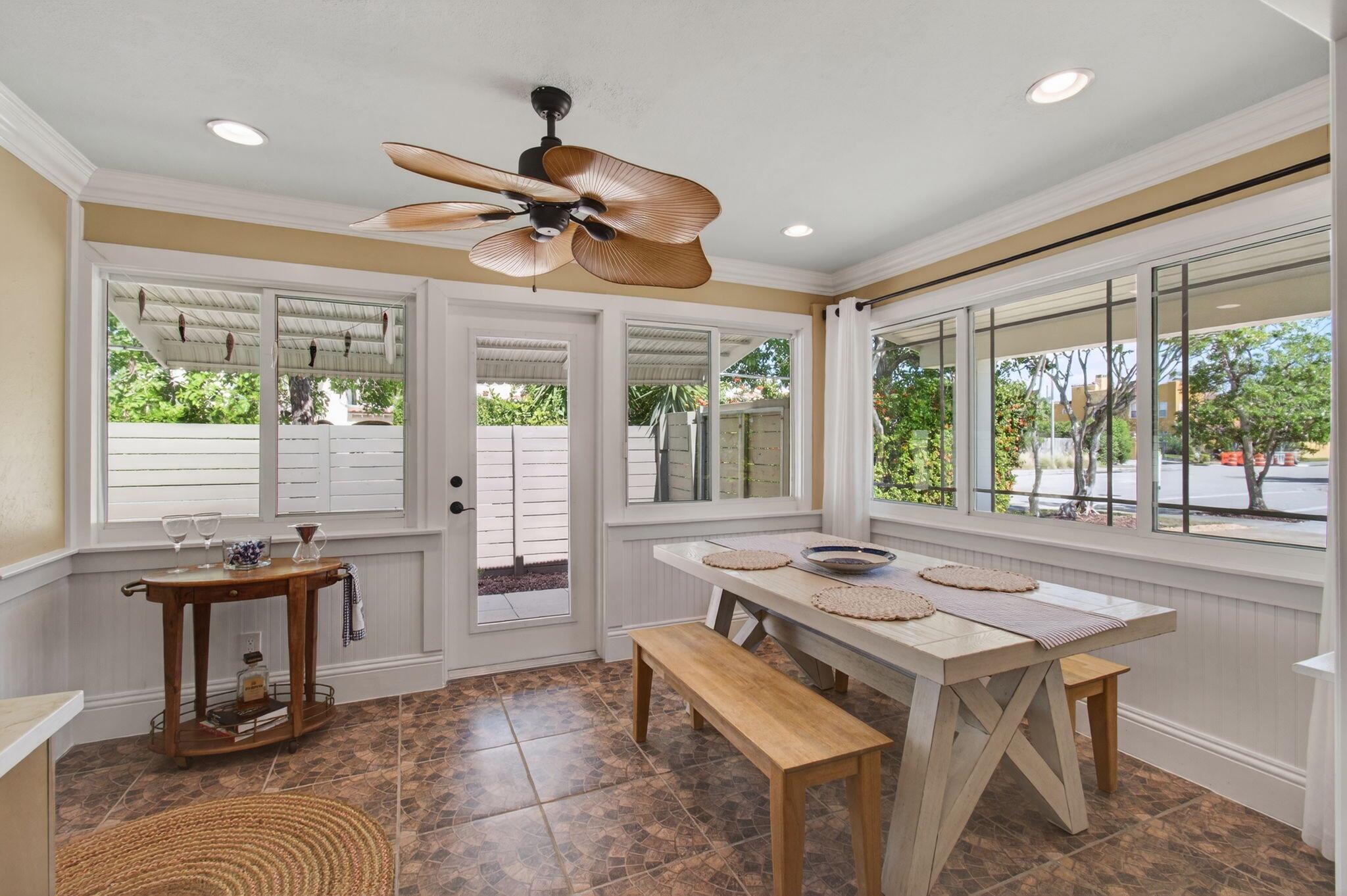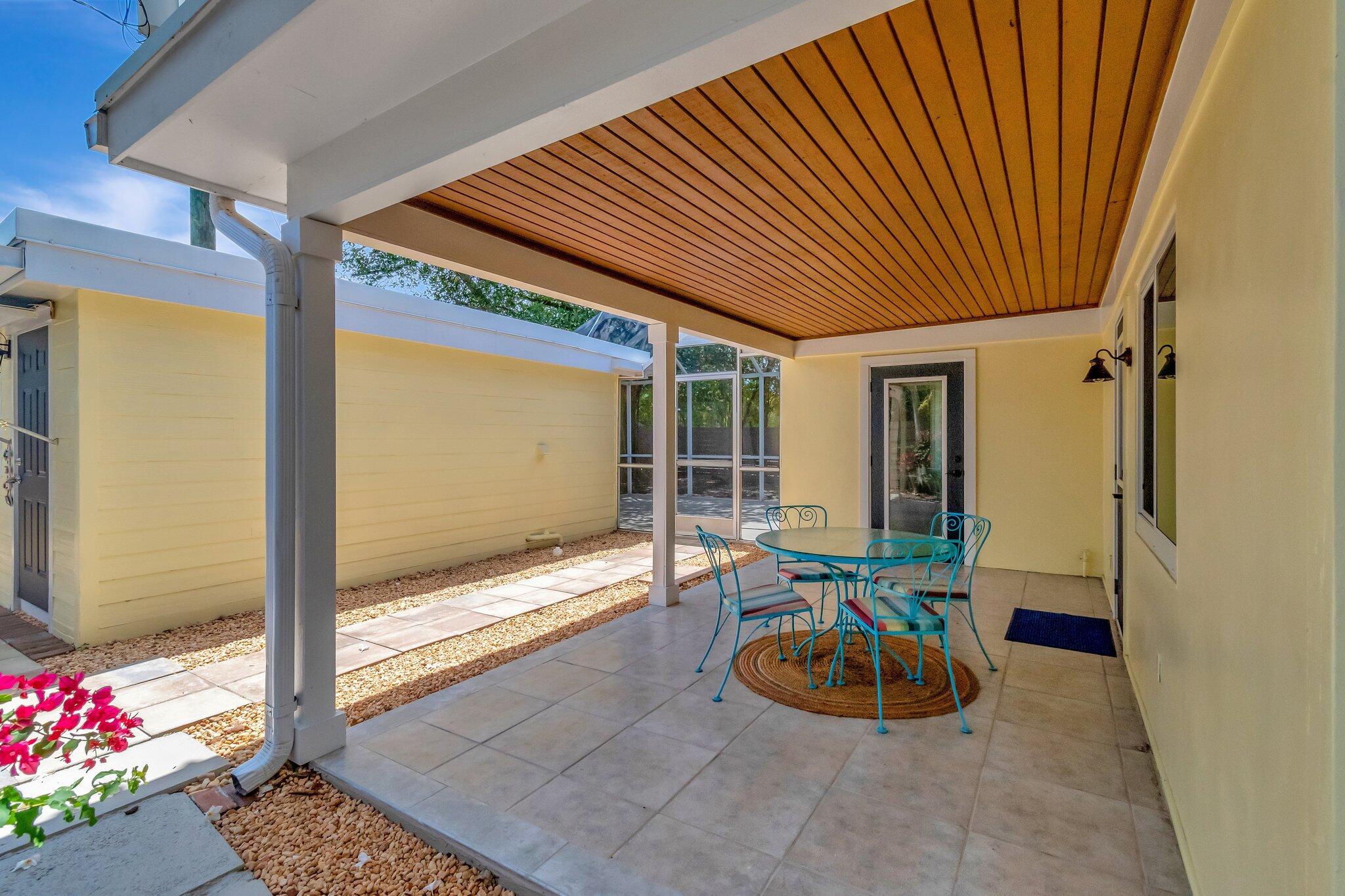 New roof installed and completed in November 2025 on both the main home and cottage, with a transferable 30-year warranty. The single-story concrete block construction (CBS) main home and adjacent cottage have been completely updated with hurricane impact windows and doors. Two new hot water heaters with transferable warranties were installed in 2024. All the work has been completed and is now waiting for a new homeowner to relax and enjoy! The main home features three bedrooms and two full baths, along with a den/office enclosed by full glass pocket doors. A newly installed kitchen (2025) in the main home showcases a neutral palette with 42-inch solid wood cabinets and dovetail soft-closing drawers. The home also features custom crown and baseboard molding throughout.