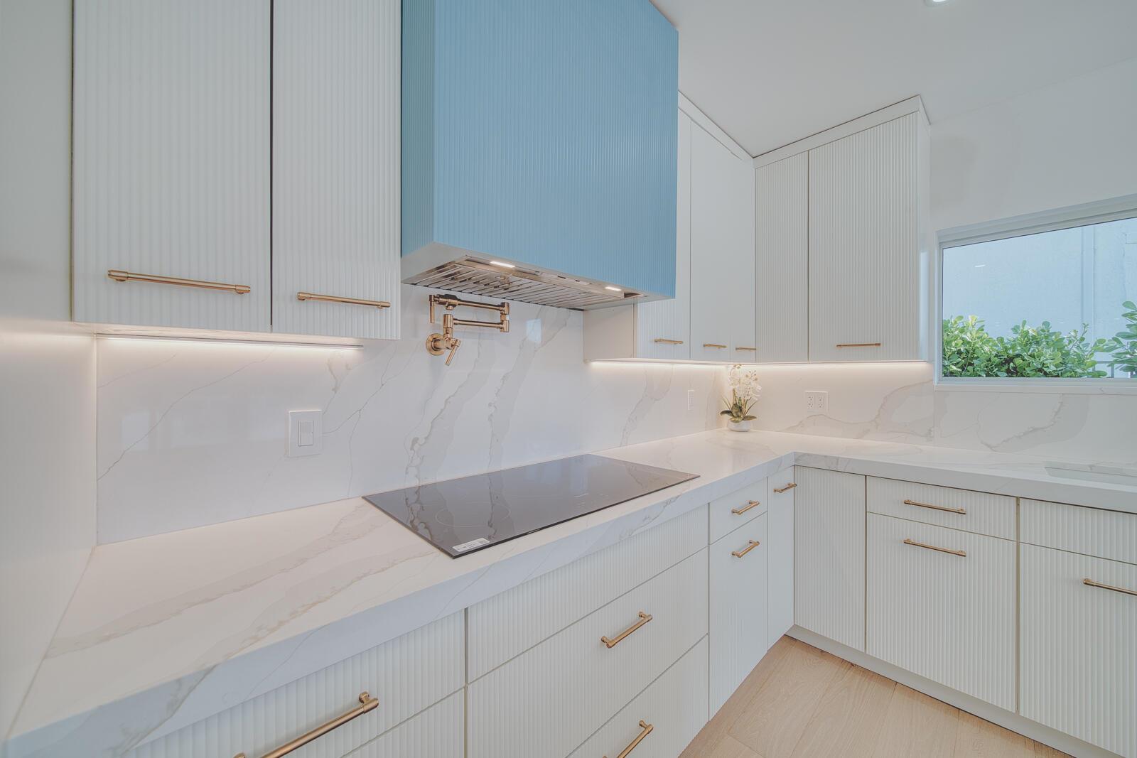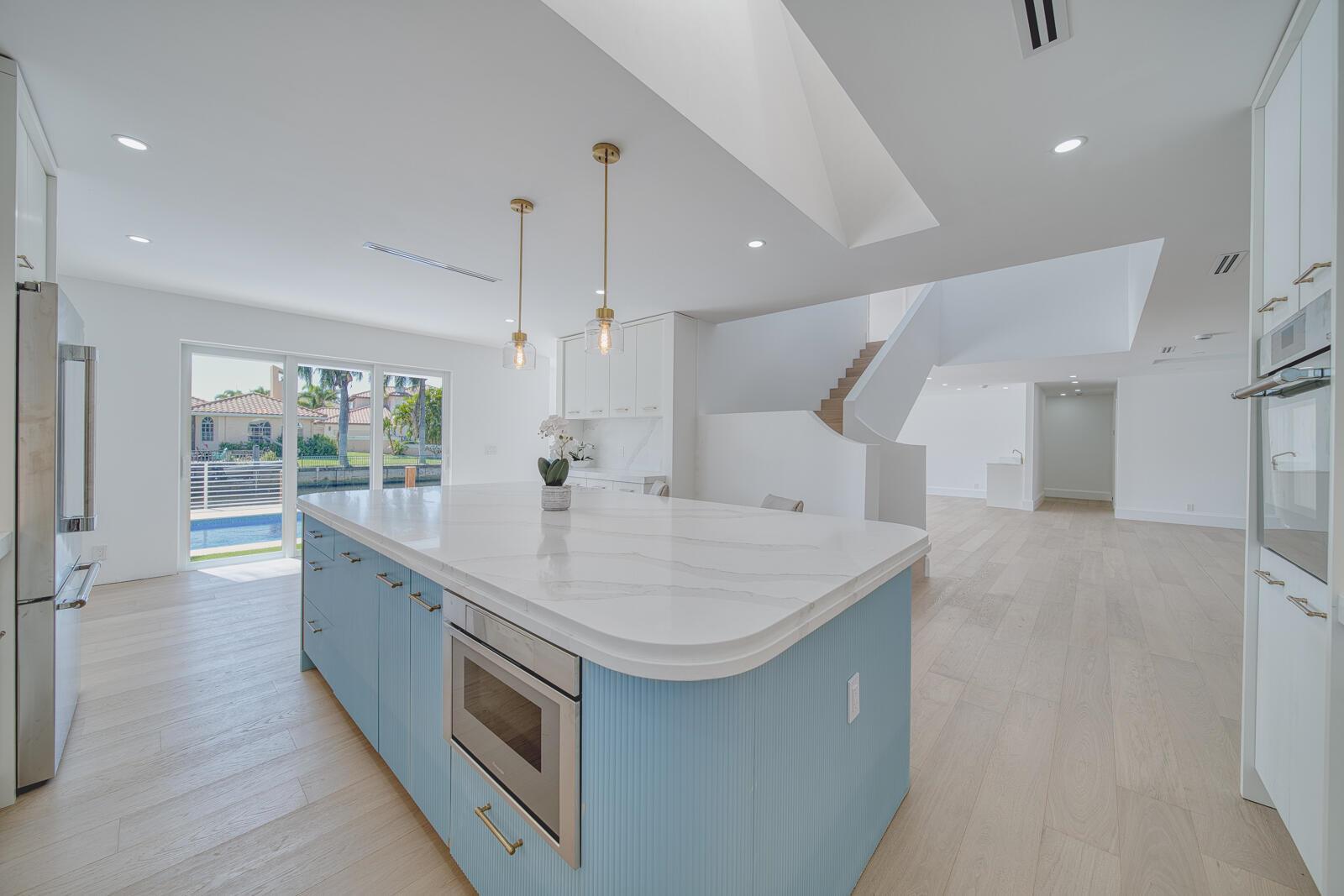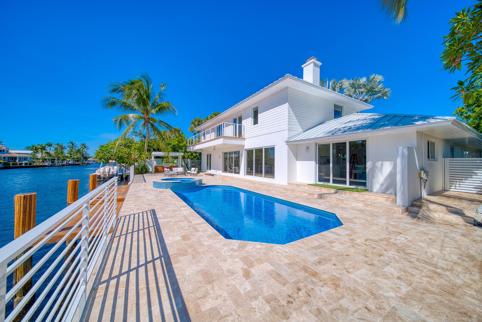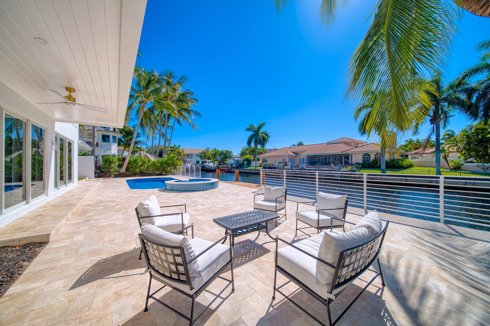 Step inside The Boca East Estate - a fully re-imagined, nearly 4,000 Sq Ft luxury retreat on a private, .23-acre cul-de-sac lot showcasing 100+/- feet of waterfront living and private dock. Perfectly situated just 5 minutes from Downtown Boca Raton, this estate offers an exceptional lifestyle close to Mizner Park, Royal Palm Place, The Boca Raton Club & Resort, fine dining, and pristine beaches. With its bright southern exposure and breathtaking views of the Intracoastal waterway, this home does not disappoint. From the moment you step inside, you'll be captivated by the open living room overlooking the pool and waterfront patio. The chef's kitchen is outfitted with Thermador appliances, quartz countertops, and custom maple shaker cabinetry, setting the stage for elegant entertaining.