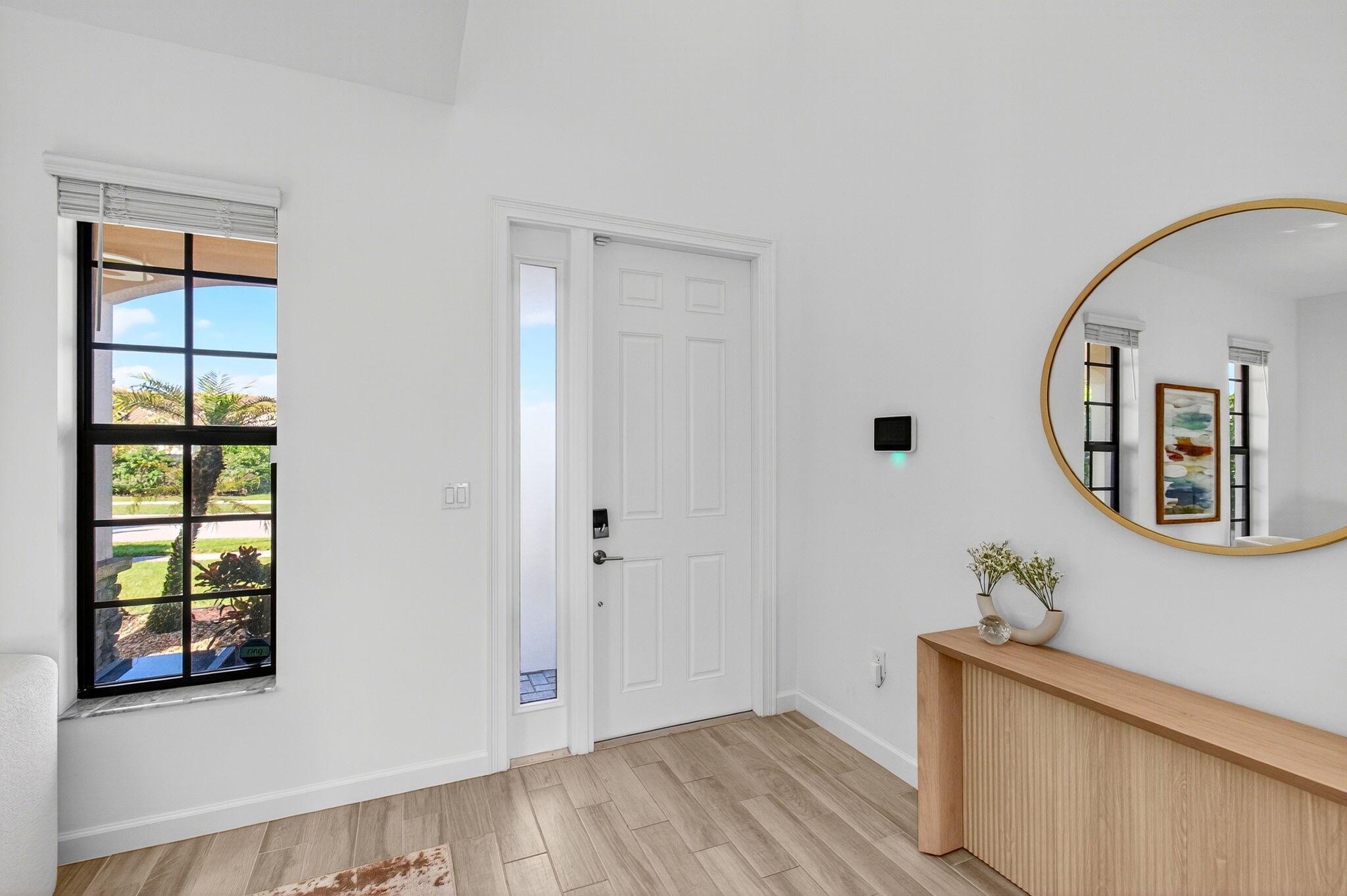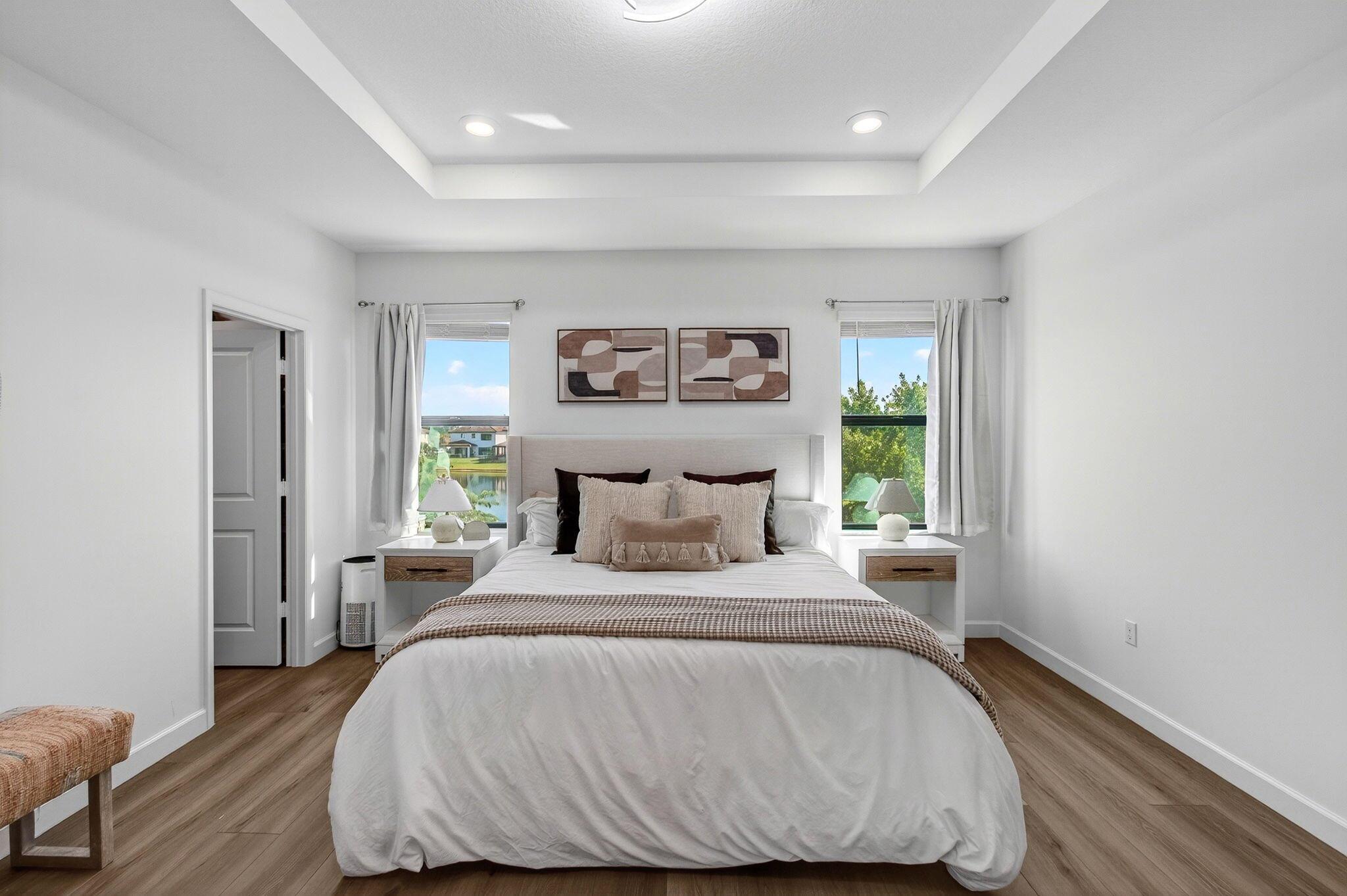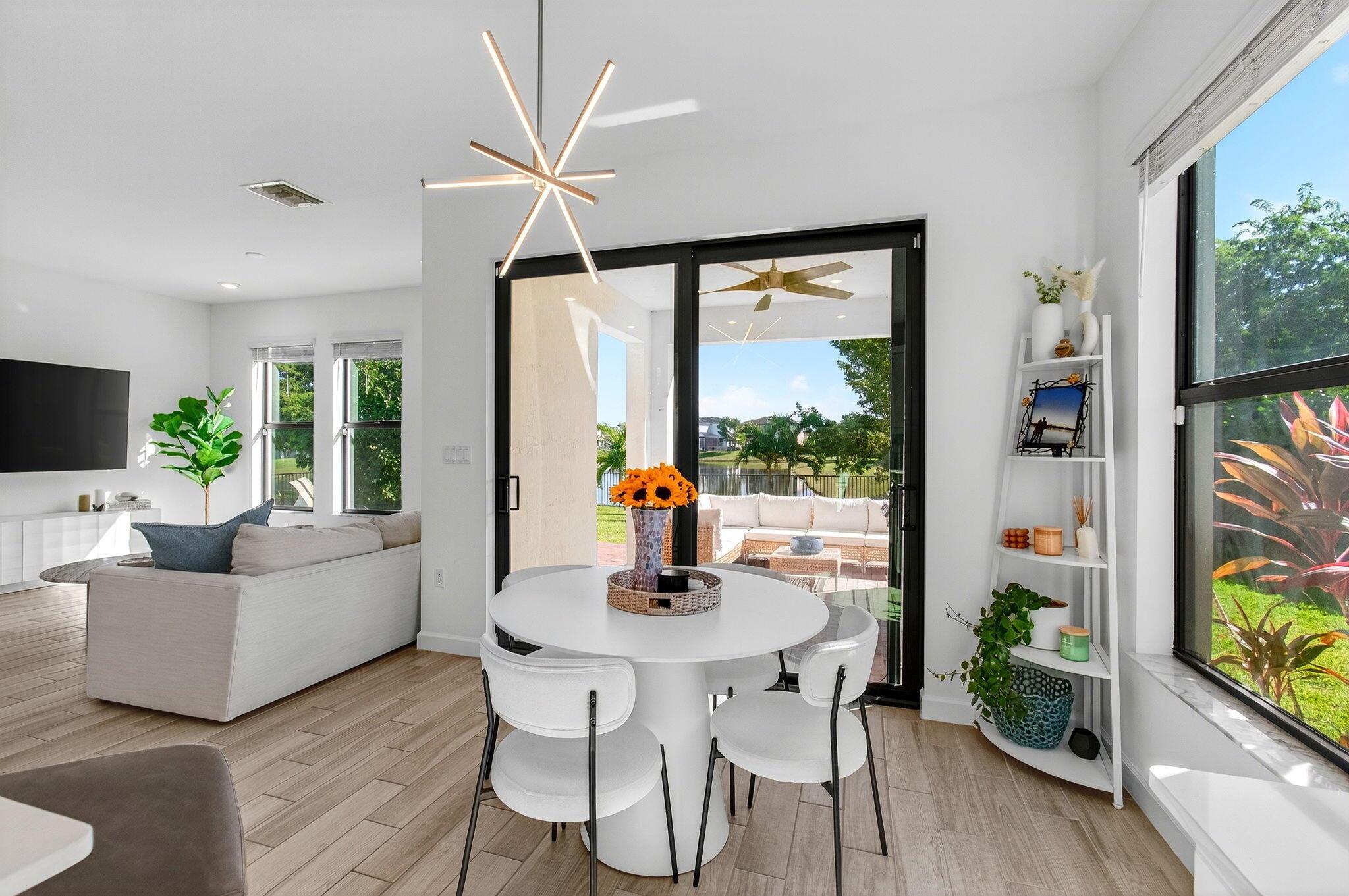WATER, WATER EVERYWHERE- experience lake views from nearly every room in this bright contemporary Bellasera home!As you arrive, you are greeted by freshly manicured landscaping & a welcoming front porch overlooking the lake , with another lake behind the home for the ultimate privacy & serenity. The fully fenced backyard is enormous, offering plenty of room to design your dream pool while maintaining abundant green space for your four-legged friends to play. Mature Clusia hedges create a natural privacy wall, beautifully framing the water views. An impressive 12' x 40' brick paver patio provides the perfect space for alfresco dining & outdoor entertainment. Built in 2020, this home features a newer roof and full-impact glass for total peace of mind, along with lower insurance rates.