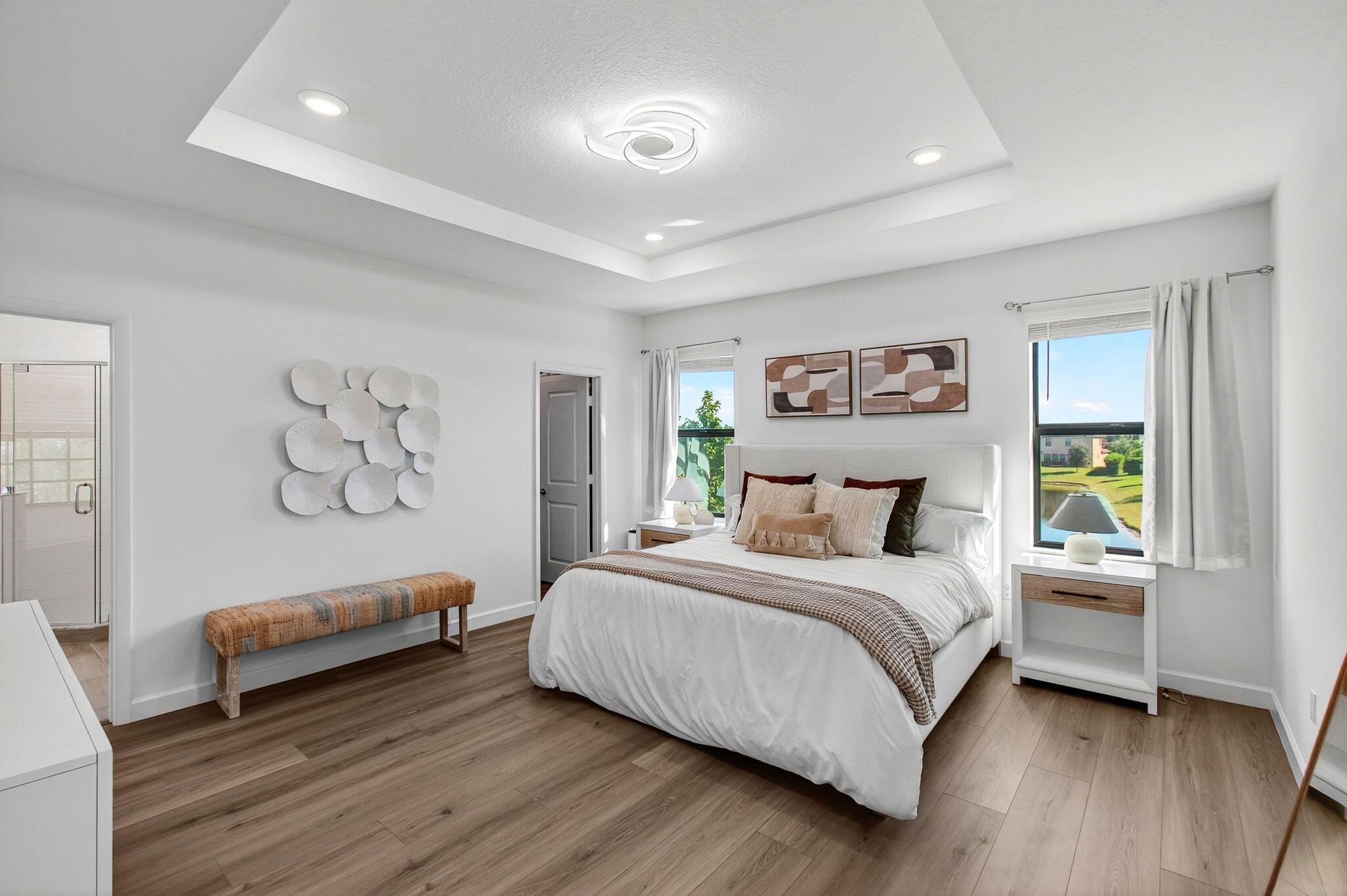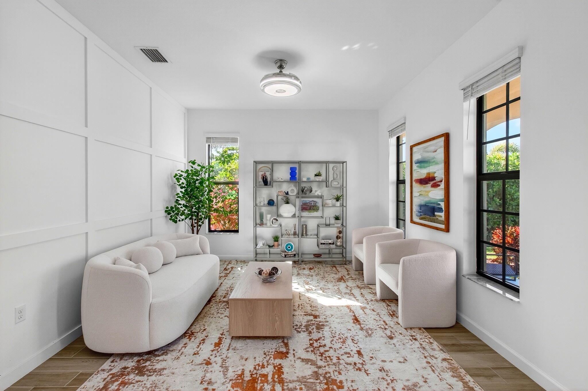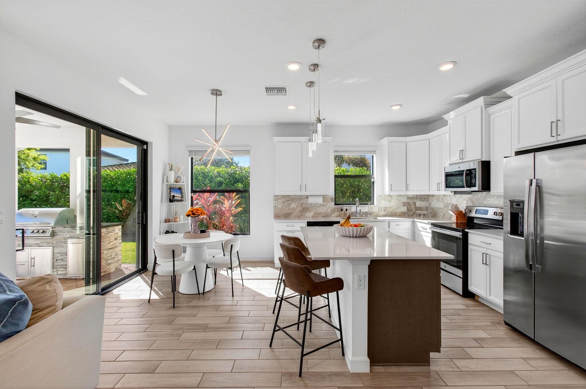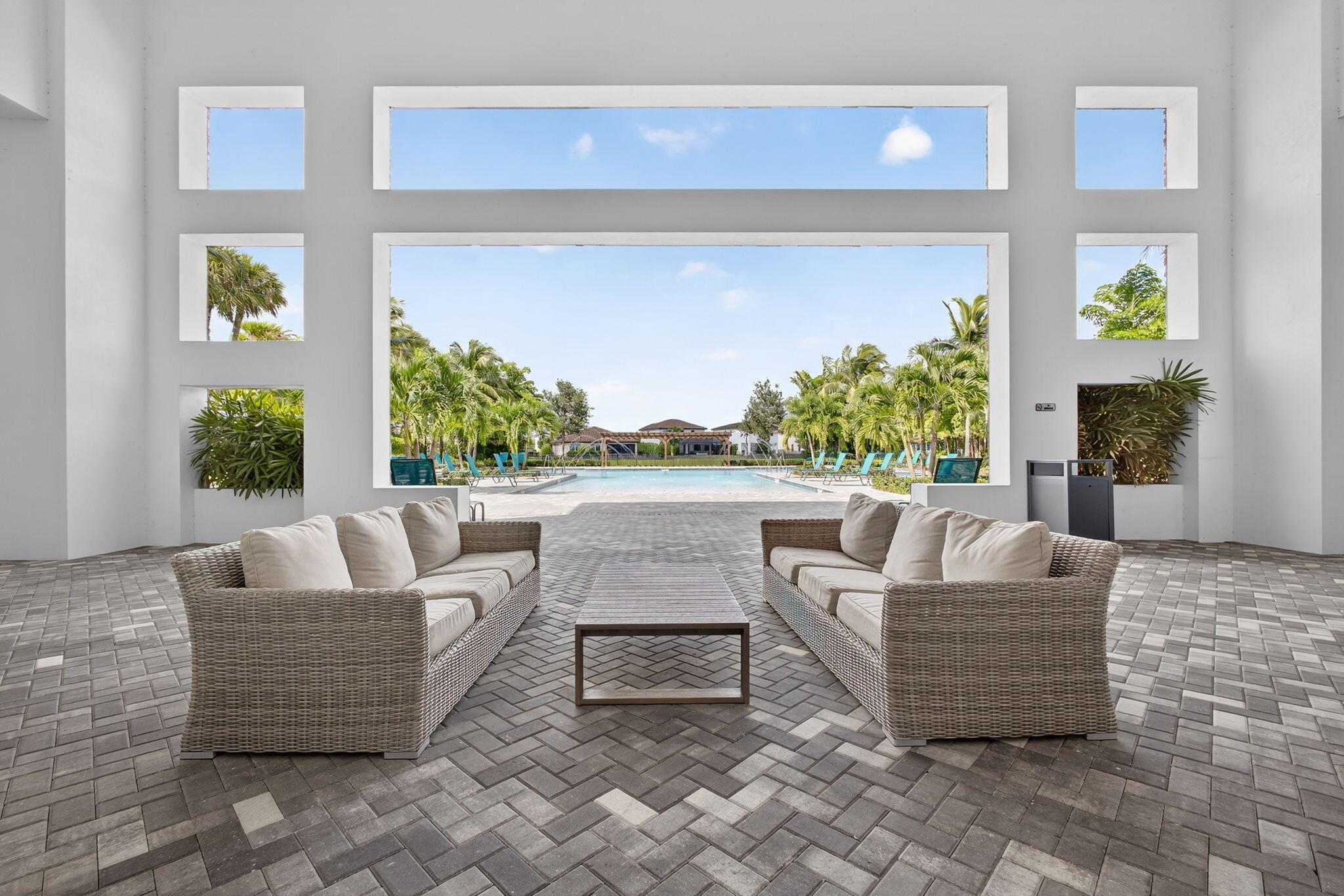WATER, WATER EVERYWHERE- experience lake views from nearly every room in this bright contemporary Bellasera home!As you arrive, you are greeted by freshly manicured landscaping & a welcoming front porch overlooking the lake , with another lake behind the home for the ultimate privacy & serenity. The fully fenced backyard is enormous, offering plenty of room to design your dream pool while maintaining abundant green space for your four-legged friends to play. Mature Clusia hedges create a natural privacy wall, beautifully framing the water views. An impressive 12' x 40' brick paver patio provides the perfect space for alfresco dining & outdoor entertainment. Built in 2020, this home features a newer roof and full-impact glass for total peace of mind, along with lower insurance rates.