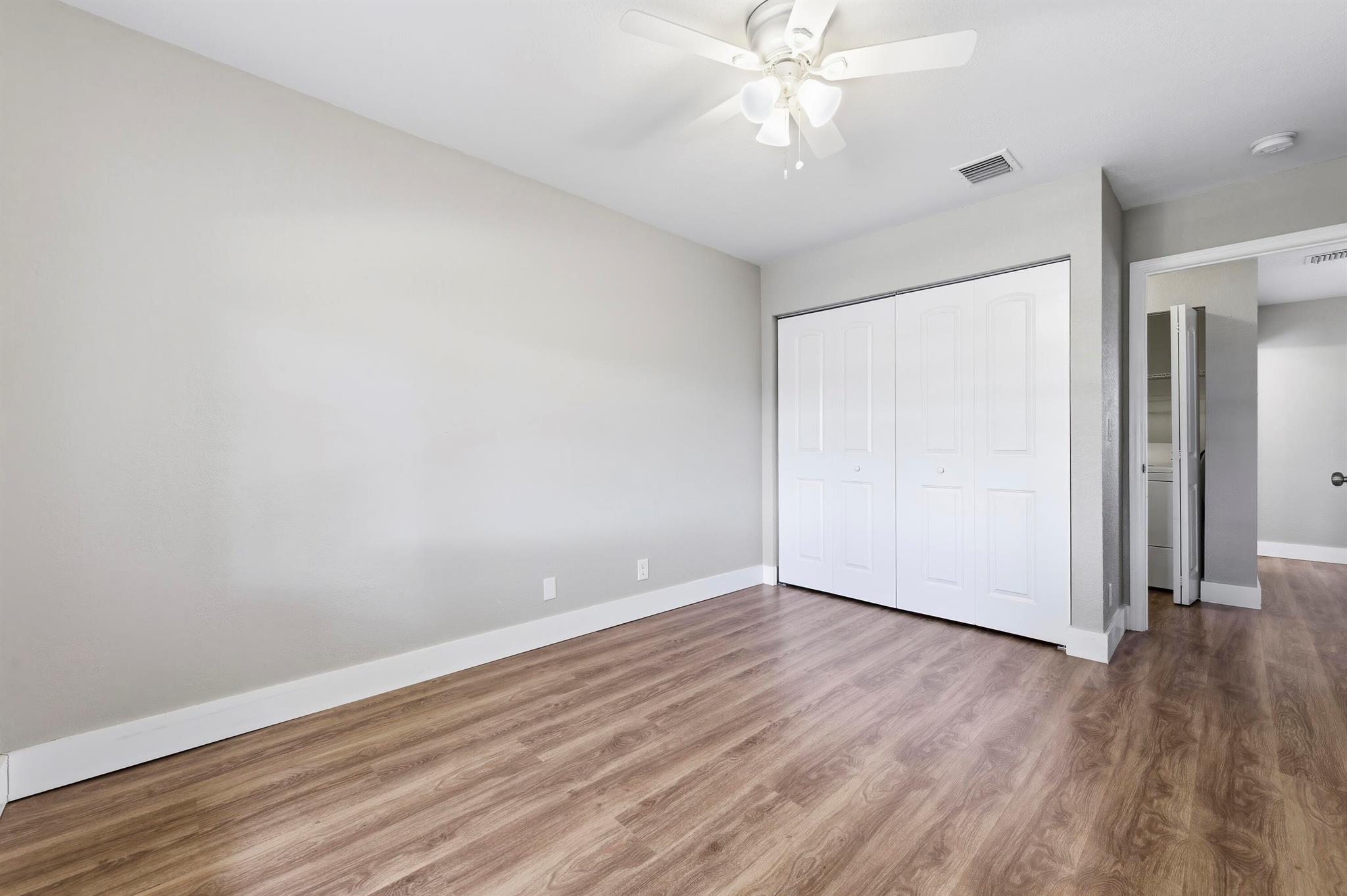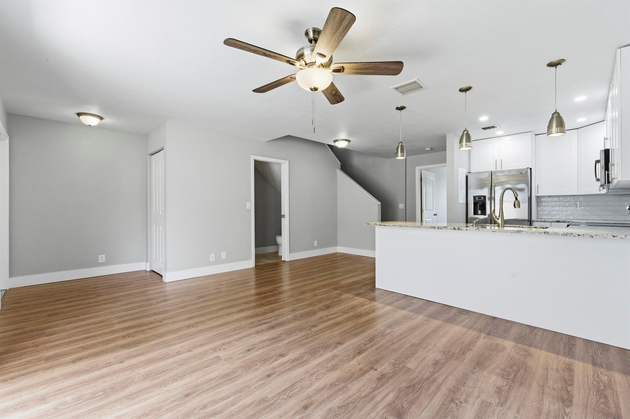 Totally renovated and move-in ready, this stunning 3-bedroom, 2.5-bath end-unit townhouse feels like new construction. The upgraded kitchen features stainless steel appliances, granite counters, white shaker cabinetry, pendant lighting, and barstool seating. The master suite is conveniently located on the ground floor with a large walk-in closet and a beautifully tiled step-in shower. Enjoy modern laminate wood flooring throughout, freshly painted light gray walls, thick baseboards, and ceiling fans in every room. The home offers two private courtyards--one spacious in the front and another off the master bedroom--perfect for relaxing or entertaining. With plenty of natural light, storage space, and a full-size washer and dryer, this home combines comfort and style. Ideally situated in a