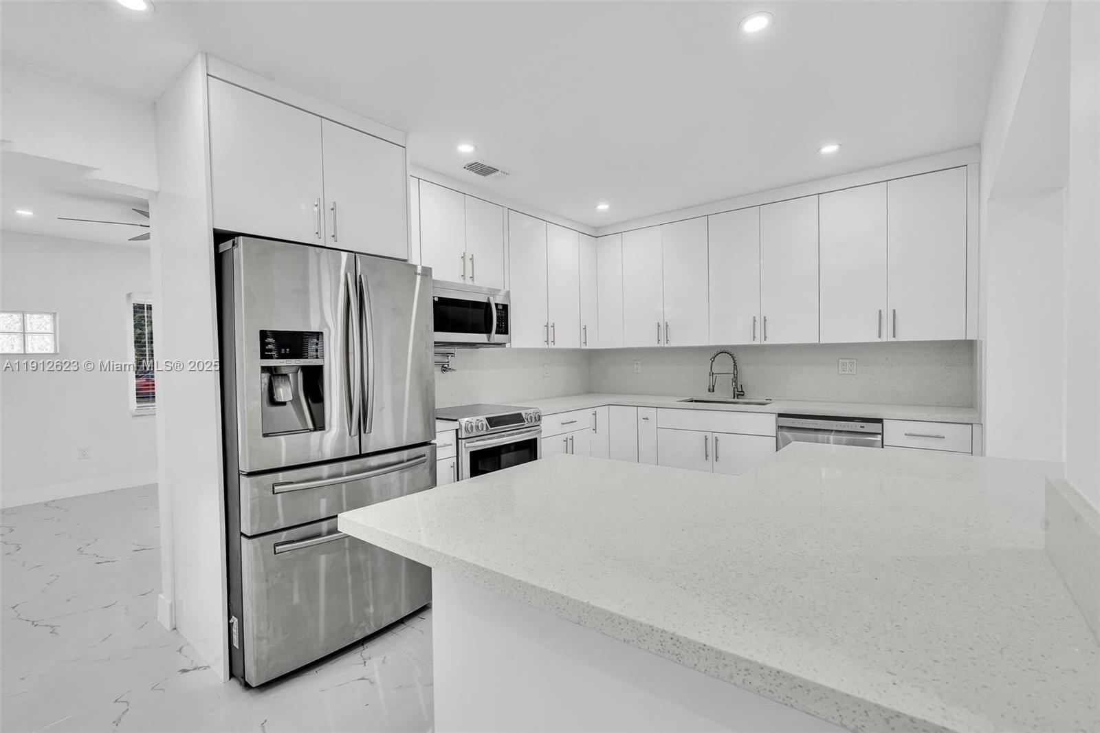 Priced to sell! Stunning Fully Renovated 4-Bedroom, 2-Bath Home in the Heart of El Portal! This spacious home features a 2018 tile roof, impact windows and doors, and 2025 upgrades to electrical, plumbing, and tankless water heater. elegant porcelain tile flooring, recessed lighting, and a modern open layout. kitchen boasts all-new cabinets, Quartz countertops and premium Samsung stainless steel appliances. Both bathrooms fully remodeled, offering stylish finishes. Enjoy a bright family room and dining area. The attached 1-car garage offers flexibility and can easily be converted into a spacious primary suite or entertainment room. freshly painted inside and out, the home sits on a generous lot with a lush backyard featuring fruit-bearing trees—perfect for relaxing or entertaining.