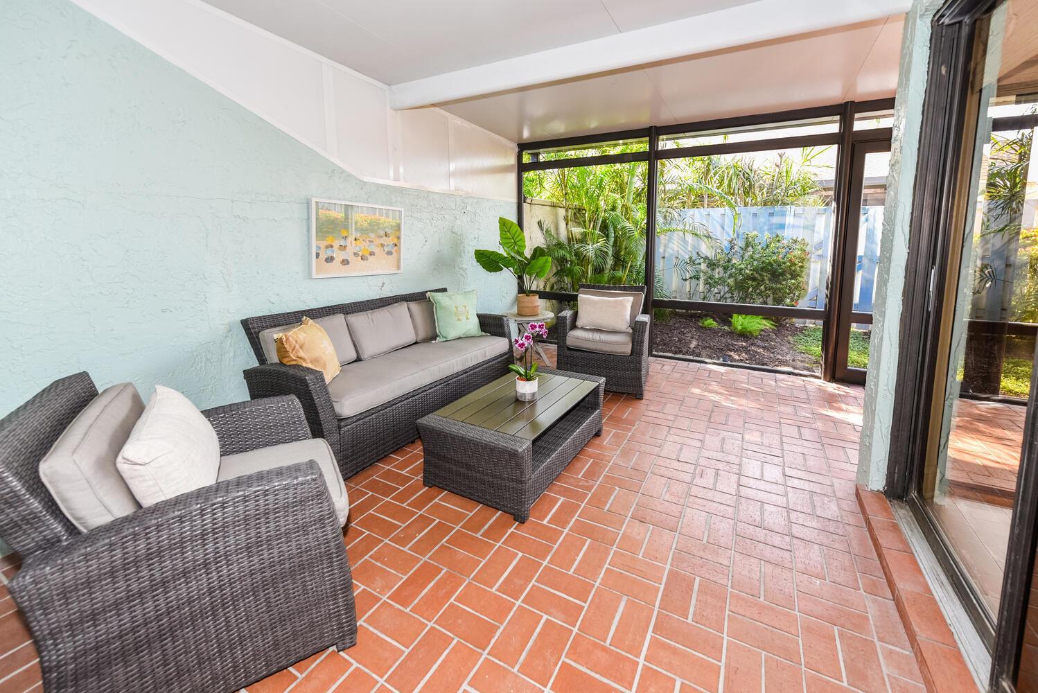Welcome to this immaculate 2-bedrooms 2-baths home in a prestigious Country Club community. Nestled just a mile from the Ocean, this desirable location offers effortless access to sun-kissed beaches, high-end shopping, and gourmet dining. As a resident, you'll enjoy the freedom to opt-in to the country club, unlocking exclusive amenities and social opportunities. As you approach the home, you're immediately greeted by a perfectly manicured, East facing patio that sets the tone for a warm and inviting atmosphere within. The heart of this home is an open flow that boasts stunning wood Shiplap Vaulted ceiling and a skylight ensuring plenty of natural light throughout the day. Further complimenting this coastal-chic home is a chef's kitchen with white shaker cabinetry, quartz countertops, and