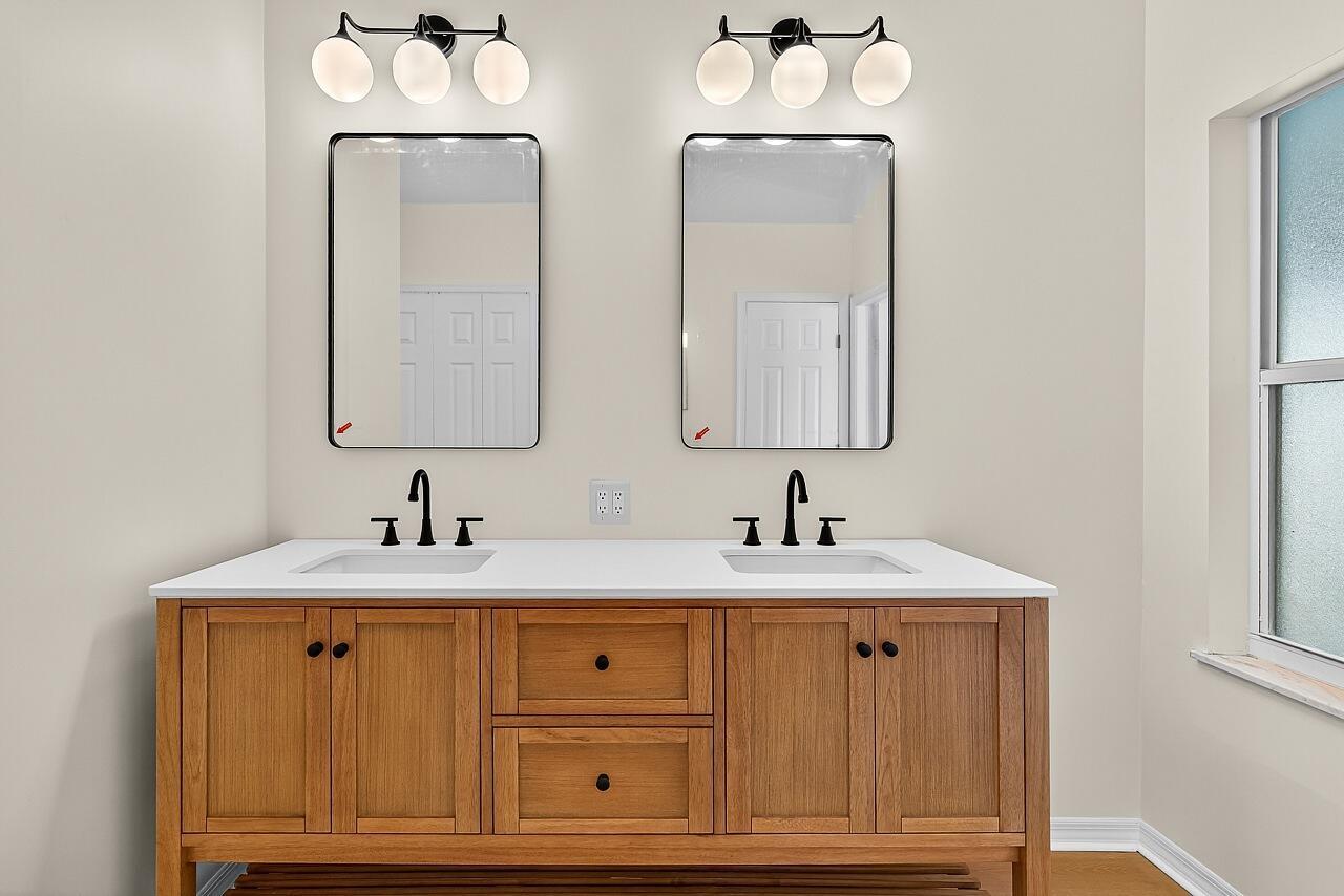 This renovated three-bedroom, two-bath residence features a new metal roof with a 50-year warranty, lowering homeowner insurance rates. The AC system was installed in 2025 and is complemented by freshly cleaned air ducts. The water heater (2018) and the washer and dryer (2024) remain under warranty. The open-concept split floor plan includes a chef's kitchen equipped with a 12-foot granite island, new cabinetry, granite countertops, and premium appliances. All ceiling fans and interior finishes have been updated. The exterior comprises a lush, private tropical lot with mature 30-foot palm trees, a fruit-bearing mango tree, and a 10x10 storage shed. The garage offers updated flooring, modern lighting, upgraded door springs and sensors, as well as a finished attic for additional storage.