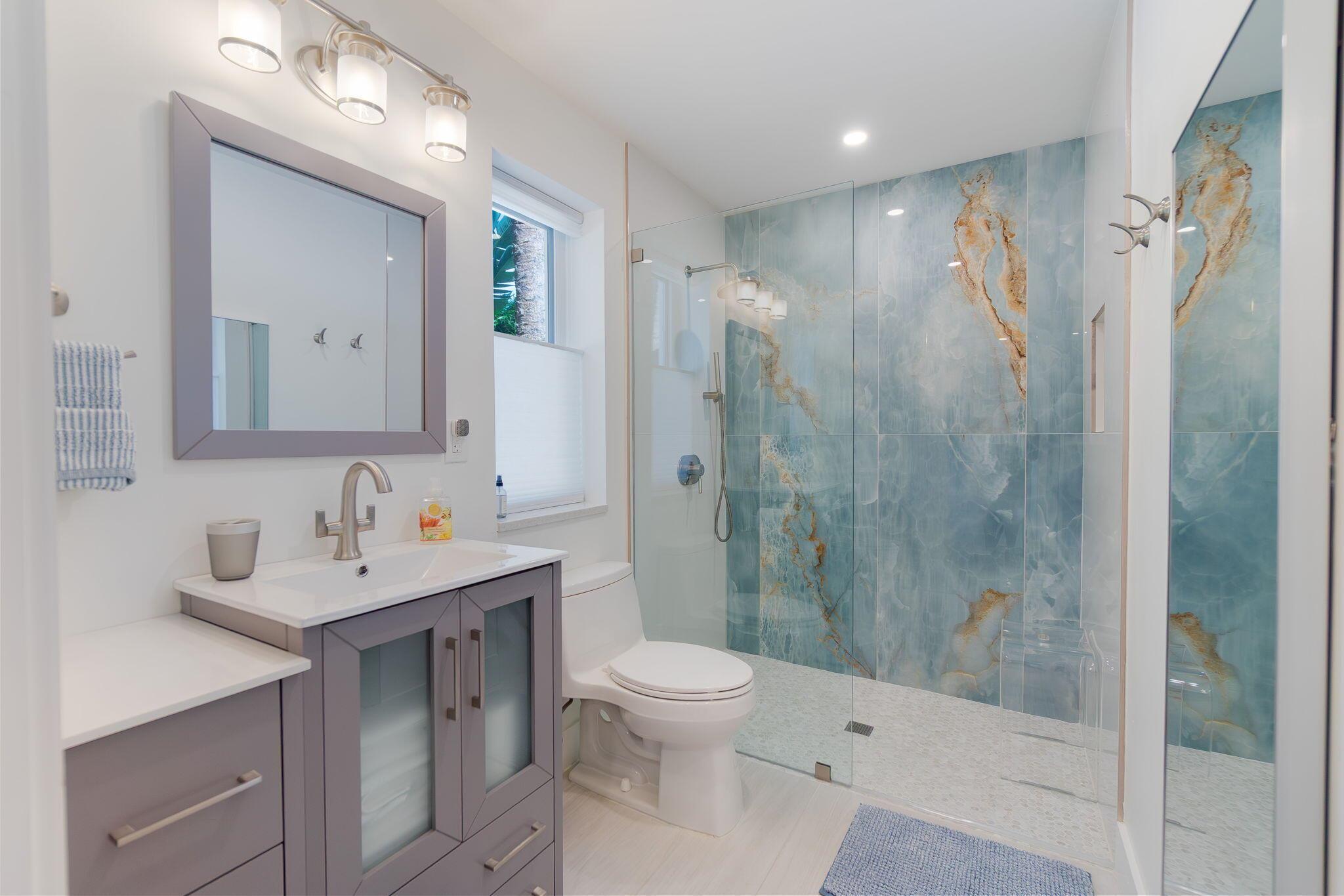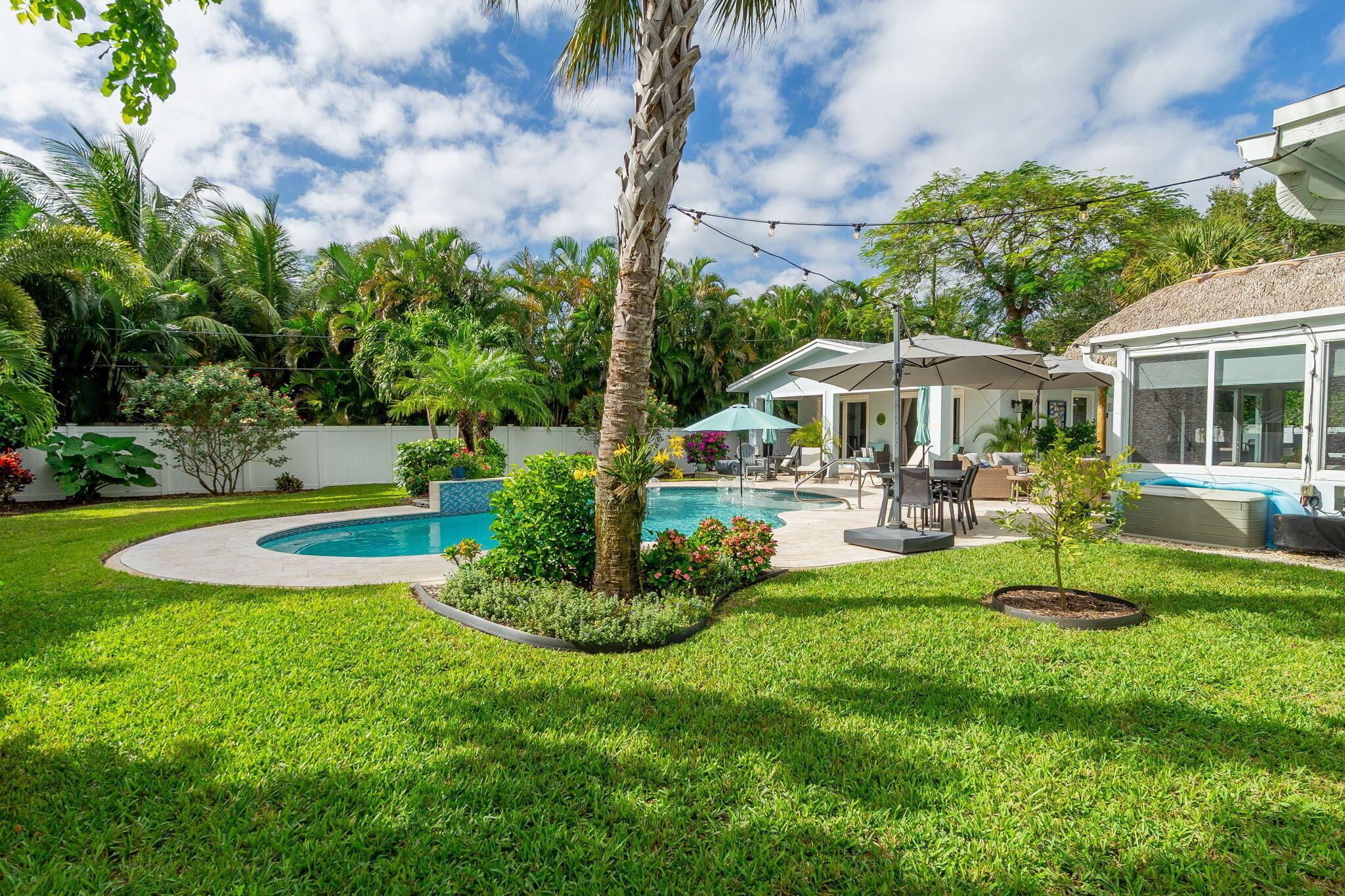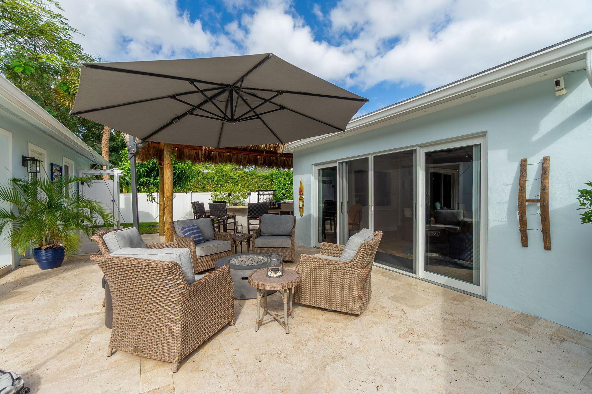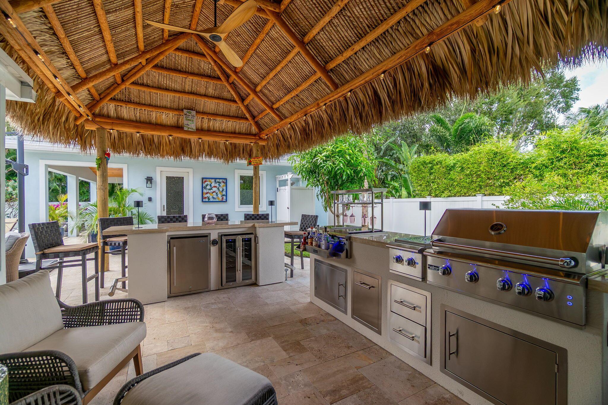 Welcome to your private tropical retreat in Delray Beach! This beautifully updated single-family home features a 2-bedroom, 2-bath main residence on one level, showcasing impact glass throughout, modern finishes, and a bright, open layout designed for effortless Florida living. Step outside to your own resort-style backyard oasis--complete with a sparkling swimming pool, lush landscaping, and an inviting tiki hut with a built-in BBQ, bar seating, and ample space for entertaining. Every detail of this outdoor paradise has been thoughtfully curated to create the ultimate relaxation and entertainment setting. The property also includes a beautiful guest house, offering bedroom, full bath, living area, and complete kitchen,