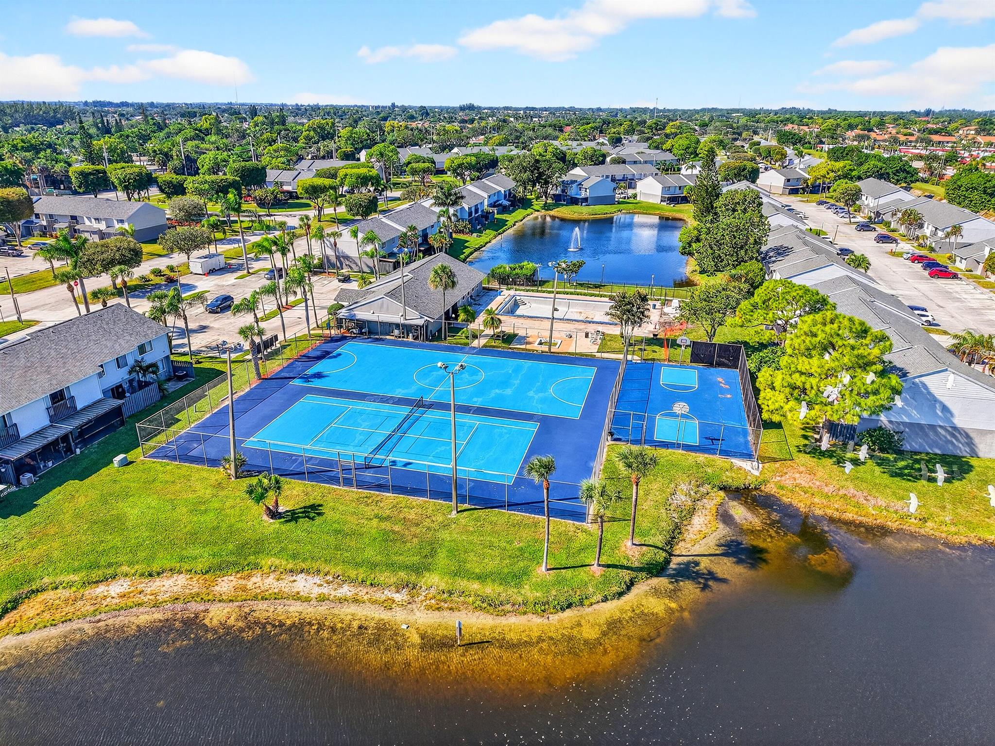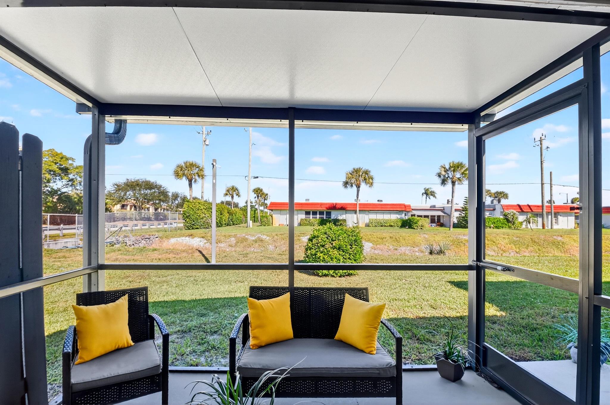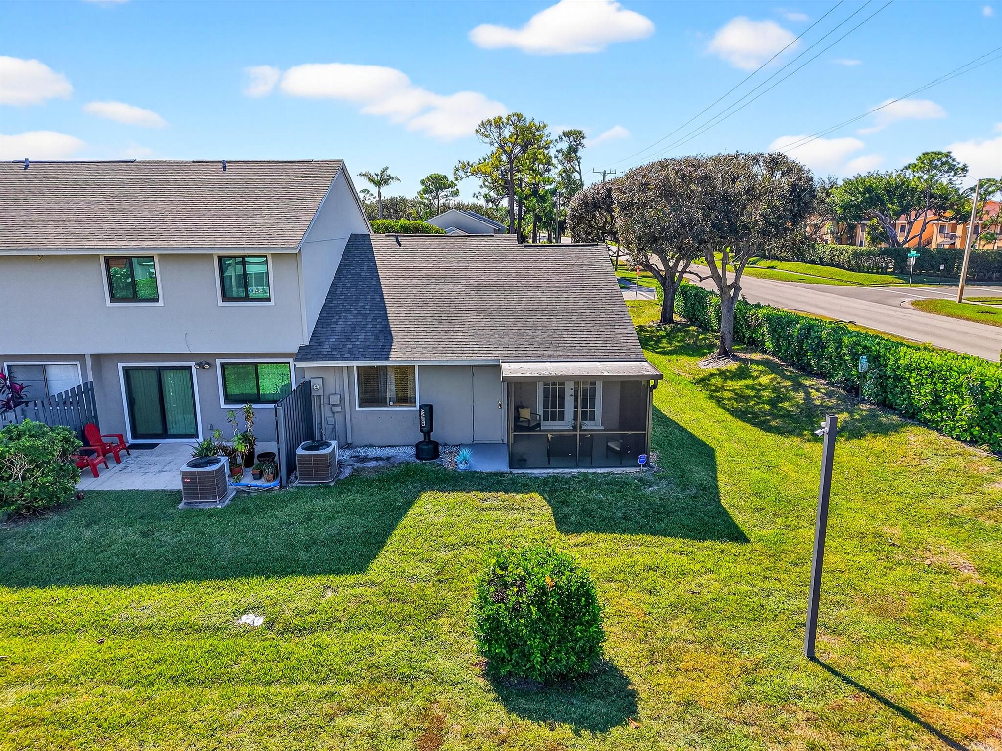 Beautiful upgraded end unit townhouse in centrally located community. As you enter this home, you will notice that it is meticulously maintained and features updated kitchen with high hat lighting, new cabinets and granite counter tops. The kitchen opens into the dining/living space which leads out to the screened patio. This end unit offers added privacy, which is great for entertaining Both bathrooms have been nicely renovated. It is tiled throughout with both bedrooms featuring large closets and ceiling fans. The community offers a pool, which is being renovated, as well as tennis/pickleball courts and a large club house. The unit has a front patio and a back screened in patio. The roof was replaced in 2023. Furniture is negotiable. TVs do not convey.