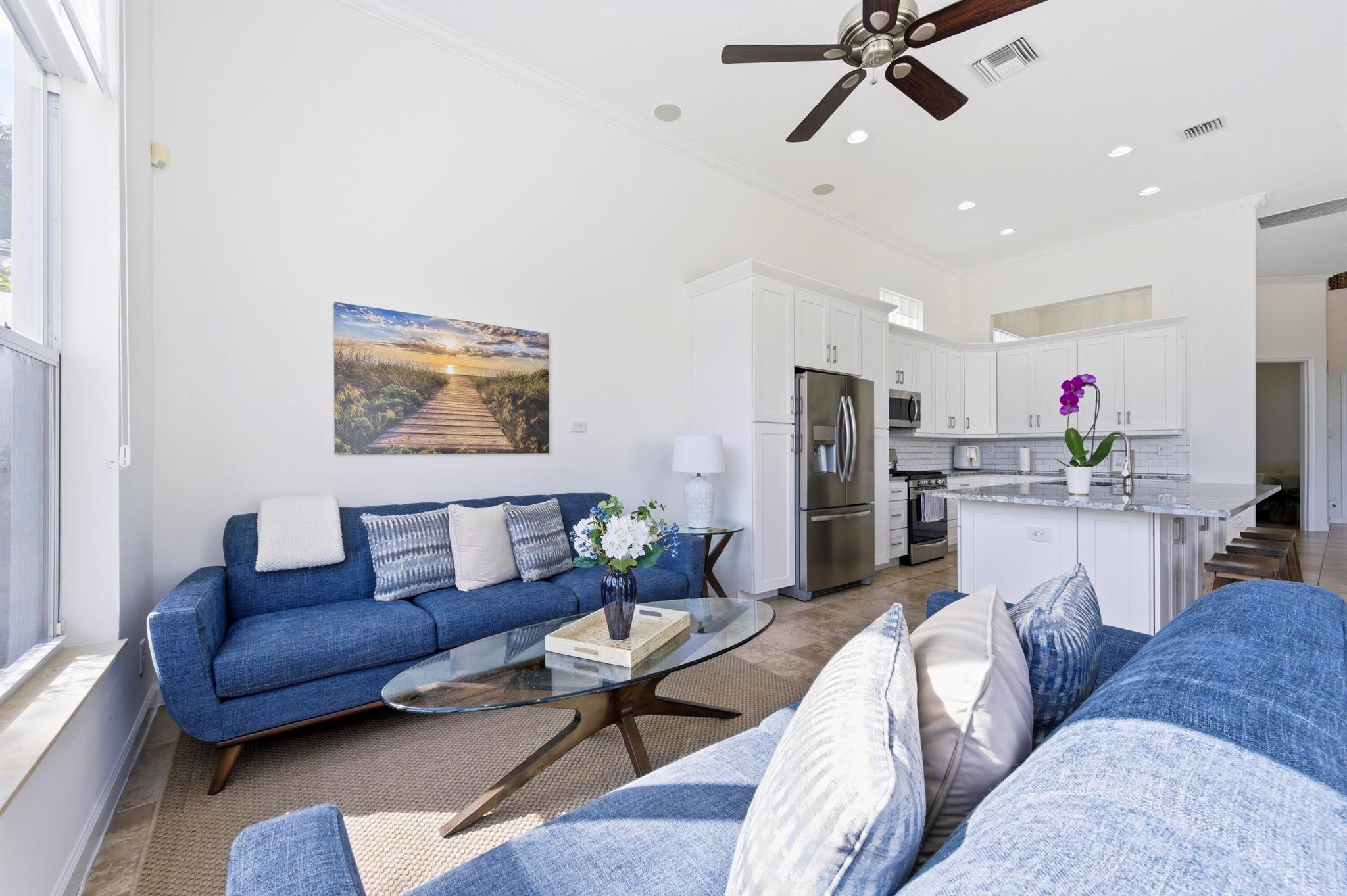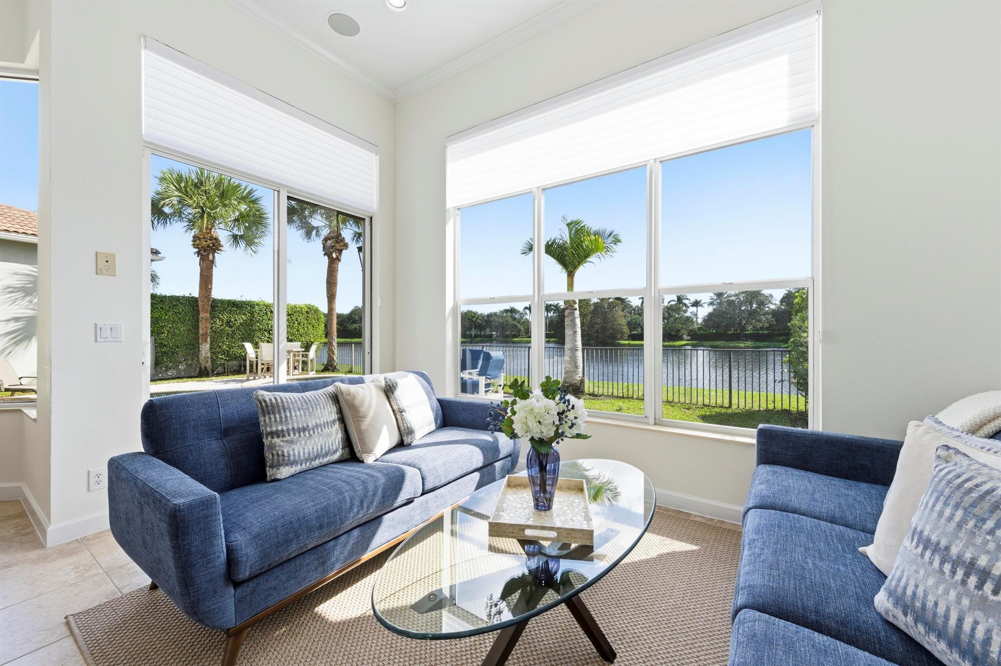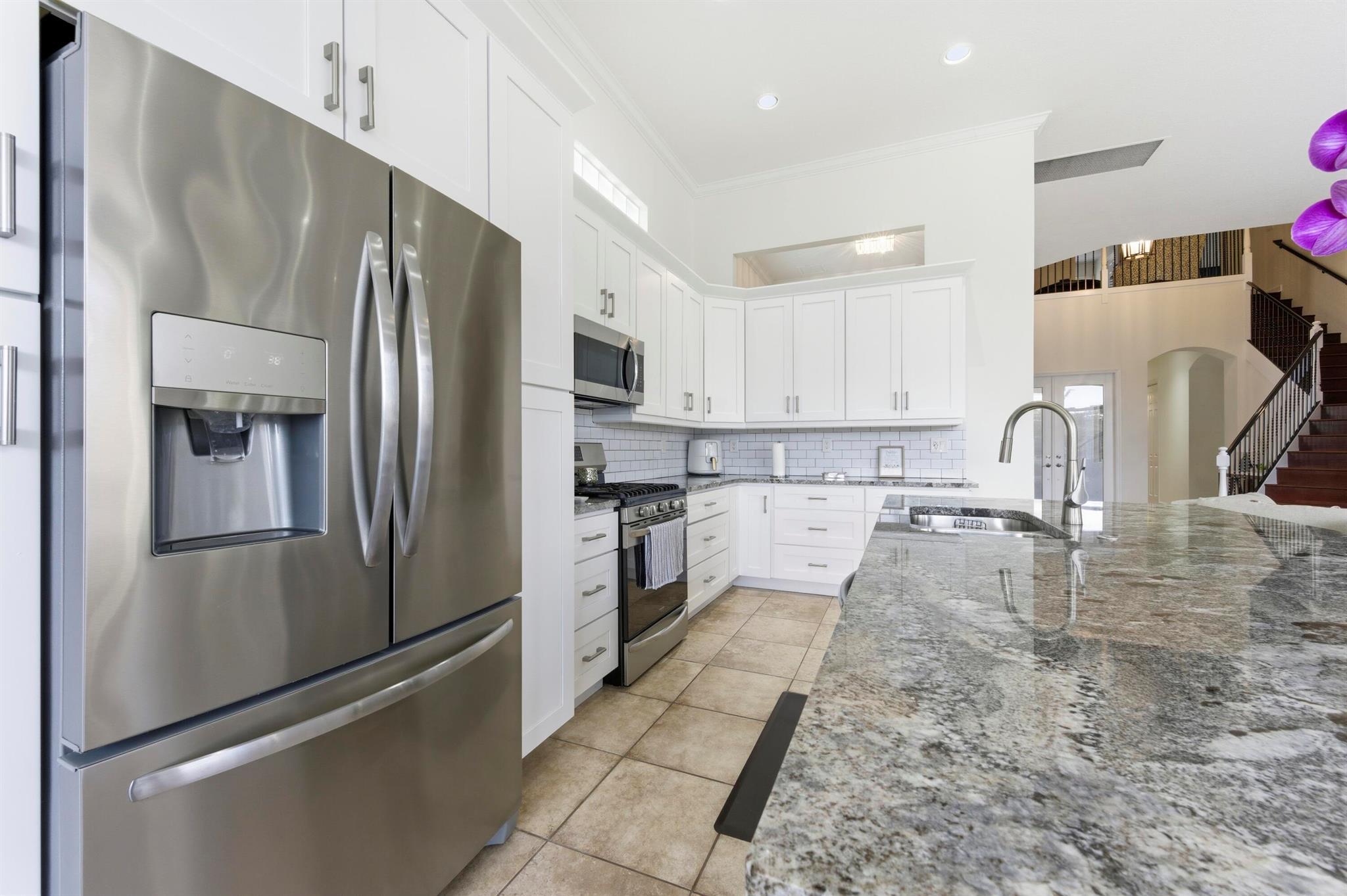 Step into this 4 bedroom plus loft and office/den on a beautiful lake. This extremely light,bright home features a redone kitchen with new cabinets, counter and subway tile backsplash. The stainless steel appliances and island sink have all been updated. The open spaces give you a view of the lake in many rooms in this home. The primary bedroom and another guest suite and office/ den is downstairs . There are 2 guest bedrooms with a jack and Jill full bathroom and a loft for your guests to enjoy upstairs. The backyard has a pool and spa and a lanai looking at the lake where there is a small pier for fishing or just taking in the lake view . There is a grassy area for children or dogs to run. Come see this well cared for, open airy space floorplan for absolute relaxation and enjoyment!!
