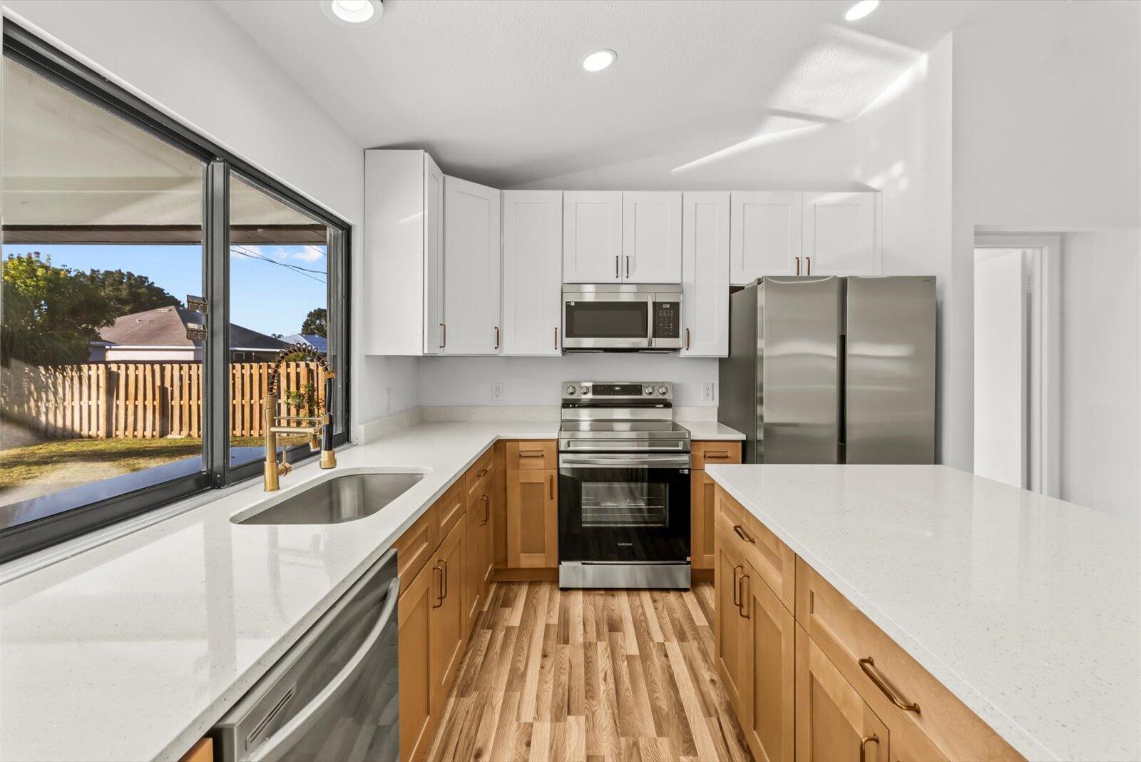 Showings must be scheduled with Showingtime. Exquisite 3-bedroom, 2-bathroom pool home, fully renovated in 2025. The gourmet kitchen boasts luminous Calacatta quartz countertops, bespoke soft-close shaker cabinetry, and premium high-end finishes, designed to inspire culinary excellence. Luxurious spa-inspired bathrooms feature sophisticated tile work, free standing tub, gorgeous vanities, and contemporary fixtures, elevating daily rituals to a serene escape. Impeccable waterproof laminate flooring, freshly painted interiors and exteriors, and brand-new, top-tier appliances blend style with functionality. No HOA restrictions. Seller is offering $3000 credit for fiberglass pool paint. 2025 Roof, 2018 AC, 2025 Water heater.
