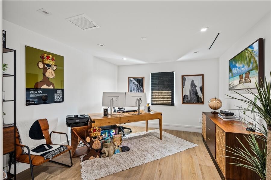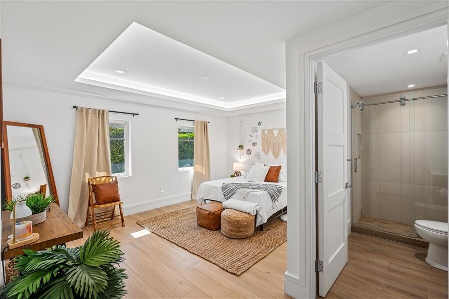 Custom Lake Ida residence, built in 2020, offers privacy at the end of cul-de-sac. Sunlit streamlined interiors showcase a pleasing white-on-white color palette complemented by pale wood-plank flooring and volume ceilings. The open-concept floor plan creates an effortless flow, with all major rooms opening to the lush tropically landscaped pool patio and fully-equipped outdoor kitchen