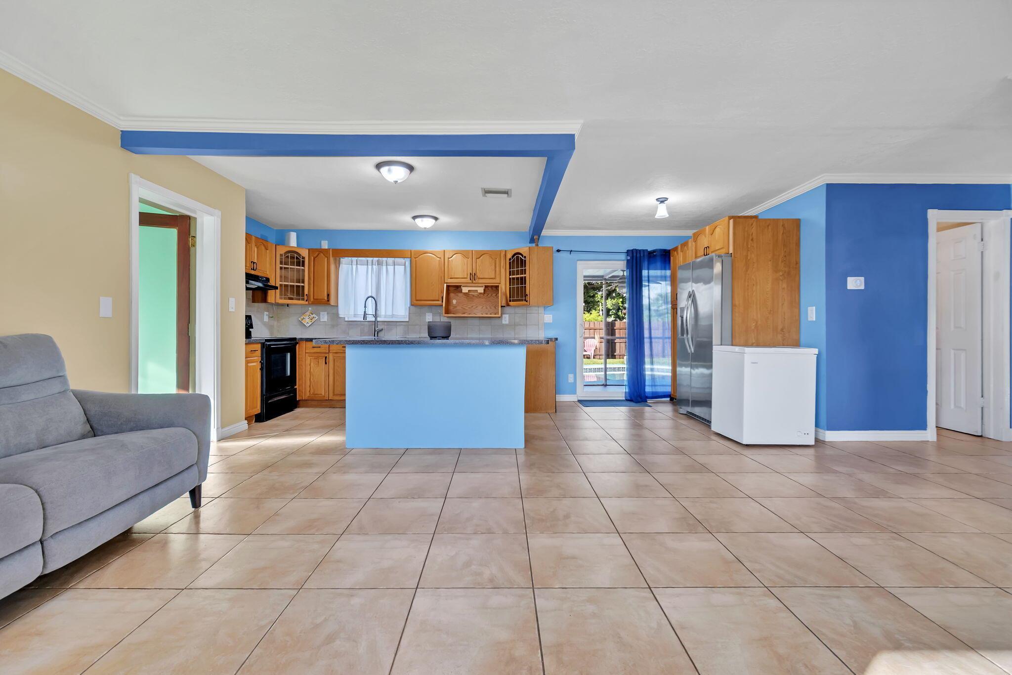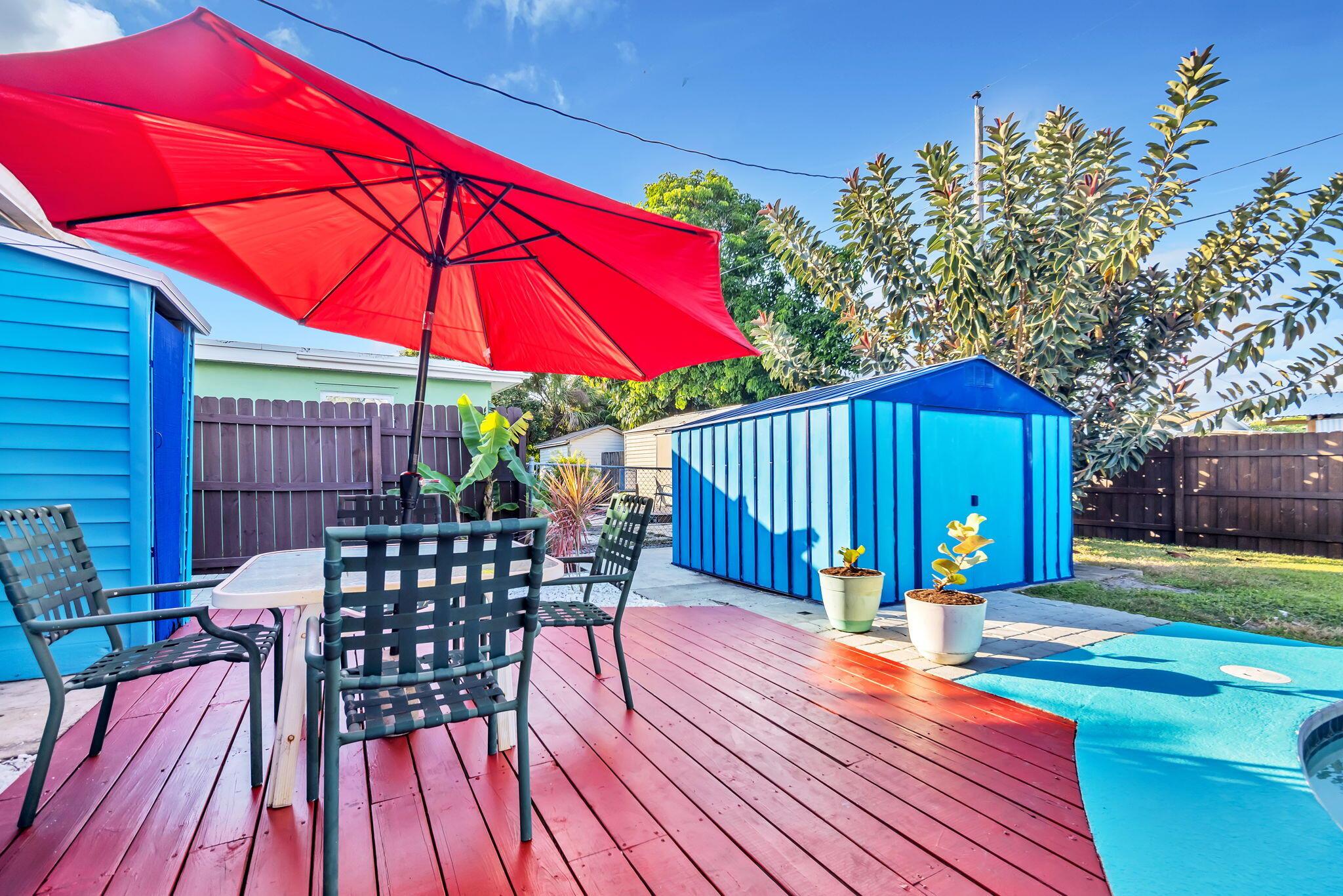 Welcome home to this inviting 3-bedroom, 2-bathroom pool property in the desirable Lake Worth Hills neighborhood. This home has been thoughtfully updated with a new roof, hurricane impact windows, newer AC, solar panels for energy efficiency, and refreshed fixtures and finishes throughout. Step outside to a private, fenced backyard oasis featuring lush, well-kept greenspace, fruit trees, a sparkling pool, and an open terrace--plus a screened outdoor living area perfect for al fresco dining. A large storage shed adds extra convenience. Inside, the open kitchen offers custom cabinetry, newer appliances, and a bar-height counter ideal for casual meals. The owner's suite includes an en-suite bath with a step-in shower. All of this is just moments from the beach, local restaurants, and