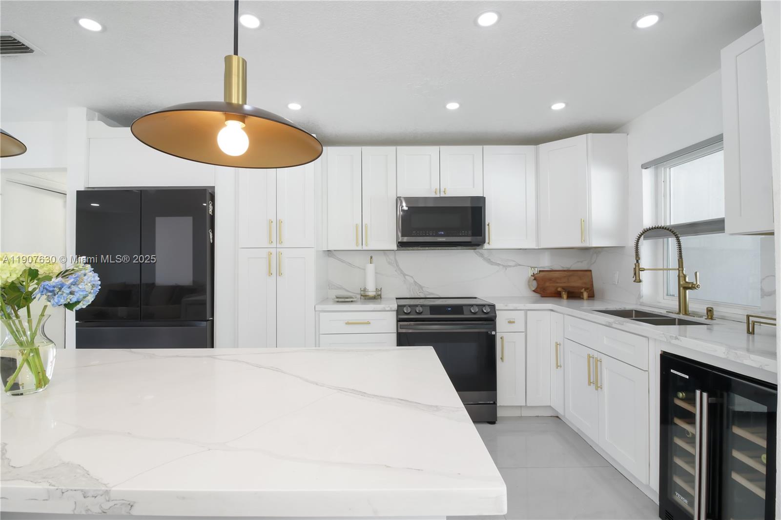 Beautifully remodeled 3-bedroom, 2-bath with pool home in Margate featuring a new A/C (2023), and brand-new flooring throughout. The modern kitchen offers a waterfall island, built-in wine cooler, smart refrigerator, and a dine-in layout filled with natural light. Enjoy impact windows and sliding doors, a 2-car garage with automatic door, washer/dryer, extra storage room or office, and two storage sheds. The covered patio overlooks a 9-ft deep saltwater pool with diving board. Fully fenced for privacy, perfect for relaxing or entertaining. Quiet neighborhood with sidewalks. Convenient to shopping, schools, Coral Square Mall, and major highways. No HOA!
