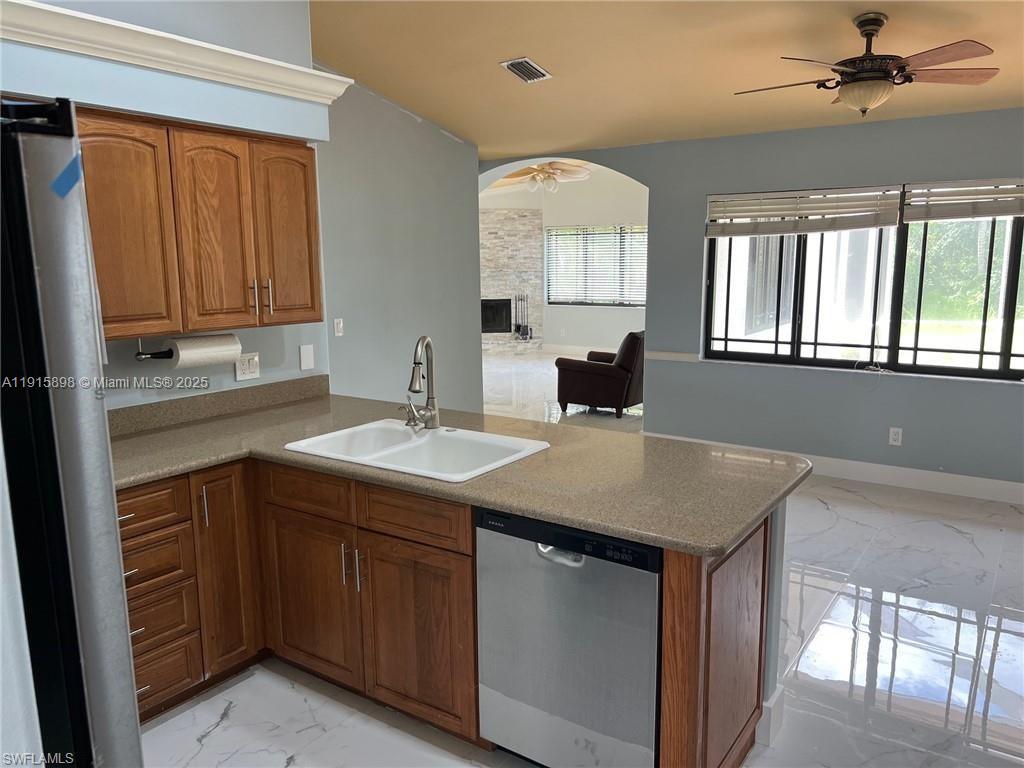 Super Private large, updated SF home on a preserve in a non-gated subdivision. 15 minutes away from Fort Myers Beach. Spacious & cozy house that includes a large family room with working fireplace, large living room & dining area next to kitchen. Master bedroom joins a master-suite or use it as a 5th bedroom or study. High ceilings throughout home. Enjoy your Roman style heated pool in your large mansard screened lanai area with total privacy. Back yard has coconut trees, a preserve & trees on the left and right of the house for bathing in complete privacy. The shingle roof was replaced 2 years ago. Beautiful porcelain tile floors throughout. Your only a few blocks away & walking distance from supermarket, shopping, banks, & religious Temple/Church. Put this house on your list to see.