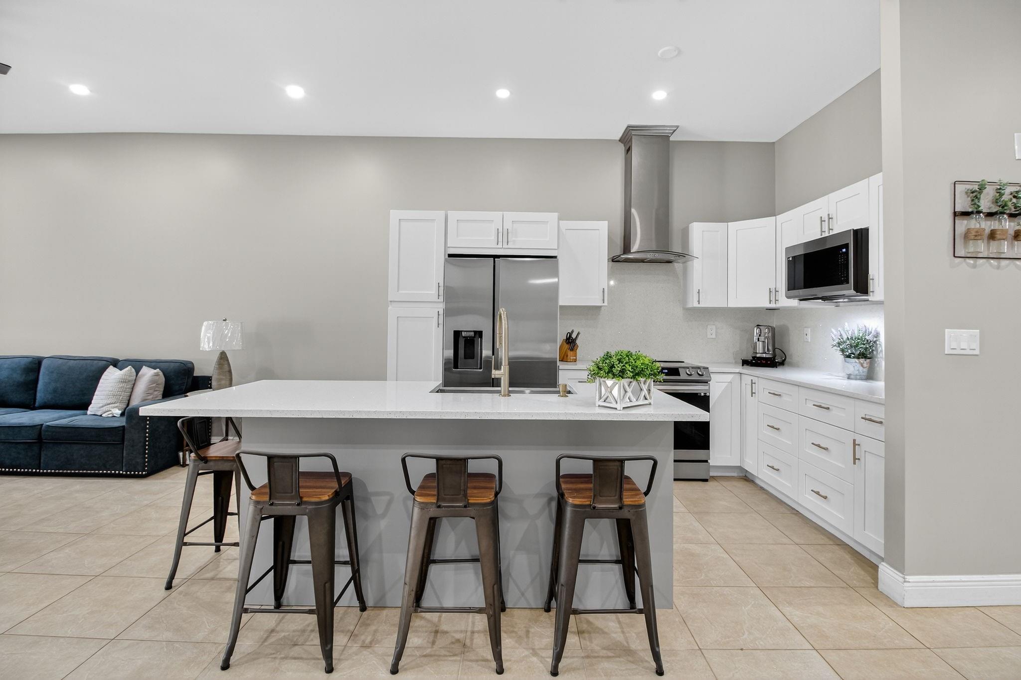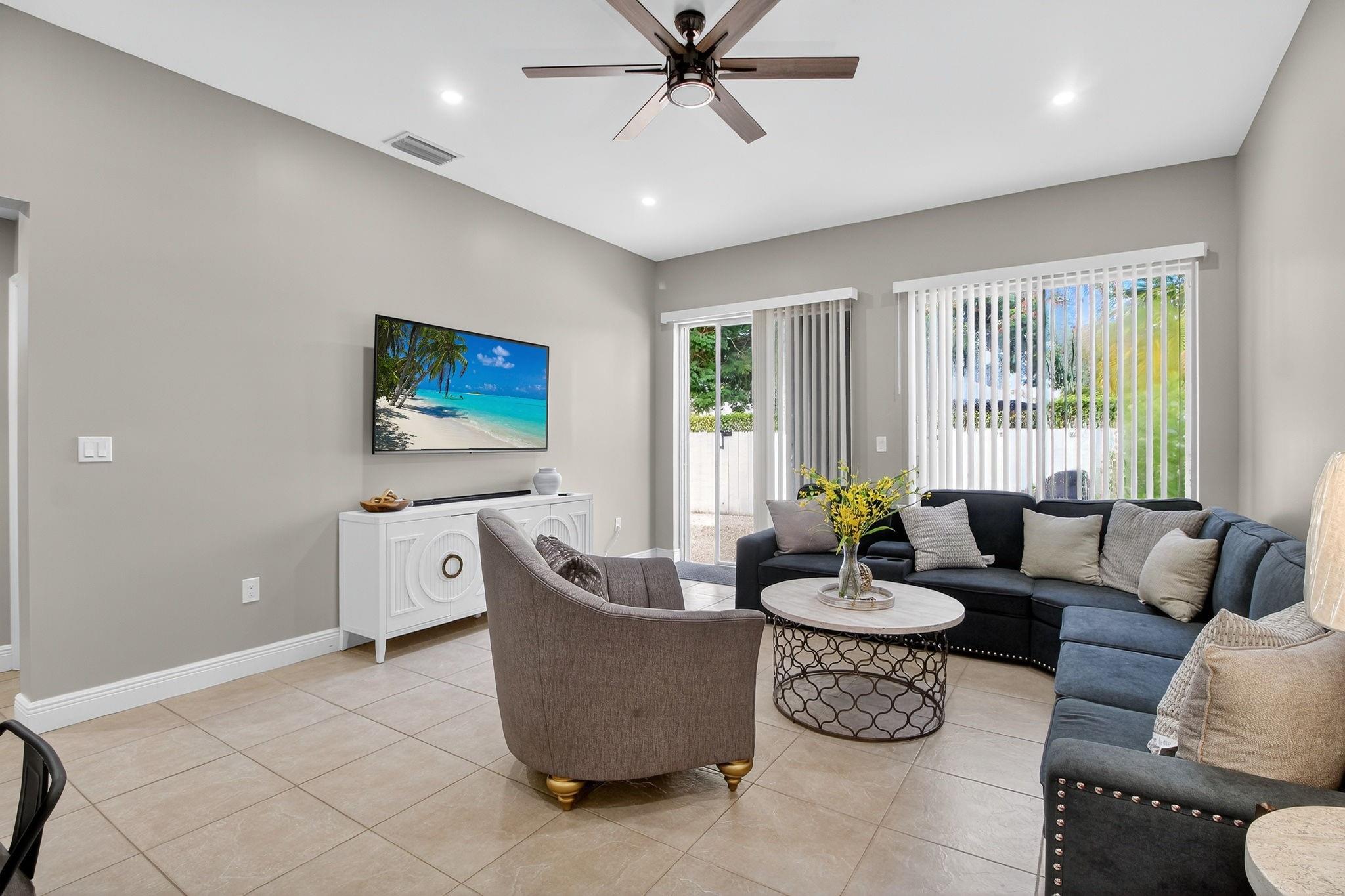 Step into this beautifully renovated 3BR/2BA home with a one-car garage, offering modern luxury and timeless style. Freshly painted interiors feature an open living and dining area and a stunning kitchen with quartz waterfall countertops and stainless-steel appliances. Both bathrooms are elegantly updated, and the spacious primary suite includes an oversized bath and walk-in closet. Enjoy a private, fully fenced backyard with a charming patio—perfect for relaxing or entertaining. Located in the highly sought-after POINCIANA AT SUNSET LAKES community with 24/7 security and minutes from parks, dining, shops, the library, and Baptist Health Hospital.