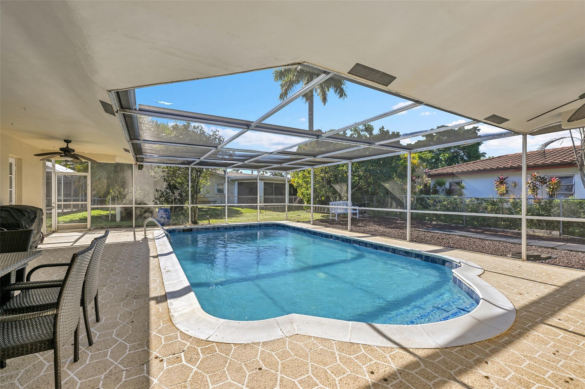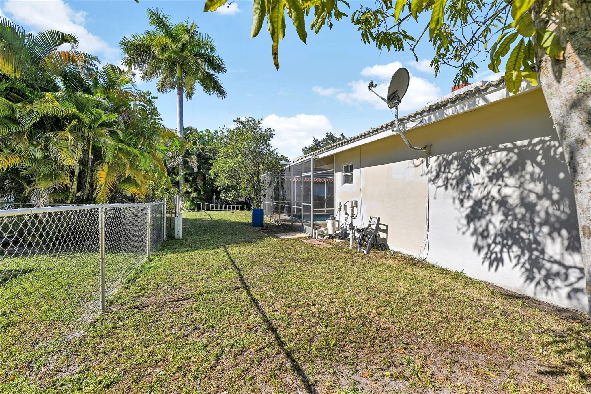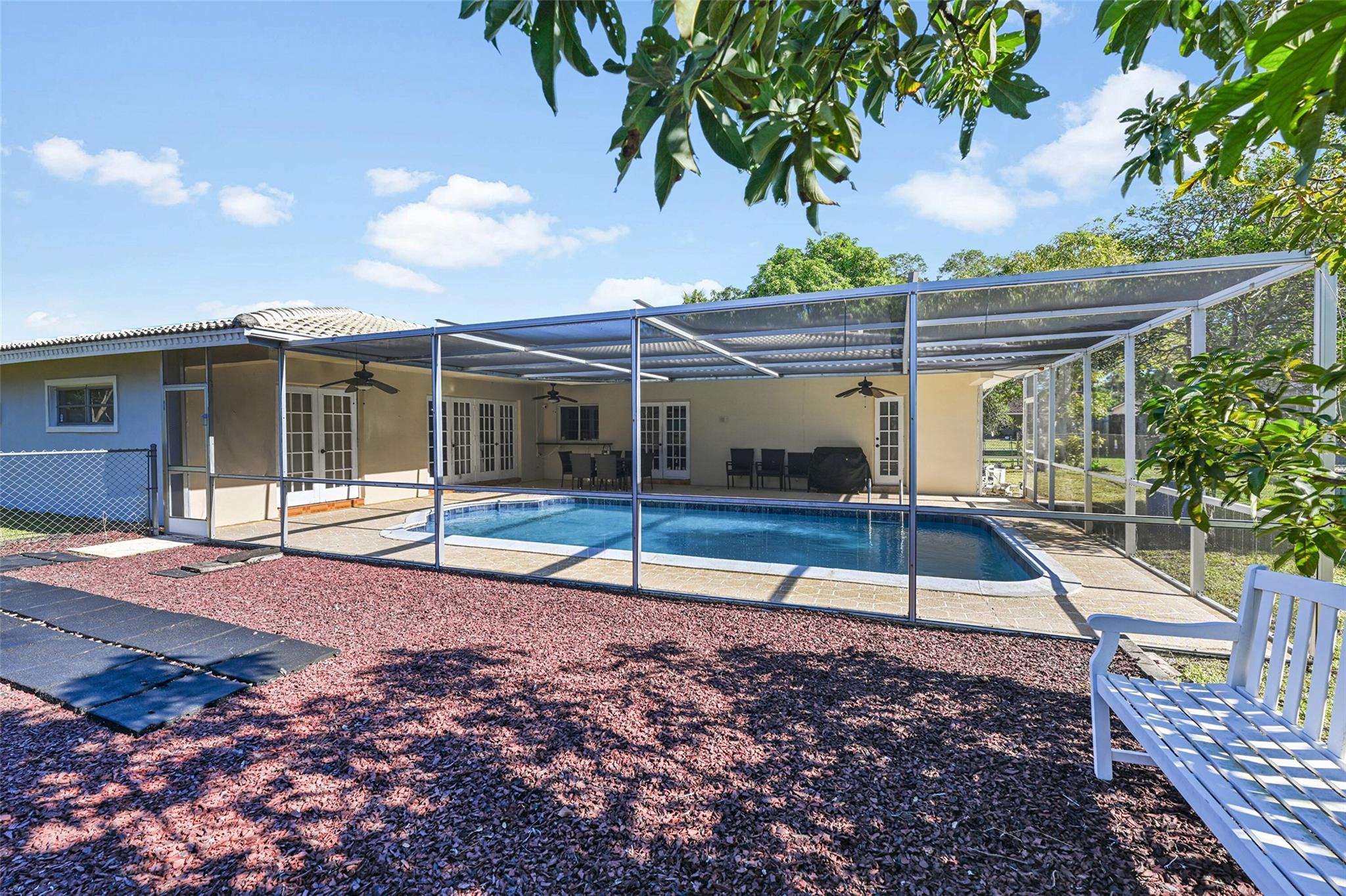 Spacious 4BR/2BA single-family home on an OVERSIZED CORNER LOT over a quarter acre—perfect for a large family seeking space and comfort. This home features a bright split floor plan with tile and laminate flooring, French doors, and a warm, inviting family room centered around a charming brick fireplace. The kitchen offers granite countertops, stainless-steel appliances. Step outside to an expansive fenced yard with mature mango trees and a screen-enclosed pool, ideal for gatherings, relaxing weekends, and year-round outdoor fun. The property also includes a 2-car garage and a circular driveway that provides EXTENSIVE parking for family and guests. Located in a welcoming, family-friendly neighborhood with NO HOA, offering freedom, privacy and convenience close to parks and schools.