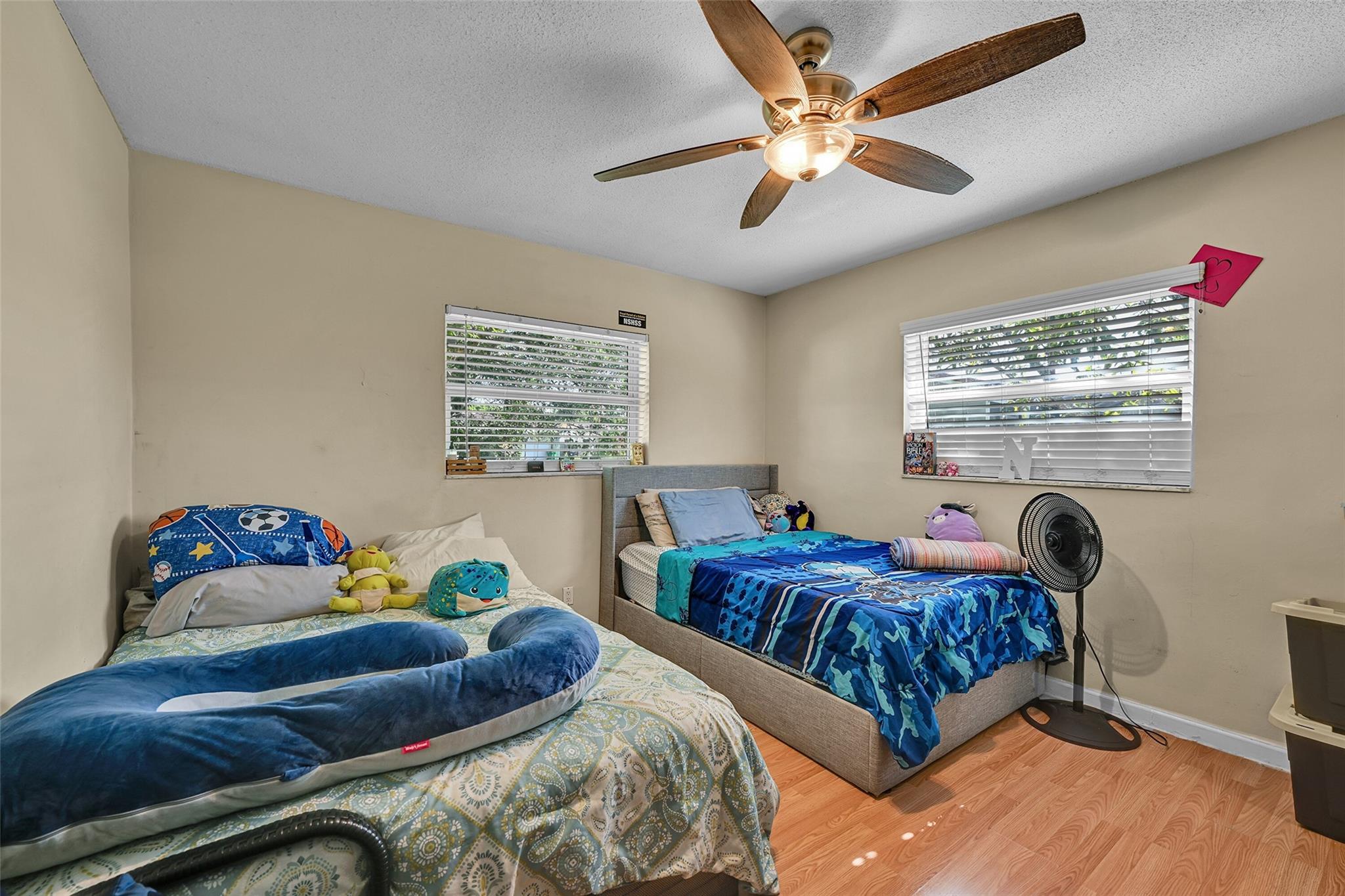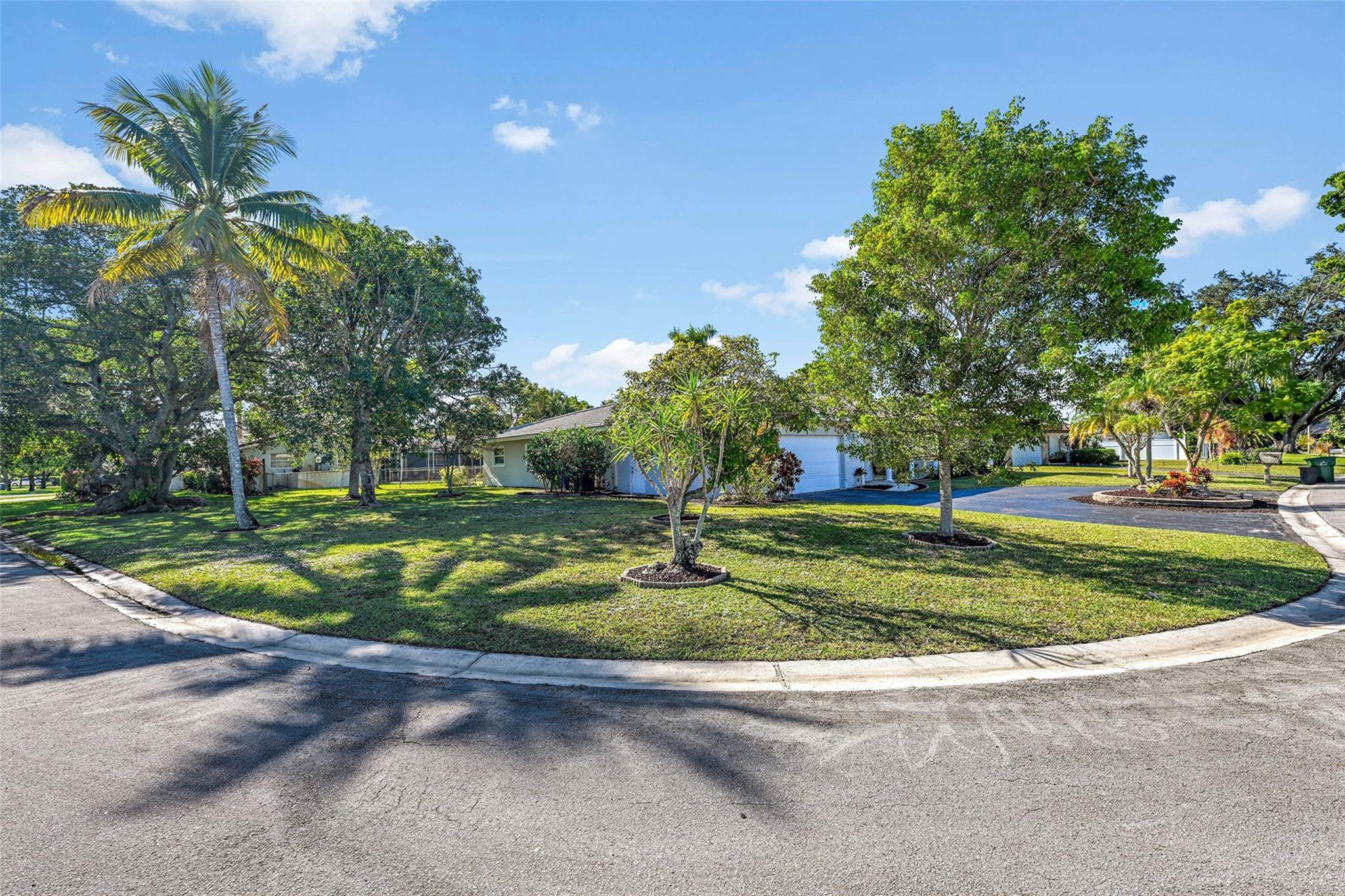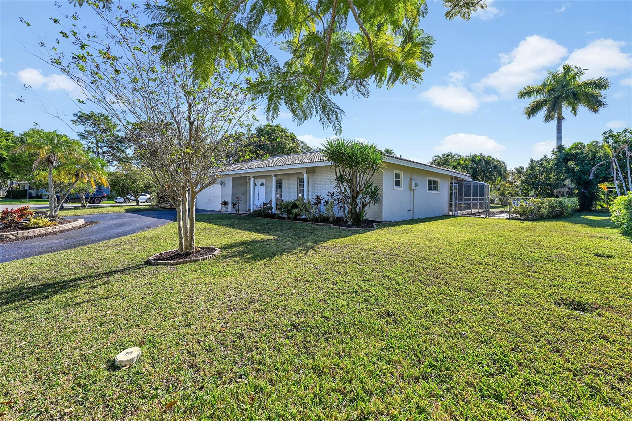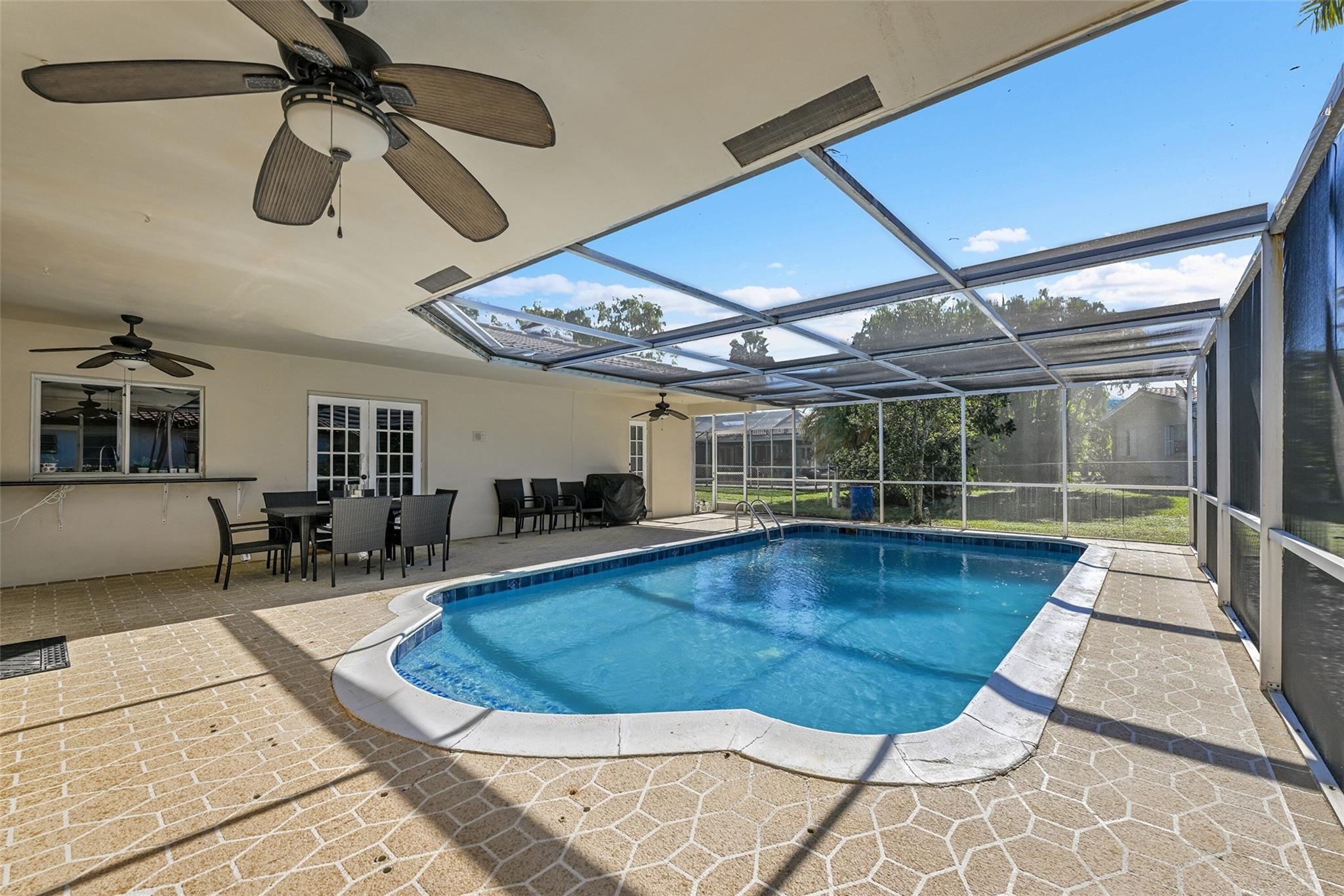 Spacious 4BR/2BA single-family home on an OVERSIZED CORNER LOT over a quarter acre—perfect for a large family seeking space and comfort. This home features a bright split floor plan with tile and laminate flooring, French doors, and a warm, inviting family room centered around a charming brick fireplace. The kitchen offers granite countertops, stainless-steel appliances. Step outside to an expansive fenced yard with mature mango trees and a screen-enclosed pool, ideal for gatherings, relaxing weekends, and year-round outdoor fun. The property also includes a 2-car garage and a circular driveway that provides EXTENSIVE parking for family and guests. Located in a welcoming, family-friendly neighborhood with NO HOA, offering freedom, privacy and convenience close to parks and schools.