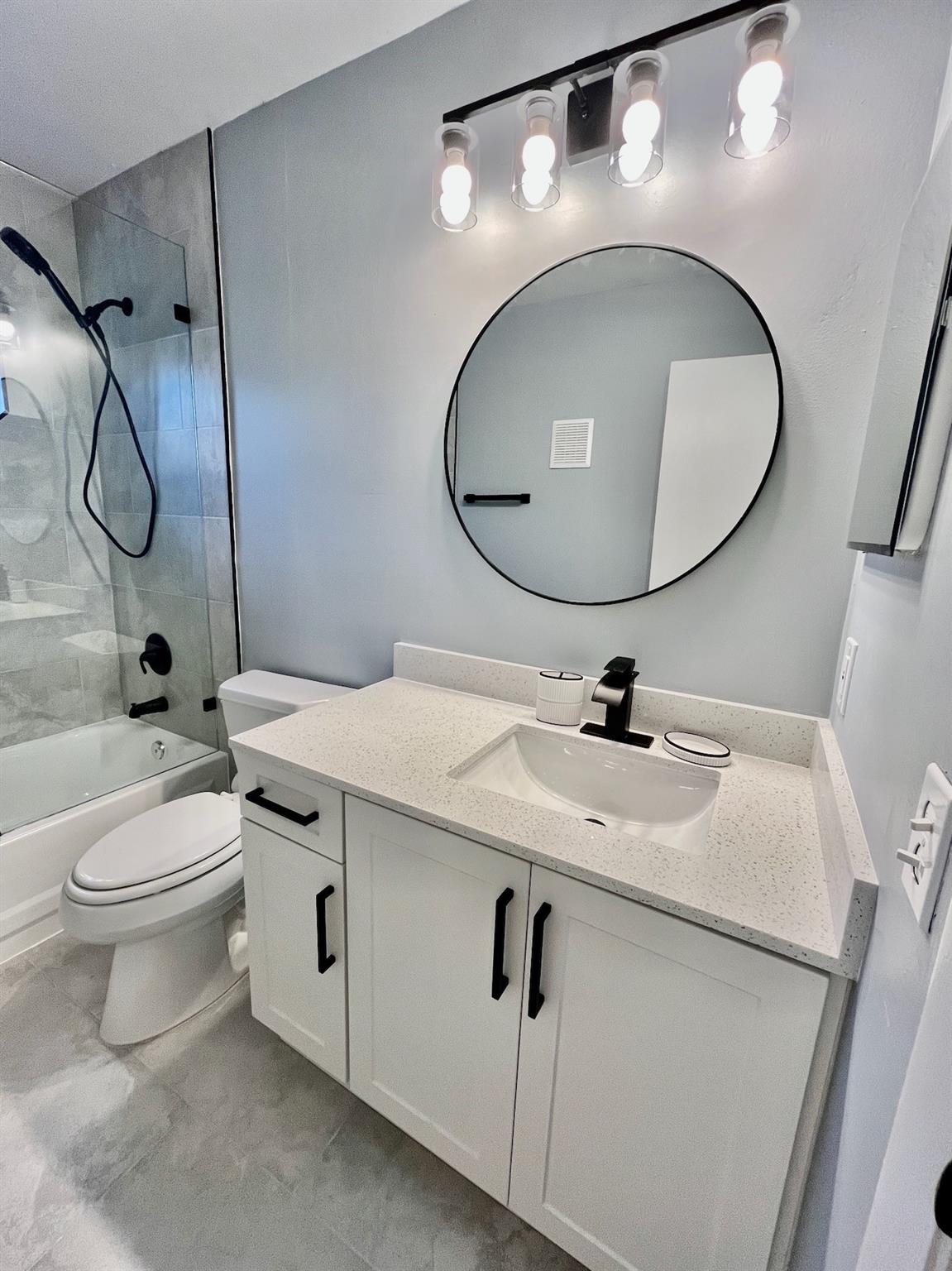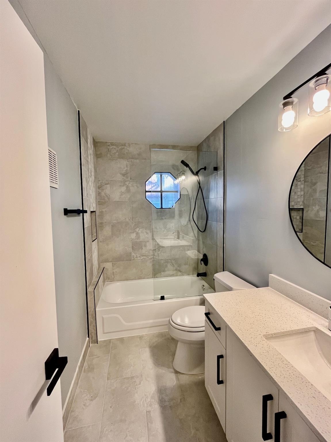 Large, fully upgraded three bedroom, two bath corner townhome in well maintained gated community. Property features lake view with private screened in patio, hurricane shutters and one car garage. New kitchen cabinets and bathroom vanities and full size washer/dryer. Glass enclosed showers an