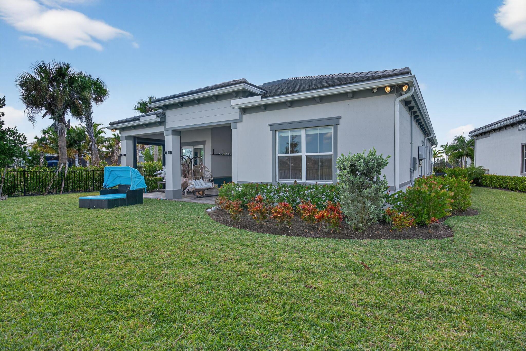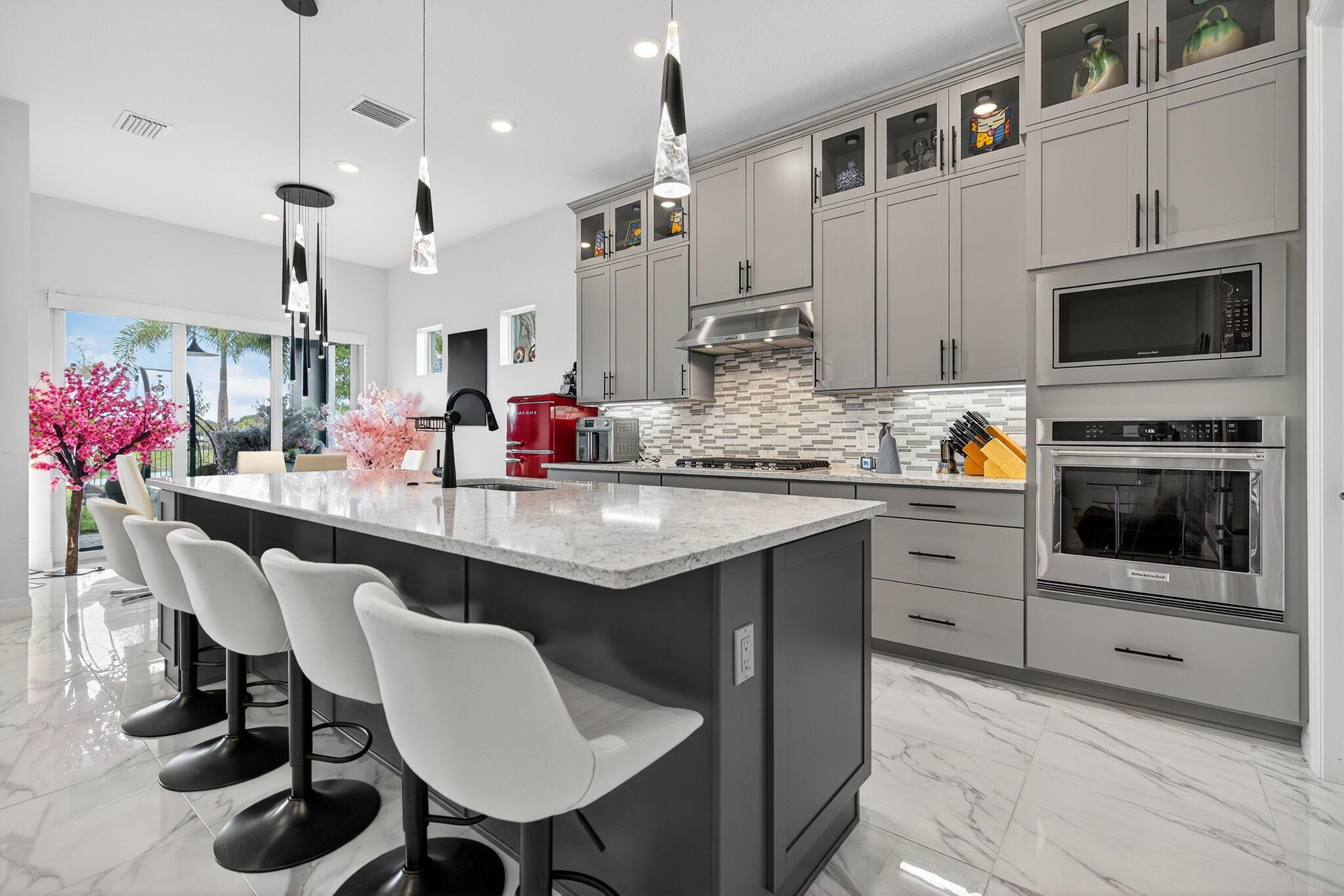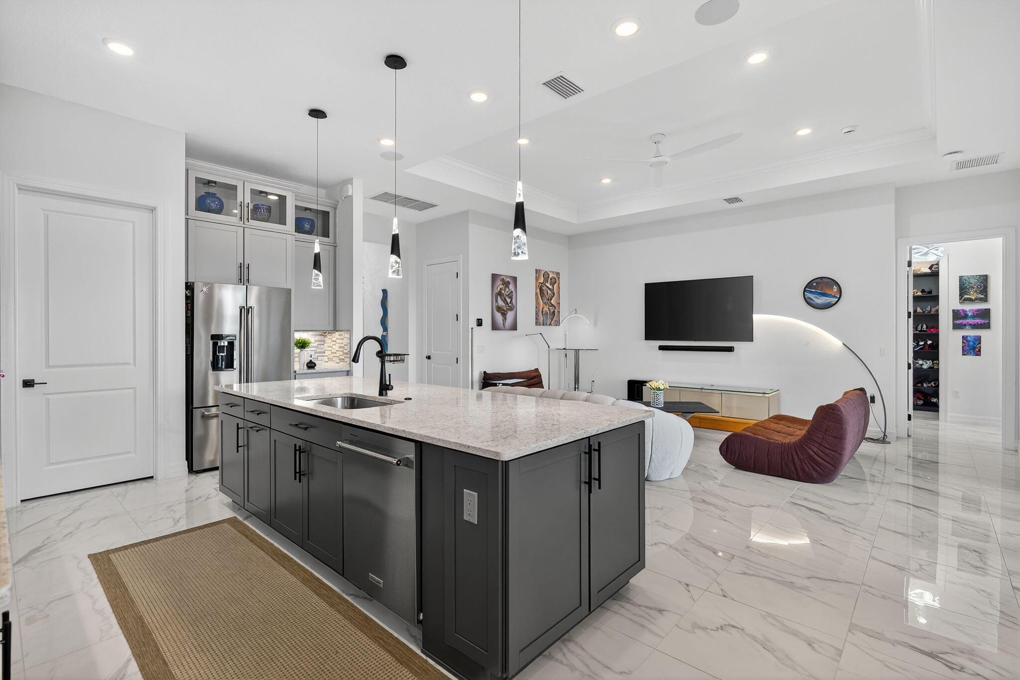 This beautifully upgraded Prestige Model in Avenir sits on a premium wide-water lakefront lot with no rear neighbors and offers more than $150,000 in high-end improvements. The home features modern marble-look porcelain tile throughout, designer lighting, and a fully integrated smart-home system with cameras, alarm monitoring, Sonos speakers, and professional structured wiring that provides hard-wired internet, TV, and audio connections in multiple rooms. The gourmet kitchen includes stacked 42'' cabinets, soft-close drawers, roll-out trays, extended island panels, matte black hardware, and upgraded quartz countertops. The great room opens to peaceful lake views through oversized sliders, creating a bright and open living space. The primary suite features a custom slat accent