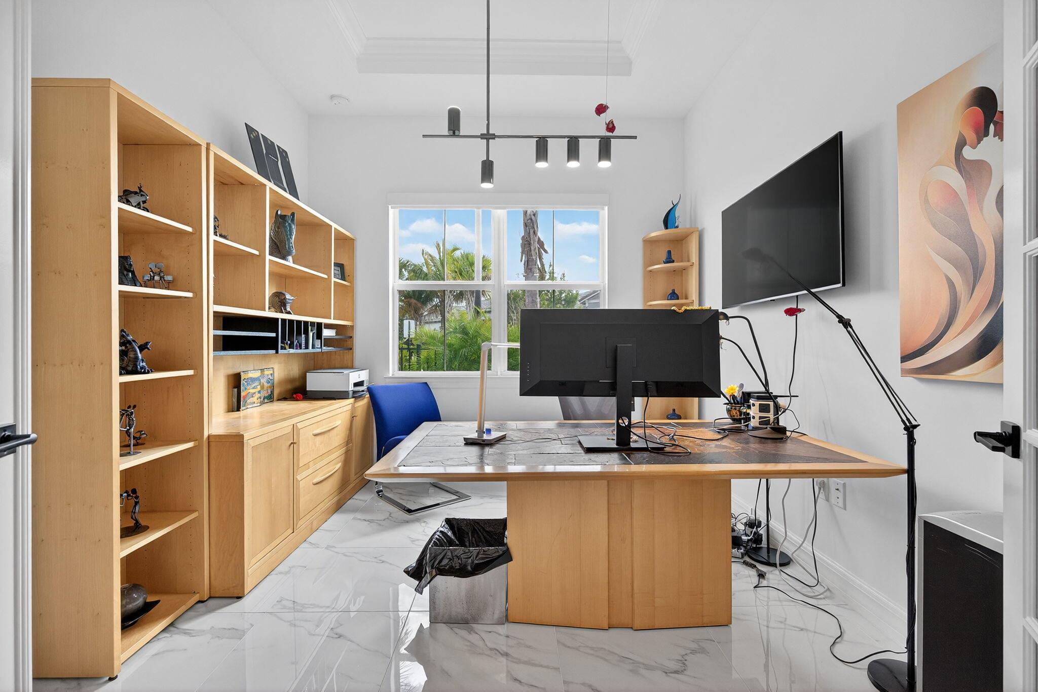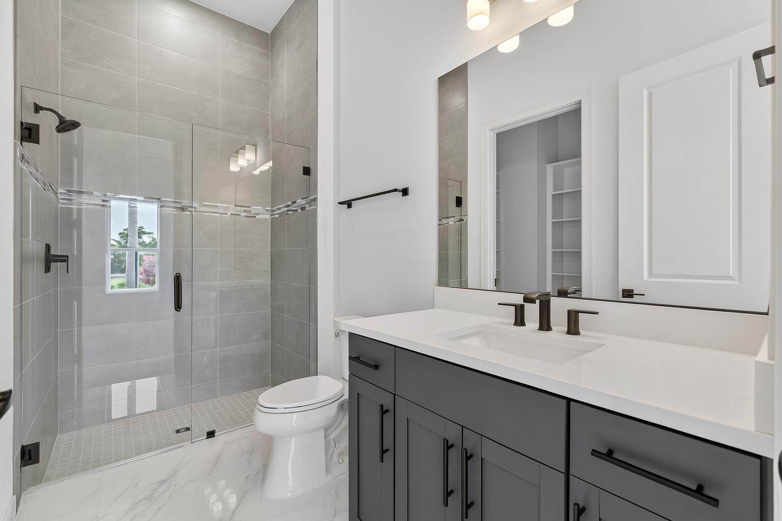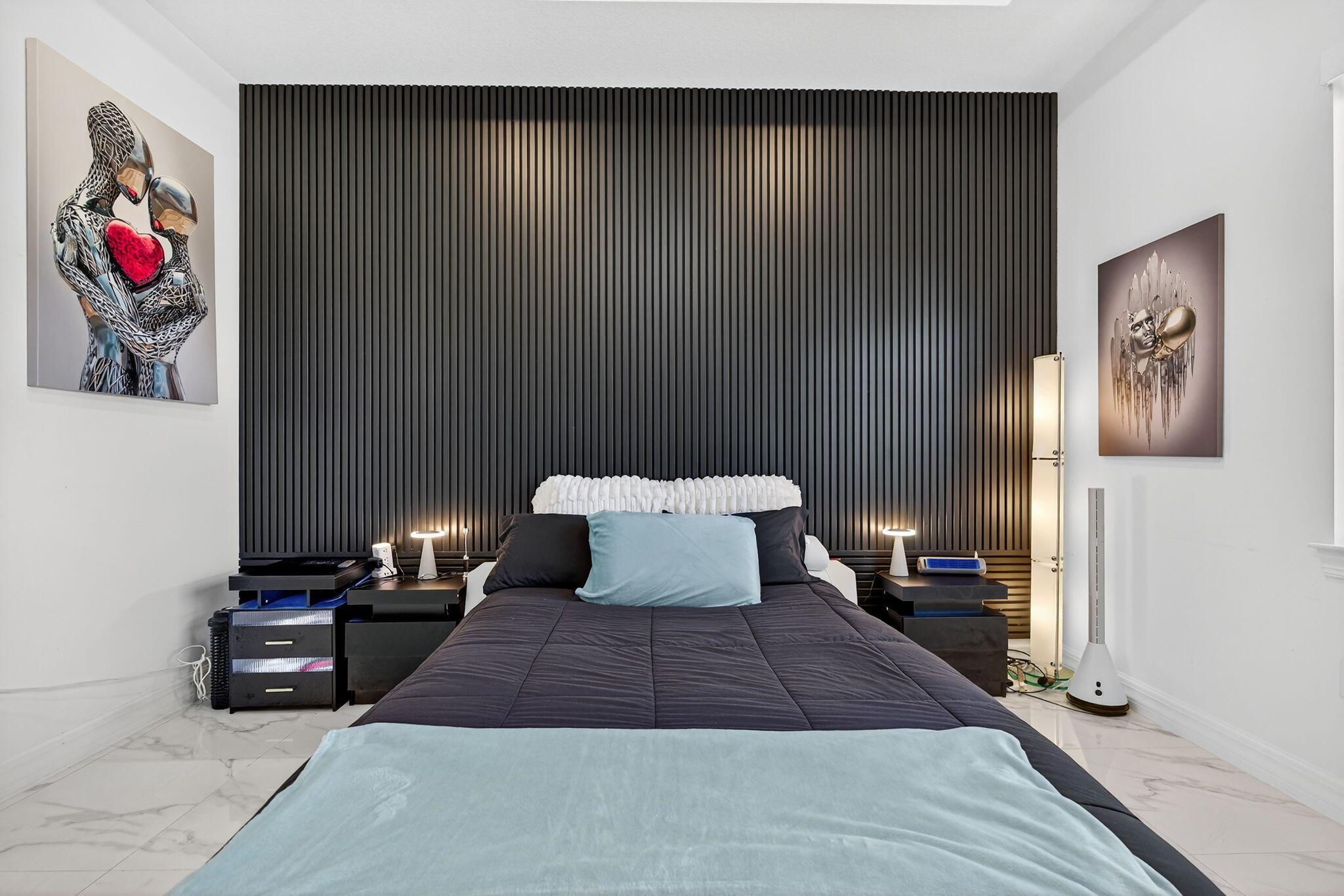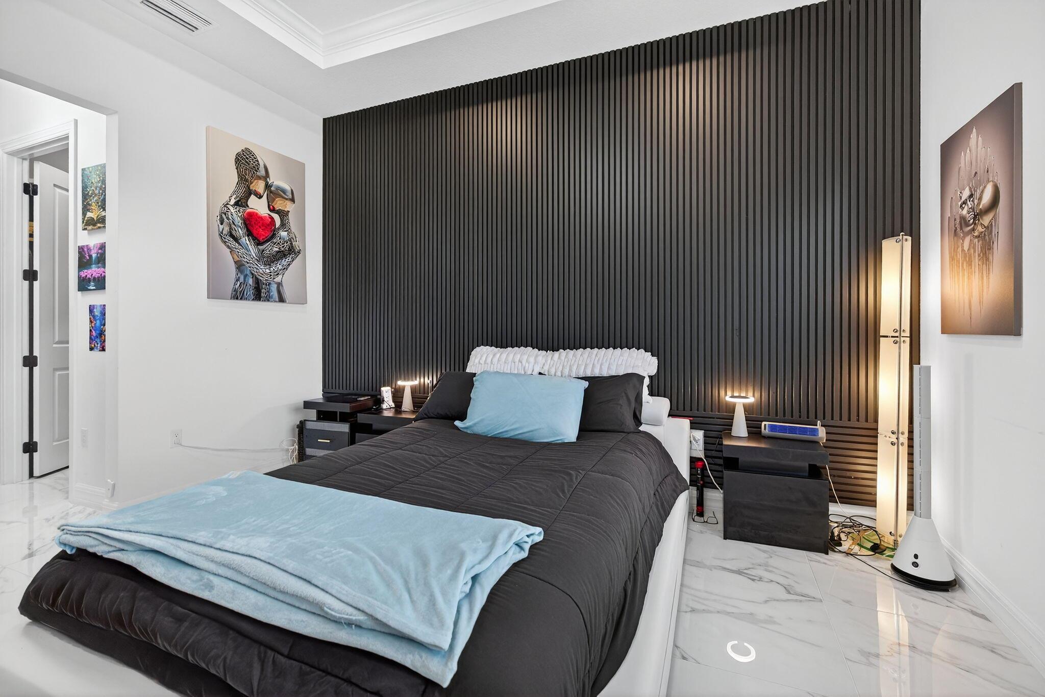 This beautifully upgraded Prestige Model in Avenir sits on a premium wide-water lakefront lot with no rear neighbors and offers more than $150,000 in high-end improvements. The home features modern marble-look porcelain tile throughout, designer lighting, and a fully integrated smart-home system with cameras, alarm monitoring, Sonos speakers, and professional structured wiring that provides hard-wired internet, TV, and audio connections in multiple rooms. The gourmet kitchen includes stacked 42'' cabinets, soft-close drawers, roll-out trays, extended island panels, matte black hardware, and upgraded quartz countertops. The great room opens to peaceful lake views through oversized sliders, creating a bright and open living space. The primary suite features a custom slat accent