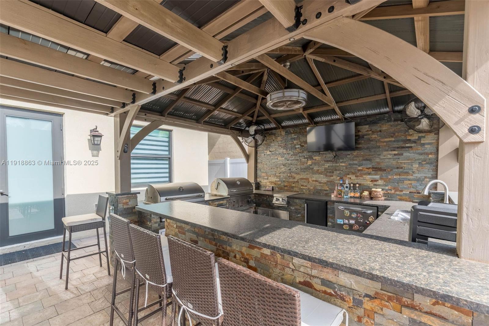 This fully remodeled home blends modern design, quality upgrades, and exceptional outdoor living in one of Hialeah’s most desirable private communities. Inside, the residence features a complete renovation with bright open spaces, large-format porcelain flooring, warm wood-style accents, and fully upgraded impact windows for security, efficiency, and sound reduction. The open-concept living and dining areas include recessed LED lighting, modern window treatments, and a custom glass-railing staircase that adds architectural sophistication. A dedicated office/flex room provides valuable versatility for work, study, or multi-use needs. The backyard is the highlight, offering a true Florida outdoor oasis. A custom pergola with exposed beams, stone details, and integrated lighting creates a perfect shaded lounge area. The fully equipped outdoor kitchen includes a charcoal grill, gas grill, built-in refrigerator, ice chest, bar seating, and premium stone countertops ideal for gatherings and weekend cooking. The property sits directly on a peaceful lake with a relaxing zen fountain, providing a serene backdrop for mornings, sunsets, and outdoor dining. Additional features include a two-car garage, upgraded lighting fixtures, modern blinds, beautiful landscaping, and a convenient location near top schools, shopping, dining, and expressways. This move-in-ready home offers modern comfort, style, and an outstanding lakeside lifestyle rarely found on the market.