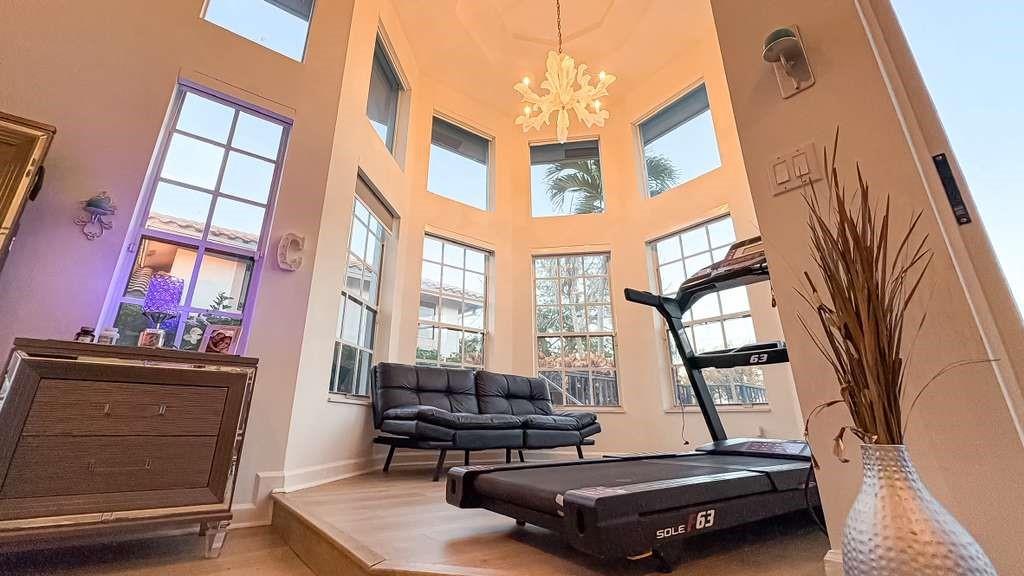 Panoramic golf and water views! Elegant home located on the 8th Fairway featuring a newer roof, newer AC units, freshly polished marble floors, and newly installed wood-plank flooring in bedrooms and office. Light and bright split floor plan with soaring ceilings and abundant recessed lighting. Offers four en-suite bedrooms plus office, four and a half baths including cabana bath, spacious master suite with sitting area and large glass sliders overlooking the pool, patio, and golf course. Master bath includes water closet, bidet, jacuzzi tub, walk-in shower, and ample closet. Gourmet kitchen with built-ins, wine closet. Beautiful backyard with covered patio, summer kitchen, and pool with jacuzzi overlooking the fairway. 3-car garage with built-ins. Located in a gated golf course community
