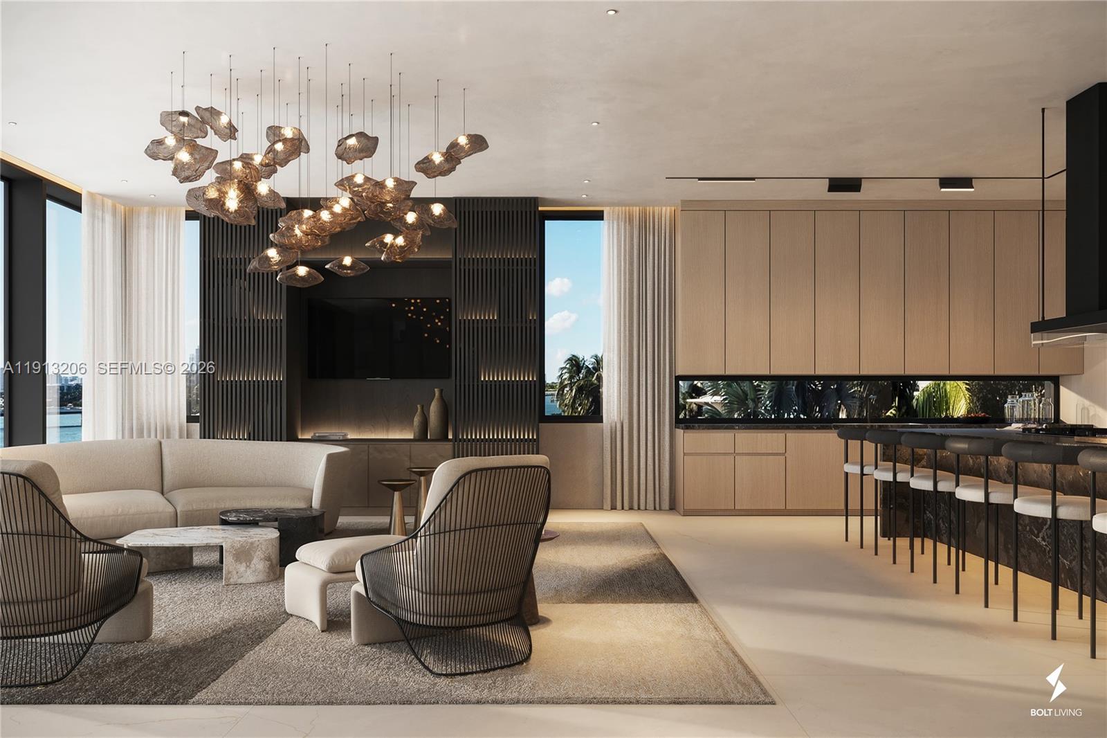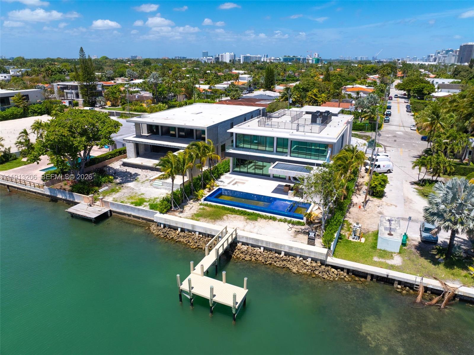 Brand new modern waterfront masterpiece in Surfside! Set on a rare corner lot showcasing 9,900 SF under A/C, this architectural masterpiece by Kobi Karp redefines modern elegance. Designed for seamless indoor/outdoor living with 75 ft of direct south facing frontage with no fixed bridges, sunset views, & walkability to the beach, places of worship, & top dining. The 1st level features Italian kitchen cabinetry & millwork, a junior primary suite, office, chef’s kitchen, cabana, & generous living areas. Upstairs, a dramatic primary suite showcases panoramic water views. Additional spacious bedrooms, a water facing pajama lounge with large private terrace, and gym with sauna/steam offer luxury living at its finest. Smart home technology & marble finishes elevate every detail. Crafted for those who expect nothing less than exceptional. Delivering Early 2026.