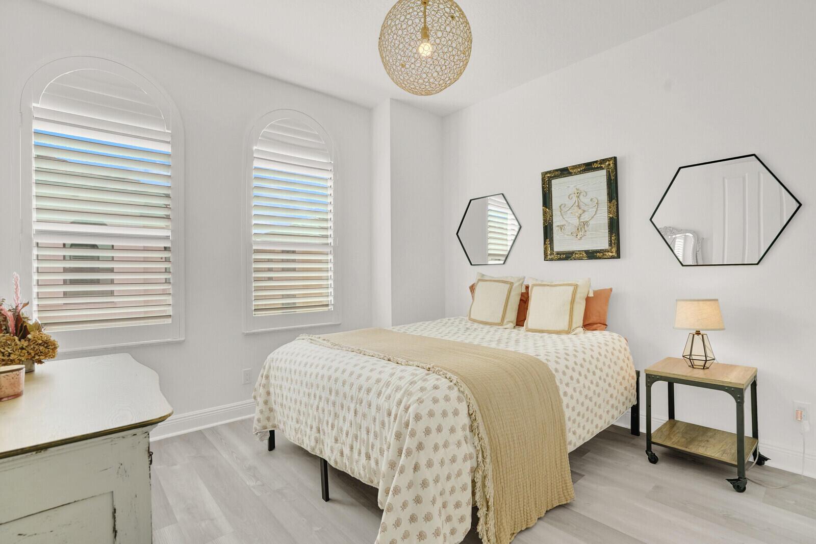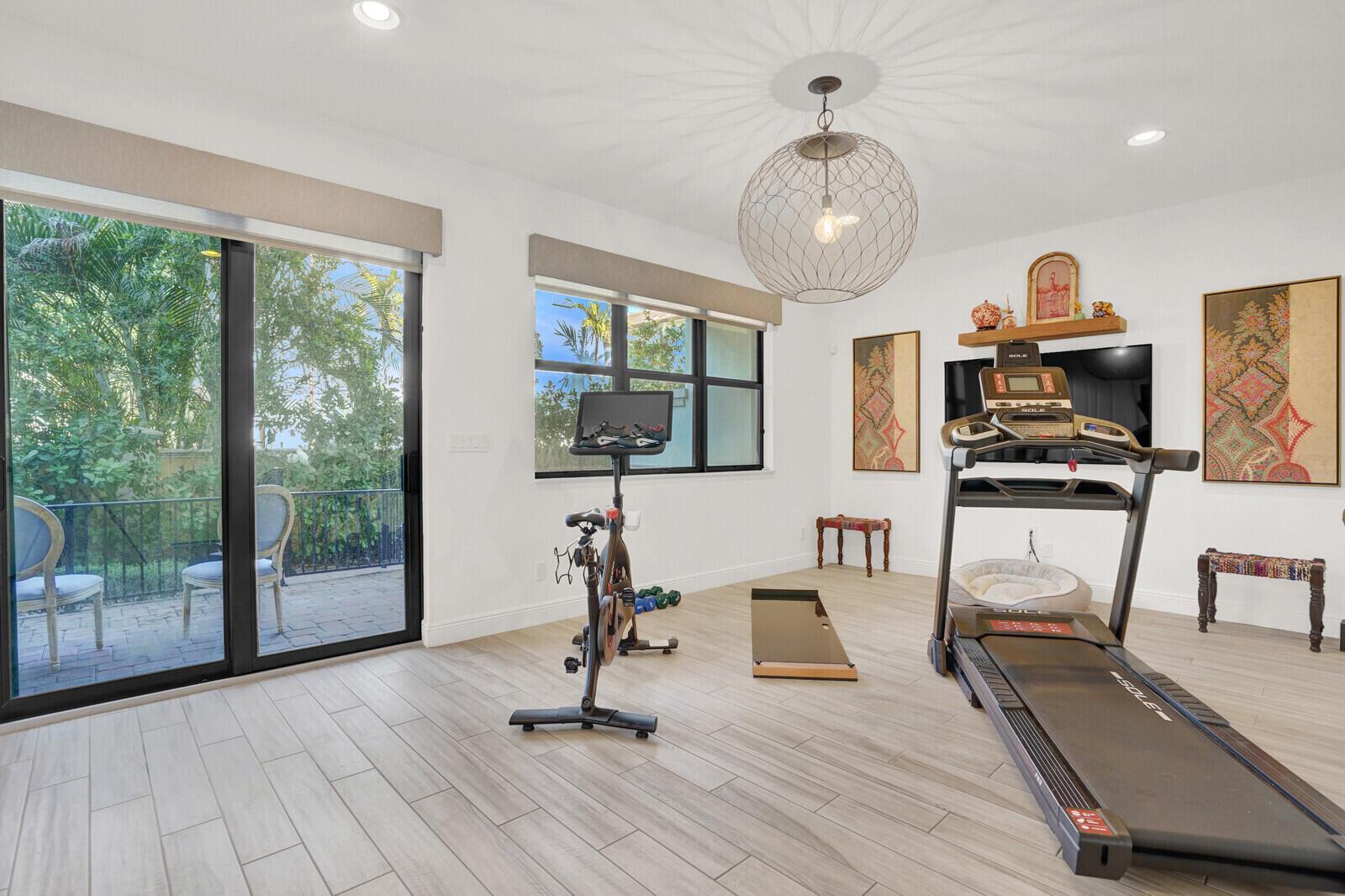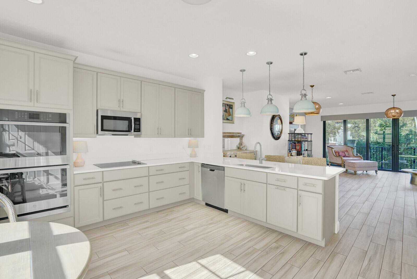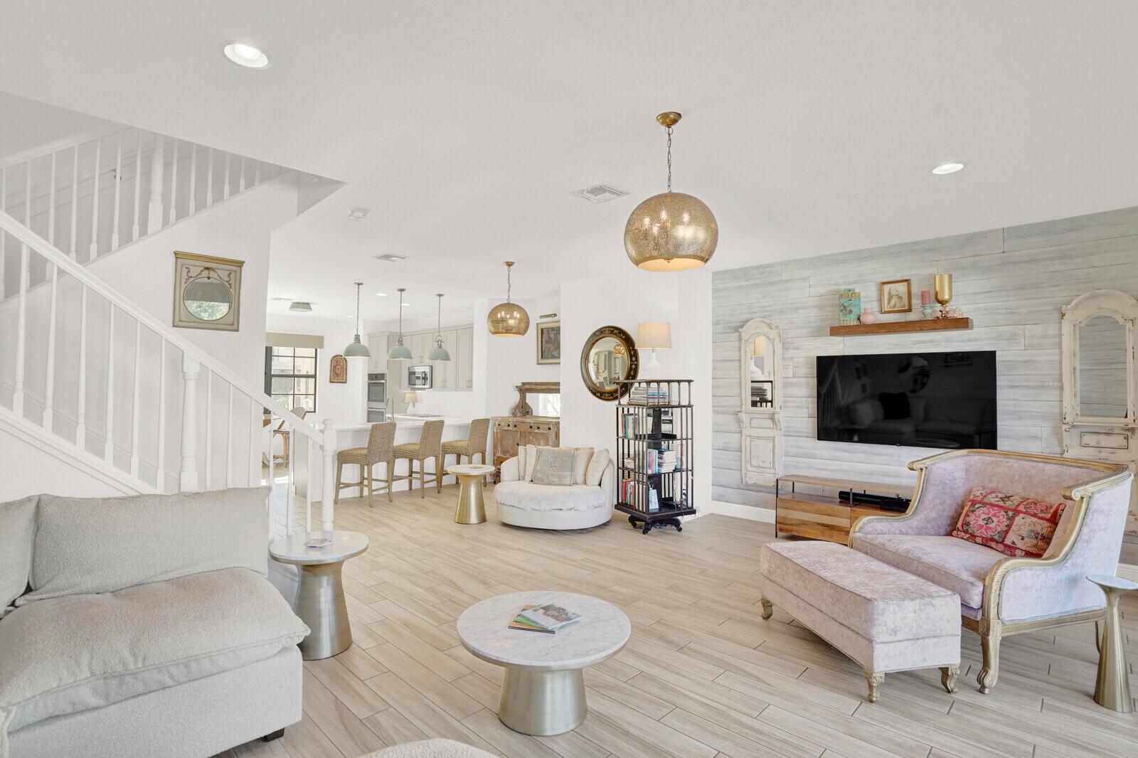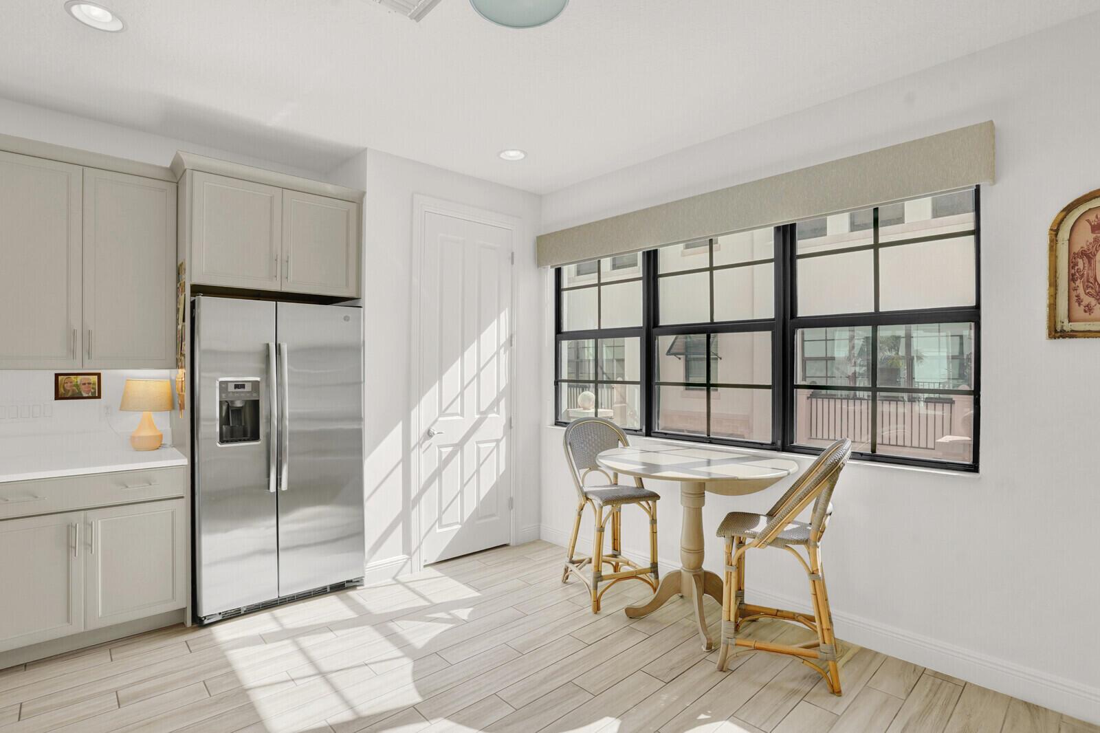 This beautifully designed townhome offers more than 2,400 square feet under air and a total of 3,294 square feet of thoughtfully crafted living space, blending modern comfort with elevated coastal style. Upon entering, you're welcomed by a versatile flex space that functions perfectly as a home office, fitness room, or additional living area. Wood-look tile flooring, custom window treatments, a convenient half bath, and a fenced private patio enhance both style and practicality.Upstairs, the main living area unfolds in a bright, open-concept layout highlighted by soaring ceilings and refined finishes. A dramatic wall of windows fills the space with natural light and opens to a private, oversized balcony, ideal for morning coffee, evening cocktails, alfresco dining, or simply enjoying