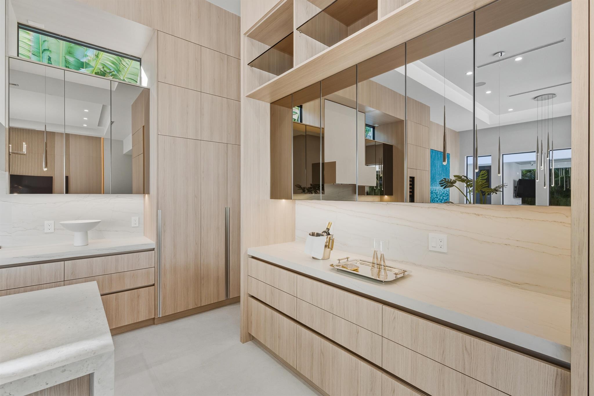 From the moment you step inside, it's clear this is no ordinary Mizner Park residence. A grand foyer, an impressive executive office, and a true first-floor primary suite set the tone for a home that feels equally extraordinary whether you're enjoying a quiet evening in or hosting an unforgettable night with friends. Sunlit interiors blur the line between indoors and out, yet retain an inviting warmth--perfect for a cozy movie night with candles glowing and slippers on. Thoughtfully designed for both everyday living and elevated entertaining, the home offers five ensuite bedrooms, including a sumptuous first-floor primary. Upstairs, four grand suites surround a spacious secondary living area, ideal for guests, family, or a private retreat. The open-concept great room flows --