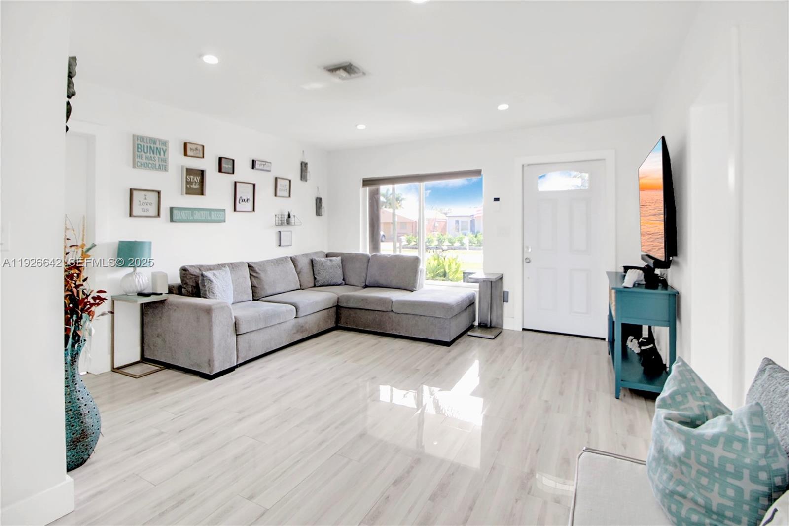 Beautifully updated 3-bedroom, 2-bath single-family home featuring a fresh exterior paint job and full impact windows and doors for peace of mind. Inside, you’ll find modern touches throughout, including soft-close cabinetry, sleek white countertops that match the bathrooms and window sills, and uniform tile flooring for a seamless look. Enjoy added style with custom gray blinds and barn-style closet doors, plus a unique retractable sunroof that brings in natural light at the touch of a button. This home blends comfort, durability, and contemporary design—move-in ready and made to impress.