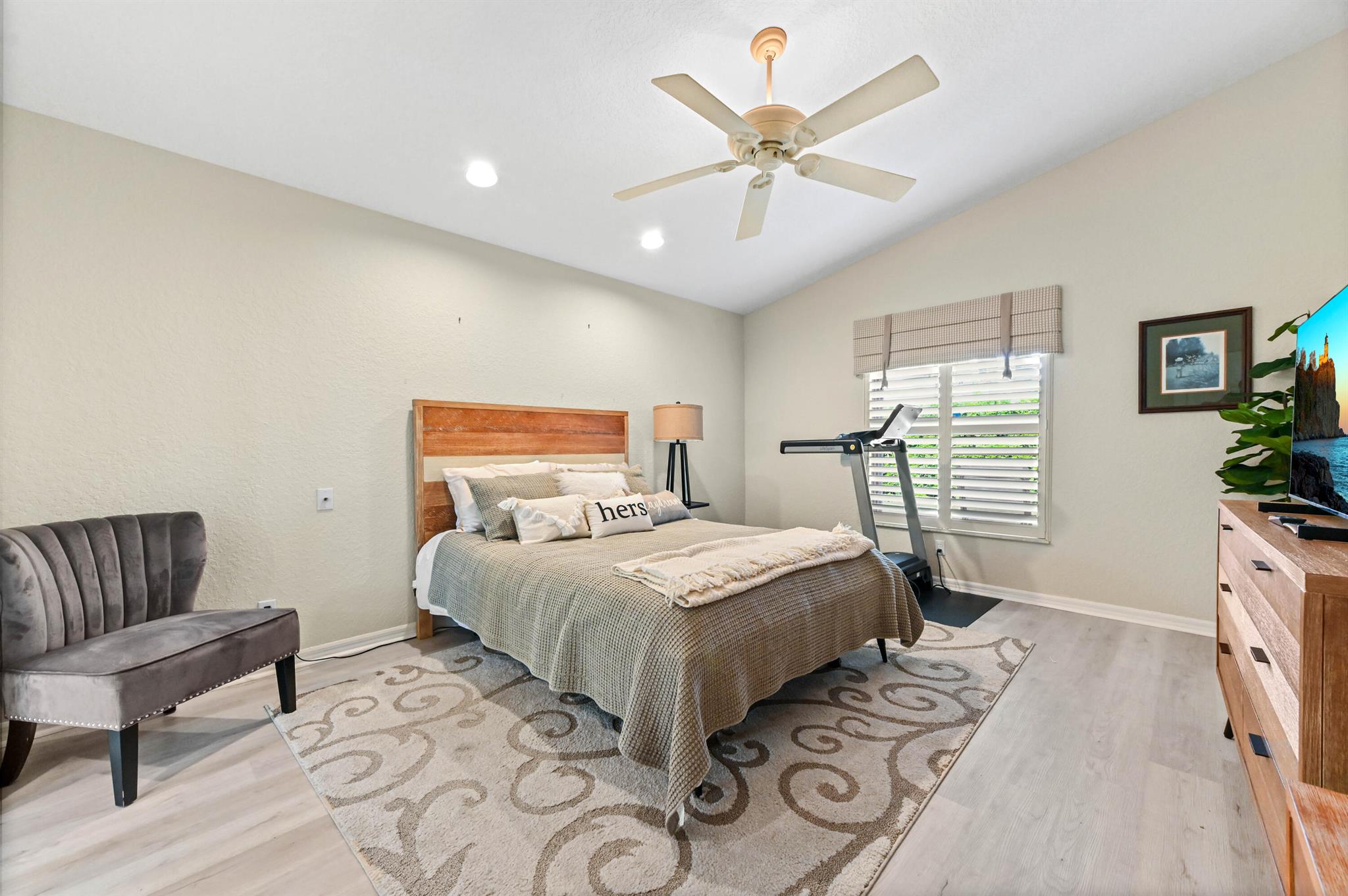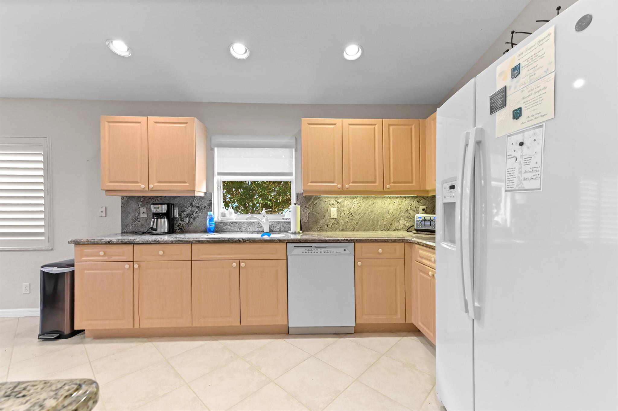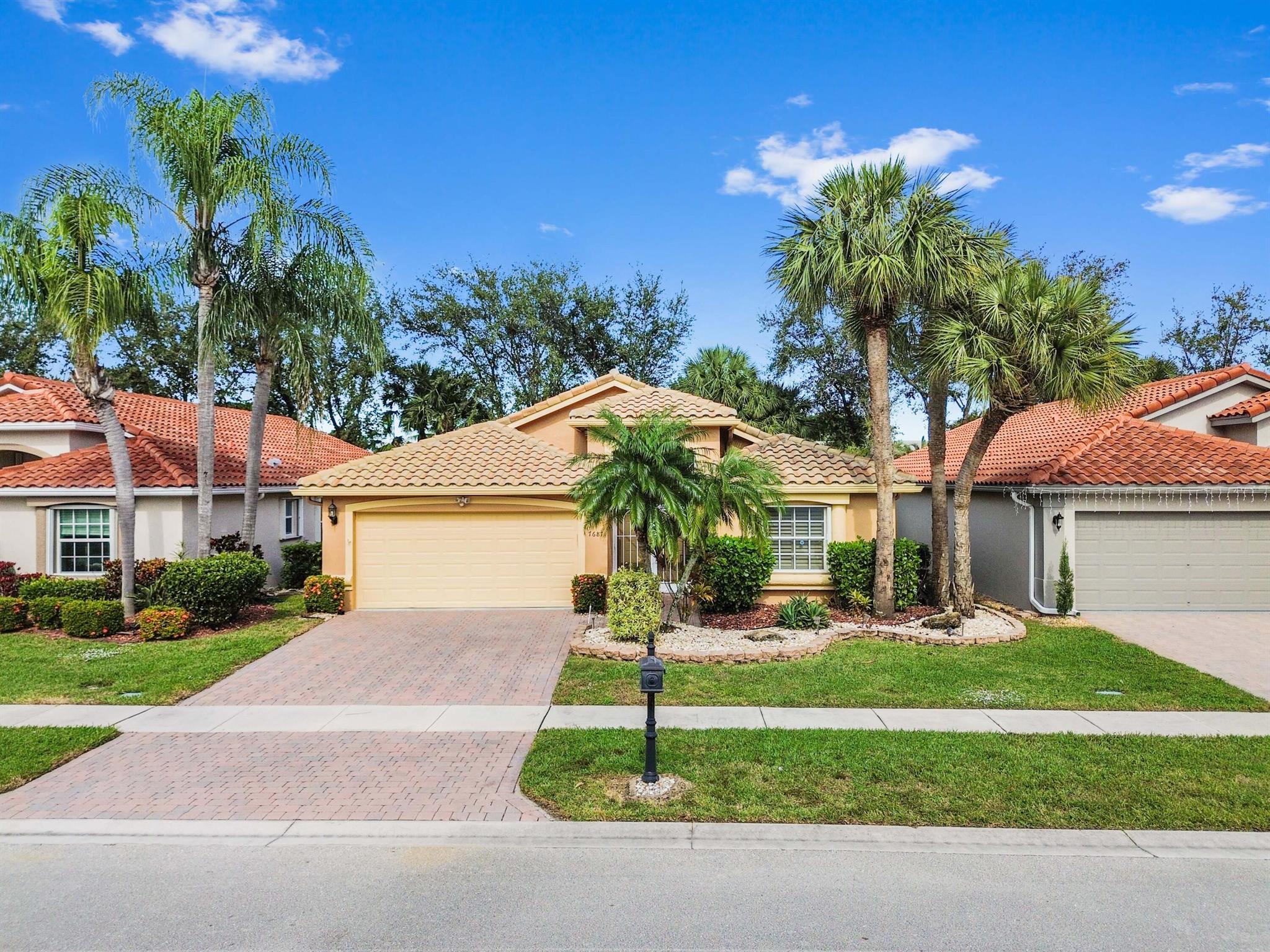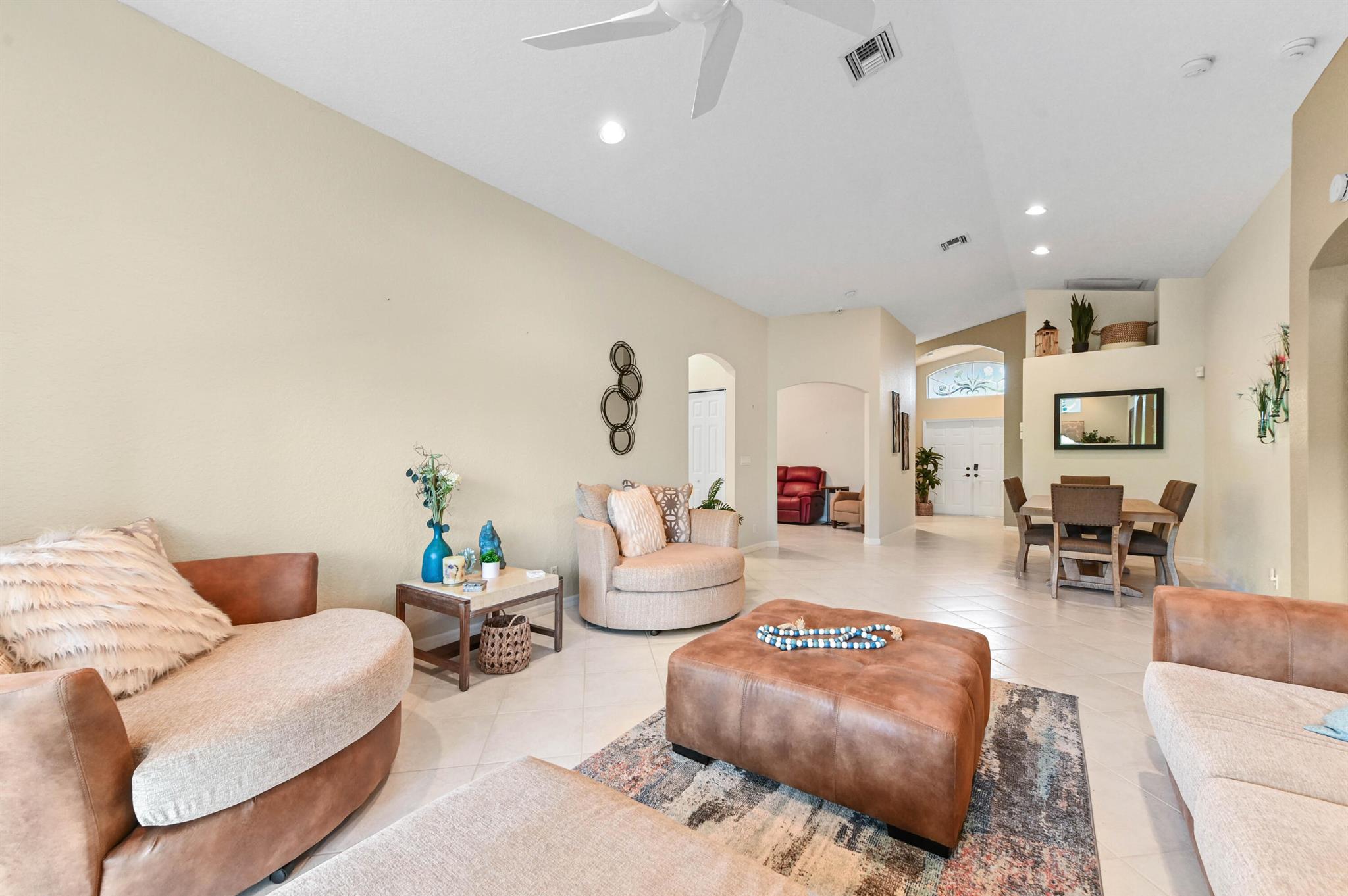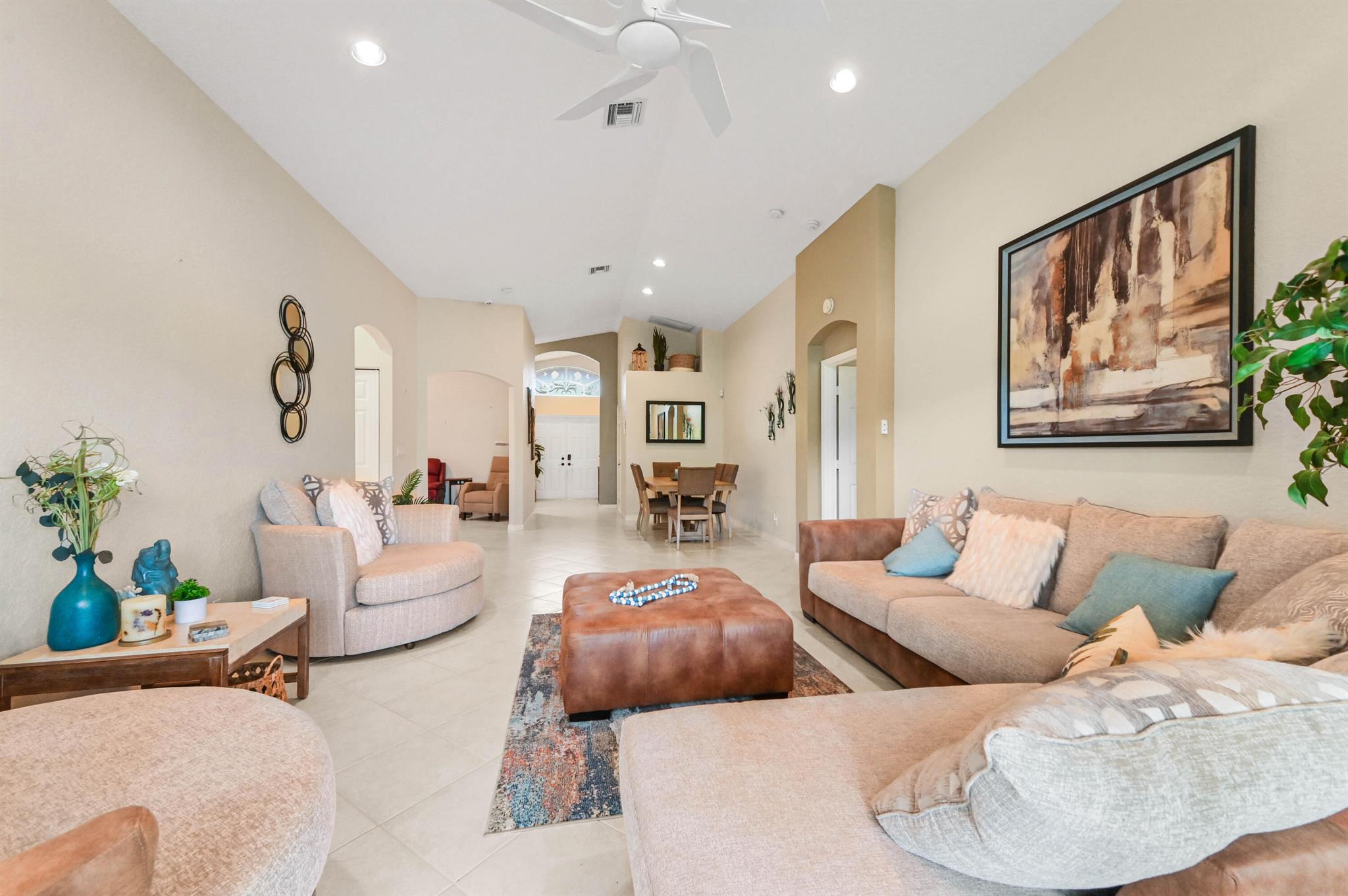Welcome home to this meticulously maintained sanctuary, where a manicured tropical landscape and paved driveway set the stage for elegant living. Step through the double-door entry into a bright, airy interior defined by soaring vaulted ceilings and pristine diagonal tile flooring that flows effortlessly through the main living areas. The open-concept living and dining room is bathed in natural light, highlighted by a stunning custom etched-glass transom window above the sliding doors that adds a unique touch of artistic flair to the space.