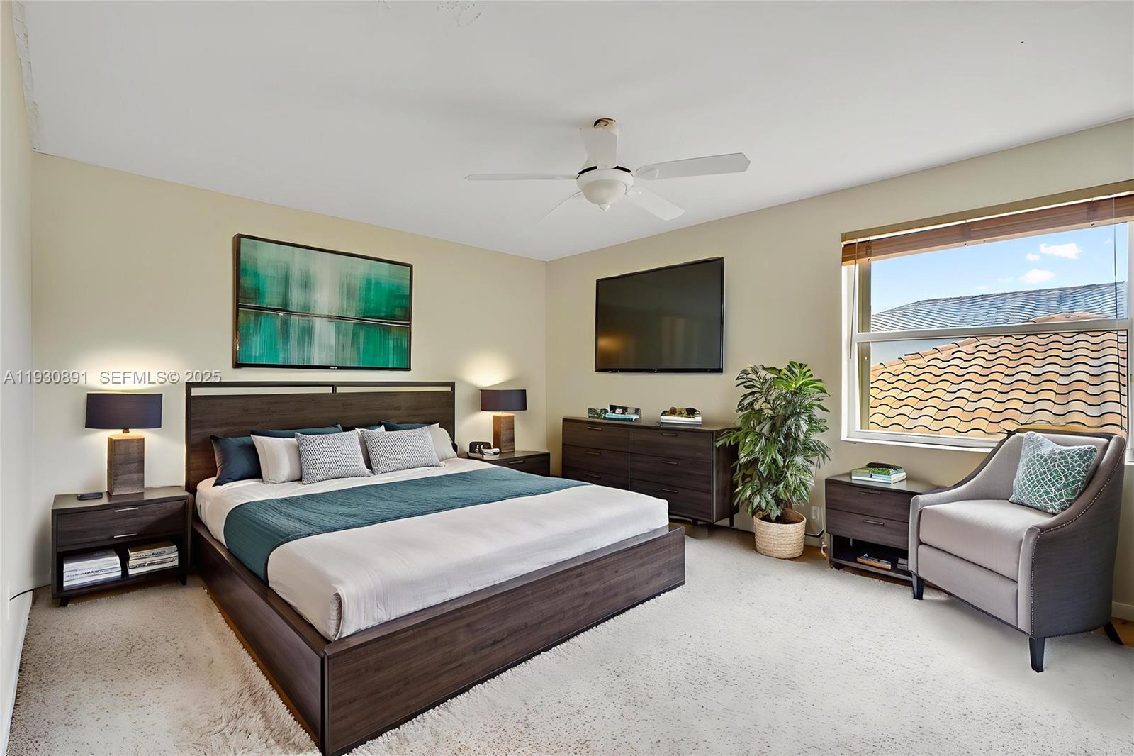 Enjoy your morning coffee with direct lake views from your private balcony in this stunning lakefront home located in Pembroke Pines. Offering approximately 3,400 square feet, this 4 bedroom, 3 bathroom residence features a bright, open floorplan with cathedral ceilings and expansive water views across the entire rear of the home. The kitchen offers real wood cabinetry, granite countertops, stainless steel appliances, and ample storage. A full bedroom and bathroom are conveniently located on the first floor. Upstairs includes a spacious loft, three generously sized bedrooms, and a primary suite with his and her walk in closets, along with two full bathrooms. The serene backyard is surrounded by beautiful nature and mature fruit trees, creating a peaceful lakeside retreat with breathtaking sunset views, ideal for relaxing or entertaining. Hurricane accordion shutters are installed on all windows and glass doors. The home includes a single car garage plus a two car garage currently converted into air conditioned living space, easily convertible back if desired. Located within the Towngate Master Association, residents enjoy resort style amenities including pools, basketball and tennis courts, playgrounds, and a clubhouse, with cable and internet included. No HOA approval required. Conveniently located near shopping, dining, parks, a nearby elementary school, and with quick access to I 75 and I 595, just 25 minutes to Fort Lauderdale, Miami airports, and the beaches