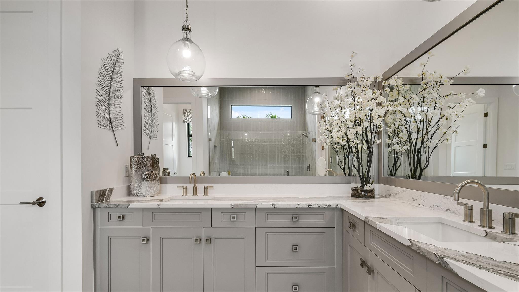 The Riley Floorplan at Mosaic is located on an oversized, west facing, preserve-view homesite, 3 bedroom, 3.5 bathrooms, and spacious flex room large enough to fit a full-sized pool table or home office. The Riley layout offers separate dining and living areas with an open flow, perfect for everyday living and entertaining. The kitchen includes white cabinets, GE Profile appliances, with wall oven and microwave combo, and a large island with quartz countertops that overlooks the main living area. Wood-look tile extends throughout the home for a clean modern finish. Expansive 10' corner sliders pocket fully into the wall, opening to the covered lanai that is pre plumbed for an easy outdoor kitchen. Photos of a decorated model home are for reference only. Actual home will differ.